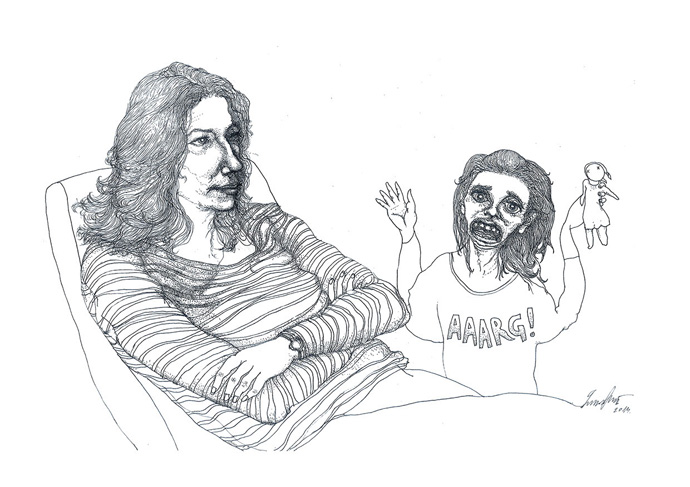 Dragan: I’m using the different kinds of pens on white large paper… sometimes I color them on photoshop and illustrator, but mostly I like them black and white.