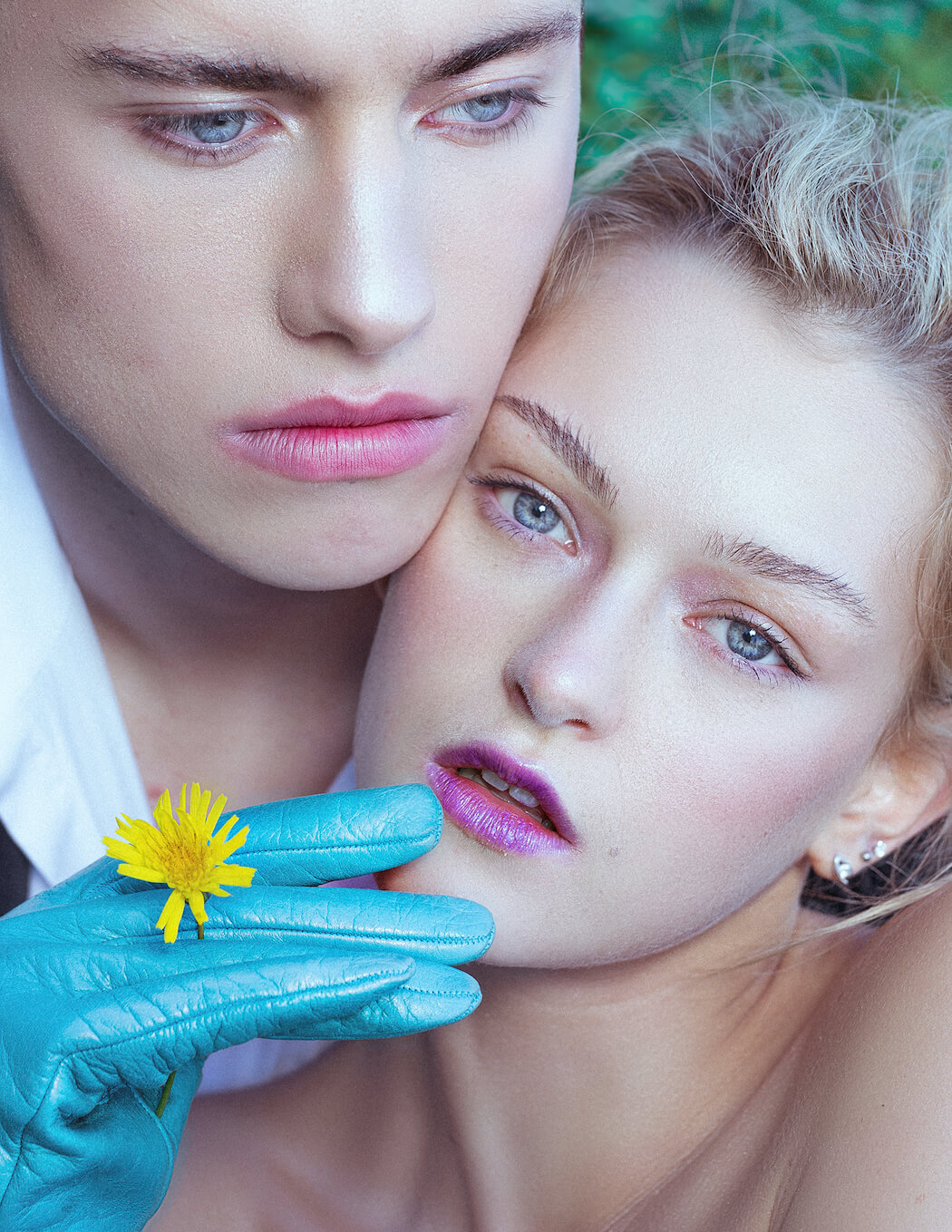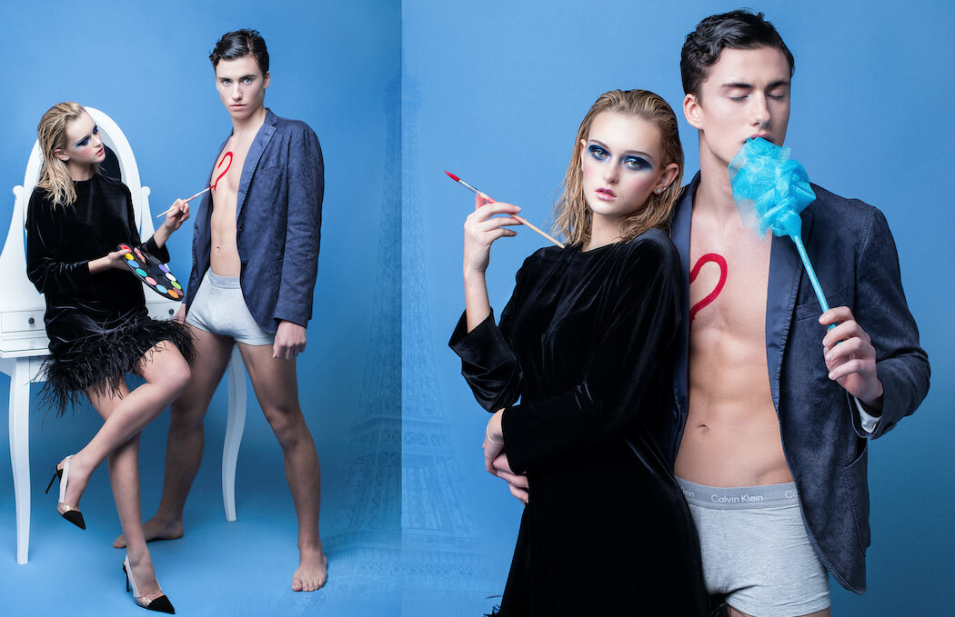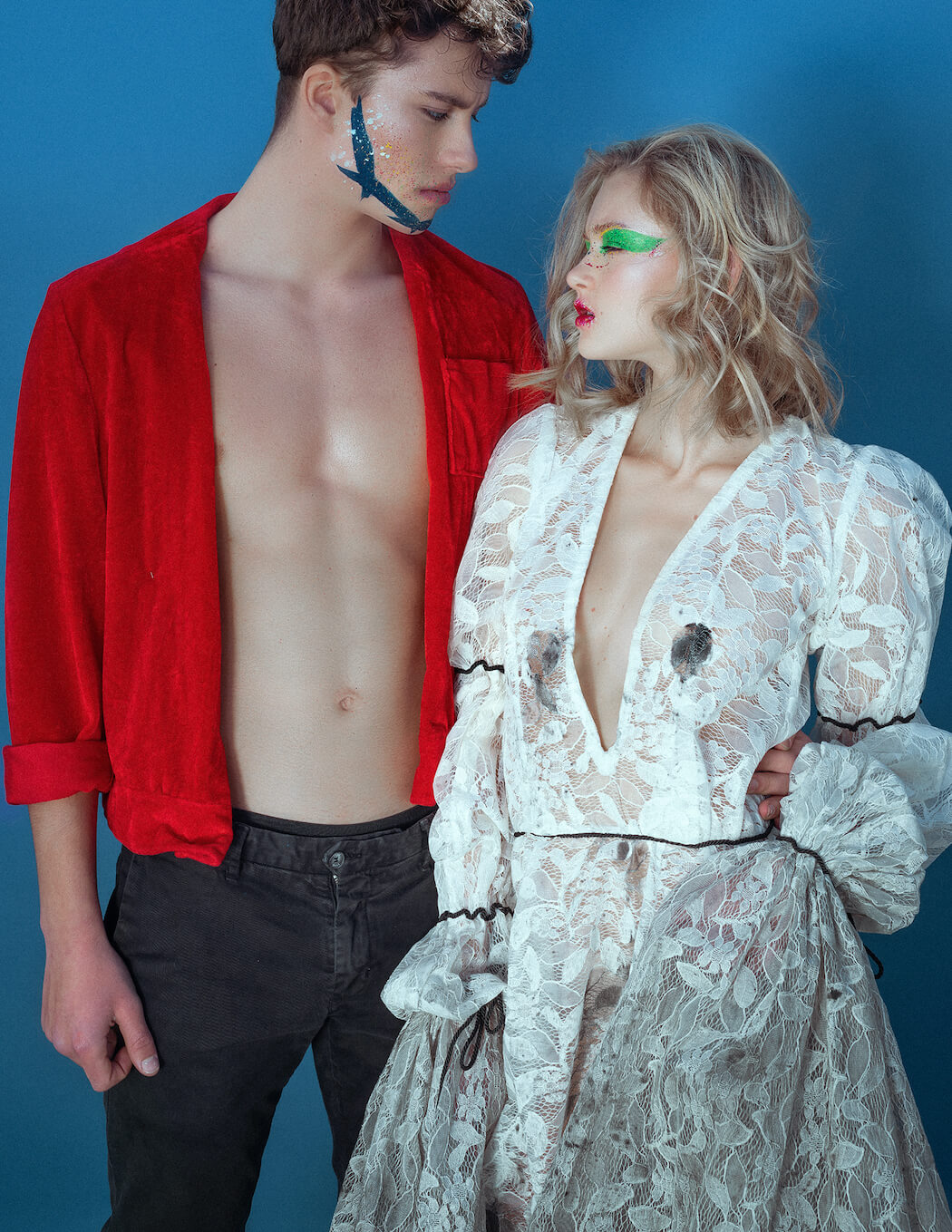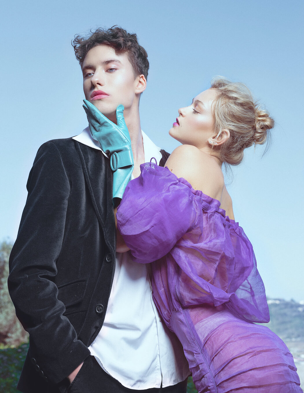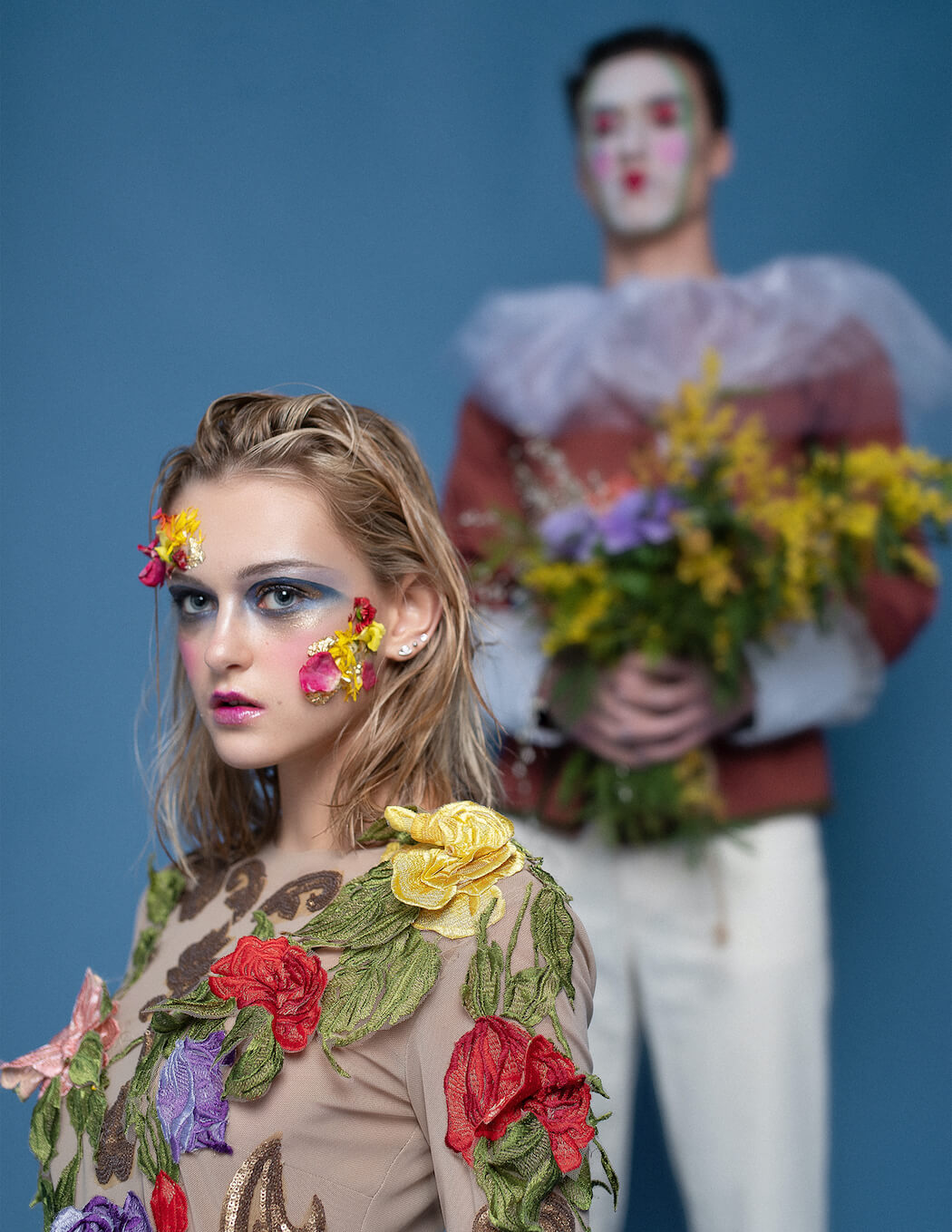 “In this editorial, we have represented some evolutions of a sentimental bond in a couple inspired by the works of Marc Chagall (1 set the walk, 2 set couple of lovers, 3 set newlyweds with Paris in the background, 4 the purple rooster) couples and love in one form of surreal romanticism, revisited and represented by us both photographically through the poses of the models and through digital elements such as the “moon” and the “Eiffel tower” and through colours such as never uniform blue, strongly recurring in the artist’s works and others elements such as flowers and nature. In the 4 sets, the sentimental bond has evolutions, and passes from a state of obsession and infatuation to a state of belonging and then changes again, and alternates in a pair of young lovers (models), one for the other and/or the other way around, recognizing an almost inevitable unconscious path, between euphoria and pain, visible in the expressions and attitudes, in front of the person we are strongly attracted to. ”