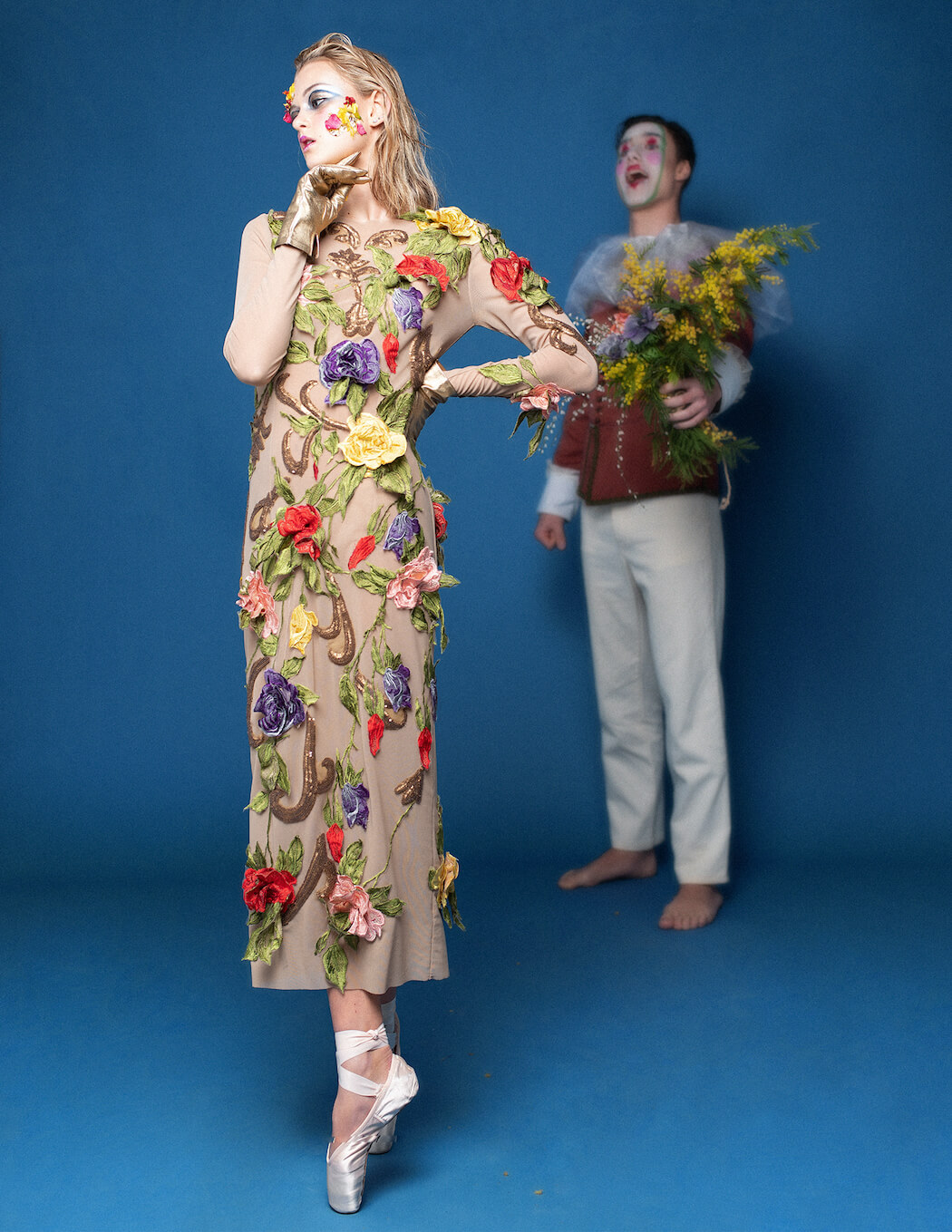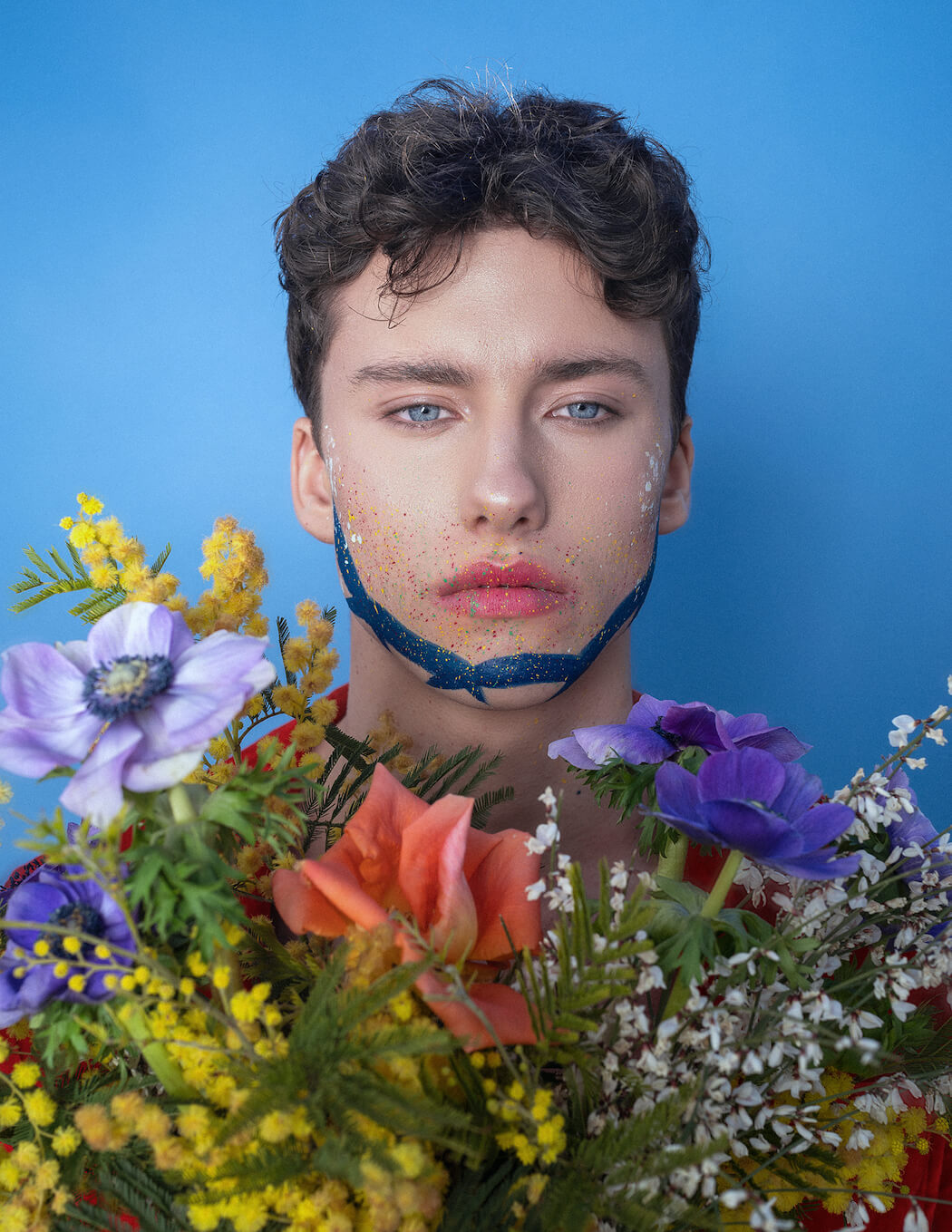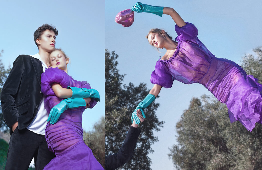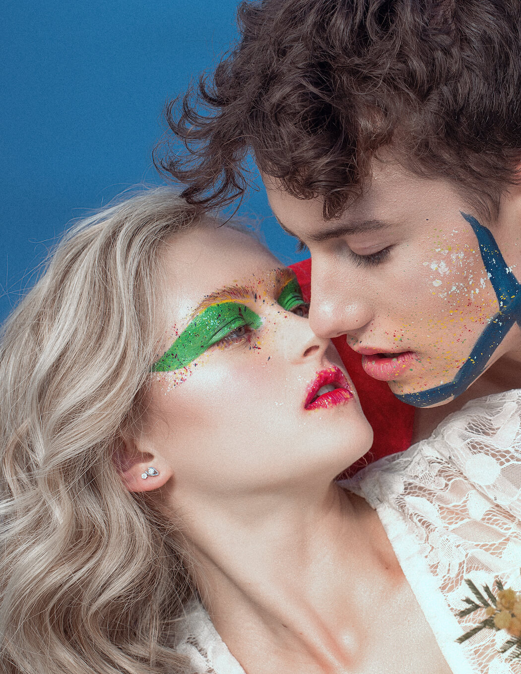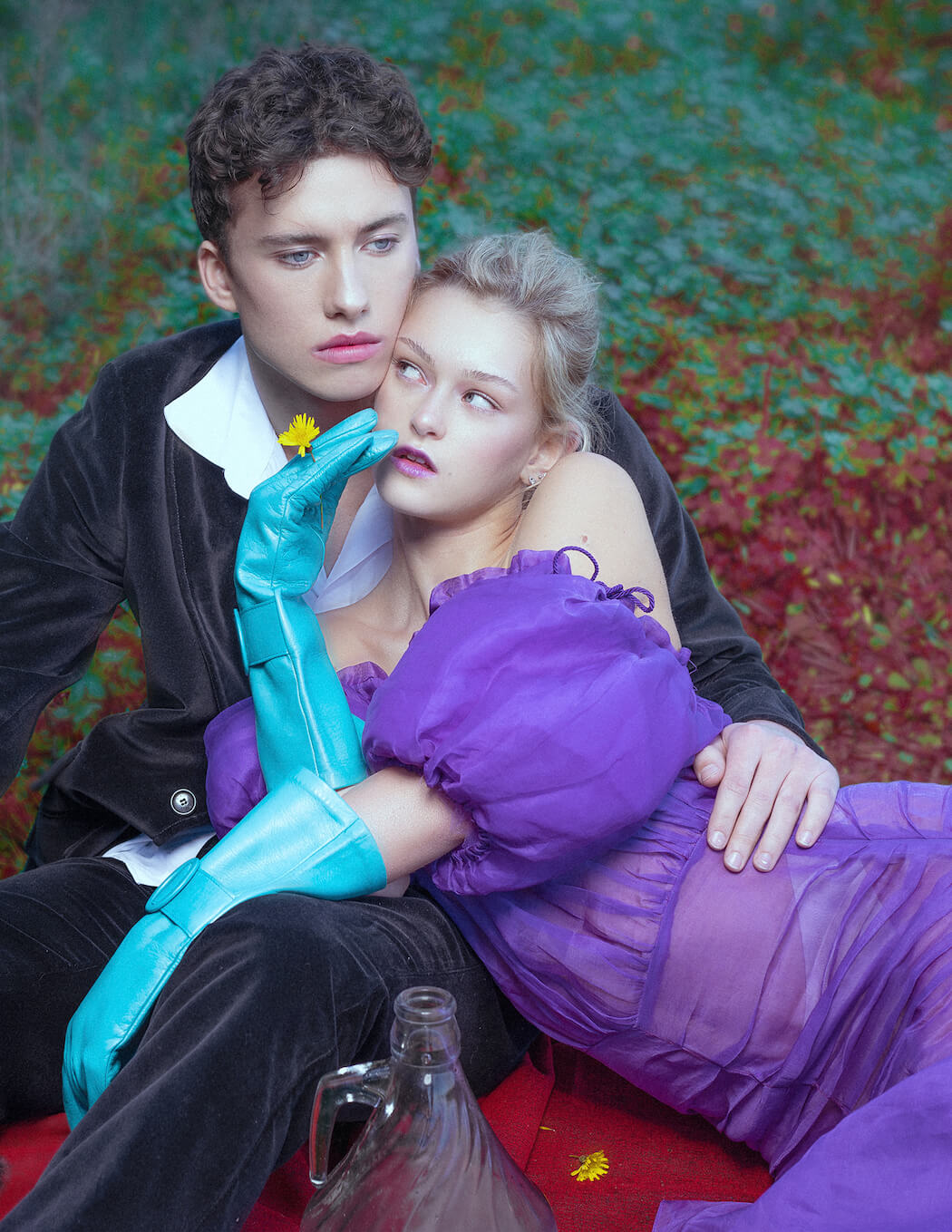 “In this editorial, we have represented some evolutions of a sentimental bond in a couple inspired by the works of Marc Chagall (1 set the walk, 2 set couple of lovers, 3 set newlyweds with Paris in the background, 4 the purple rooster) couples and love in one form of surreal romanticism, revisited and represented by us both photographically through the poses of the models and through digital elements such as the “moon” and the “Eiffel tower” and through colours such as never uniform blue, strongly recurring in the artist’s works and others elements such as flowers and nature. In the 4 sets, the sentimental bond has evolutions, and passes from a state of obsession and infatuation to a state of belonging and then changes again, and alternates in a pair of young lovers (models), one for the other and/or the other way around, recognizing an almost inevitable unconscious path, between euphoria and pain, visible in the expressions and attitudes, in front of the person we are strongly attracted to. ”