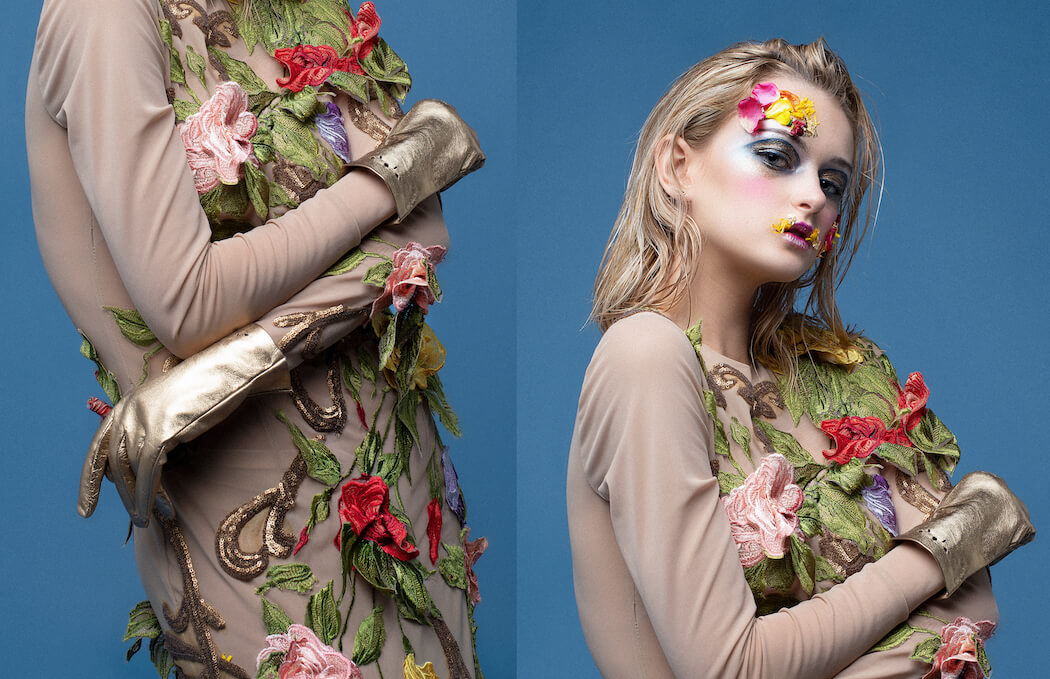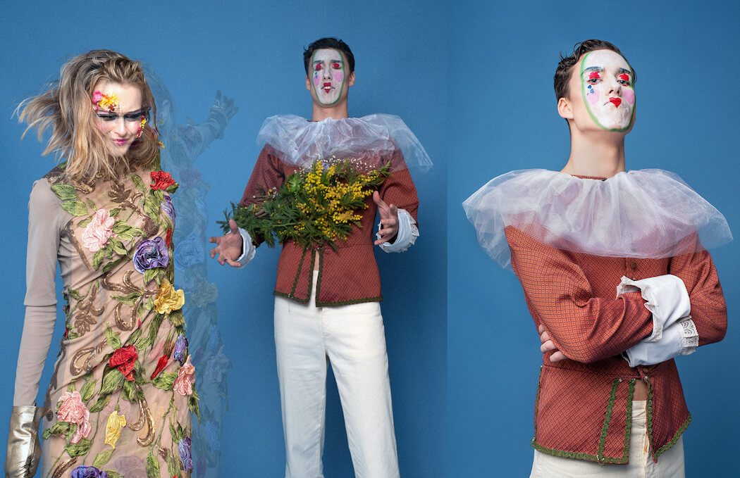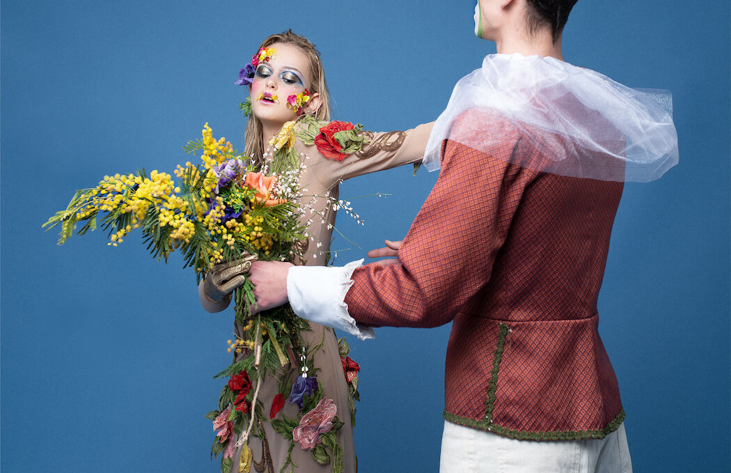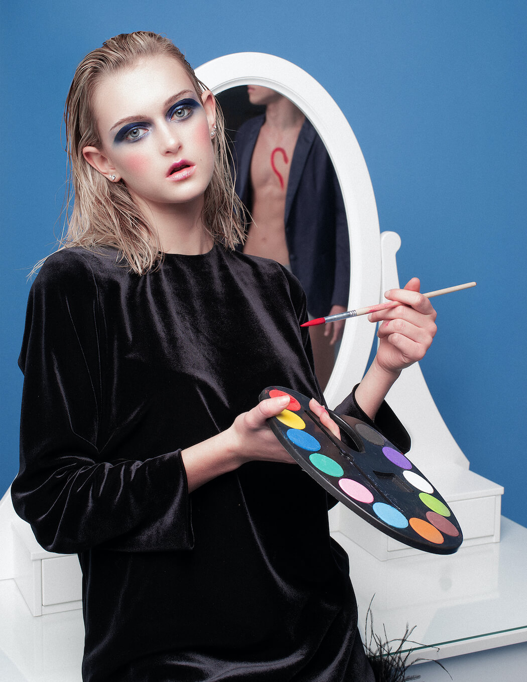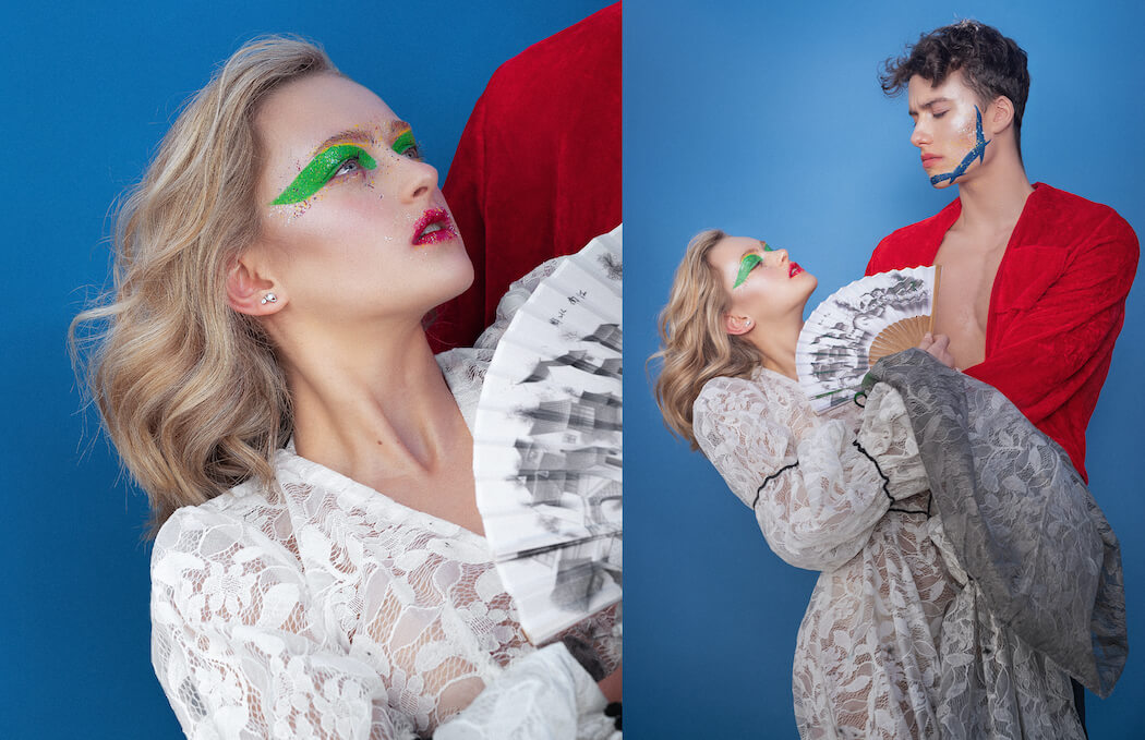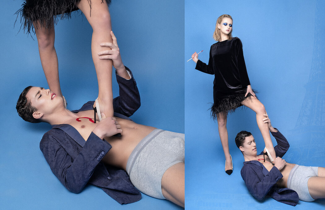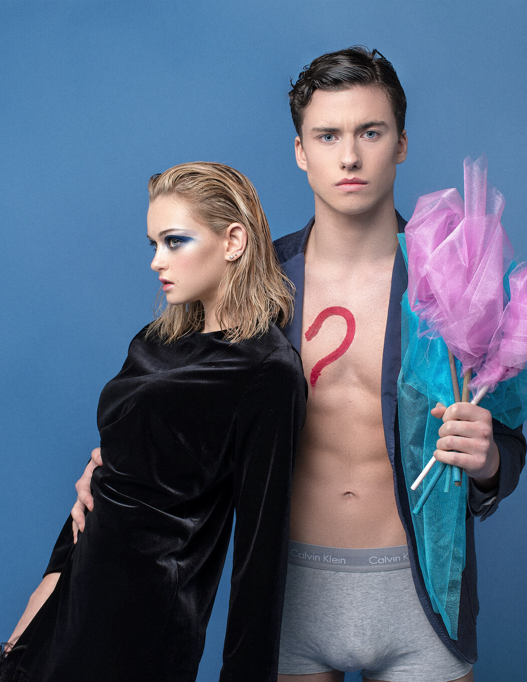 “In this editorial, we have represented some evolutions of a sentimental bond in a couple inspired by the works of Marc Chagall (1 set the walk, 2 set couple of lovers, 3 set newlyweds with Paris in the background, 4 the purple rooster) couples and love in one form of surreal romanticism, revisited and represented by us both photographically through the poses of the models and through digital elements such as the “moon” and the “Eiffel tower” and through colours such as never uniform blue, strongly recurring in the artist’s works and others elements such as flowers and nature. In the 4 sets, the sentimental bond has evolutions, and passes from a state of obsession and infatuation to a state of belonging and then changes again, and alternates in a pair of young lovers (models), one for the other and/or the other way around, recognizing an almost inevitable unconscious path, between euphoria and pain, visible in the expressions and attitudes, in front of the person we are strongly attracted to. ”