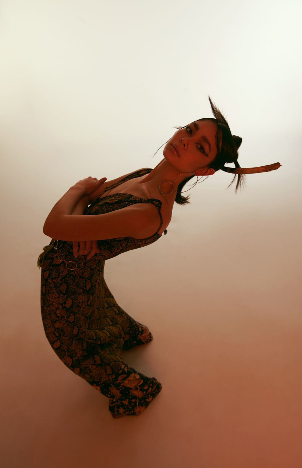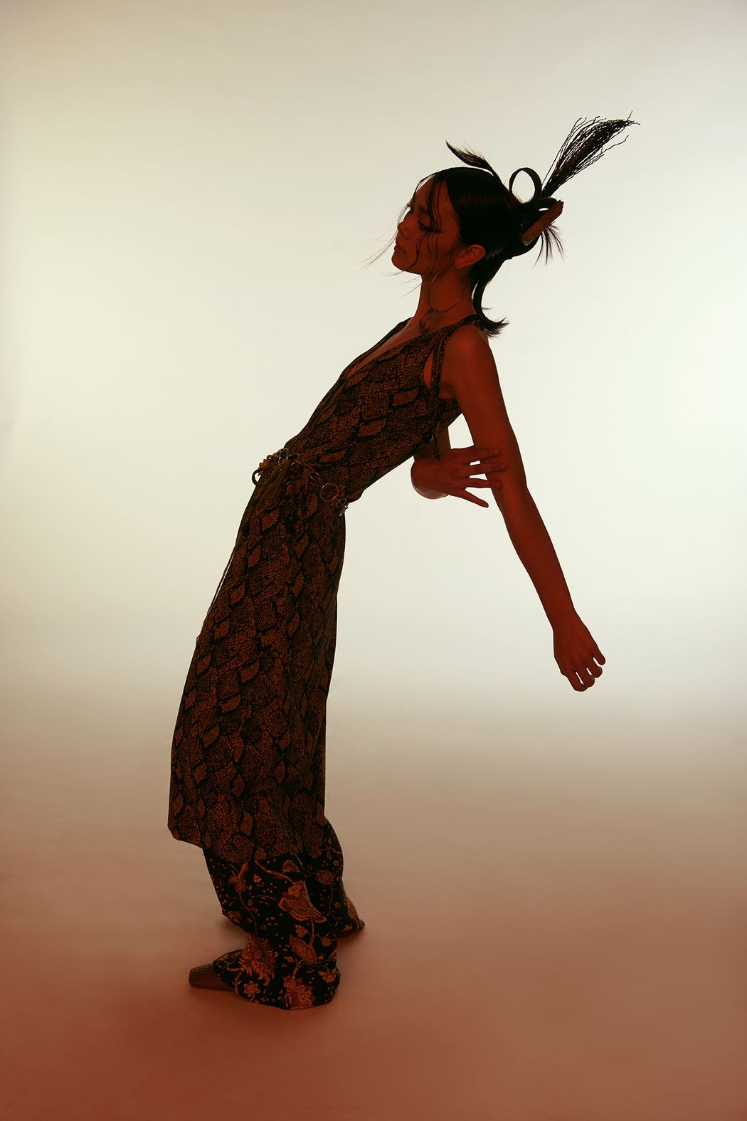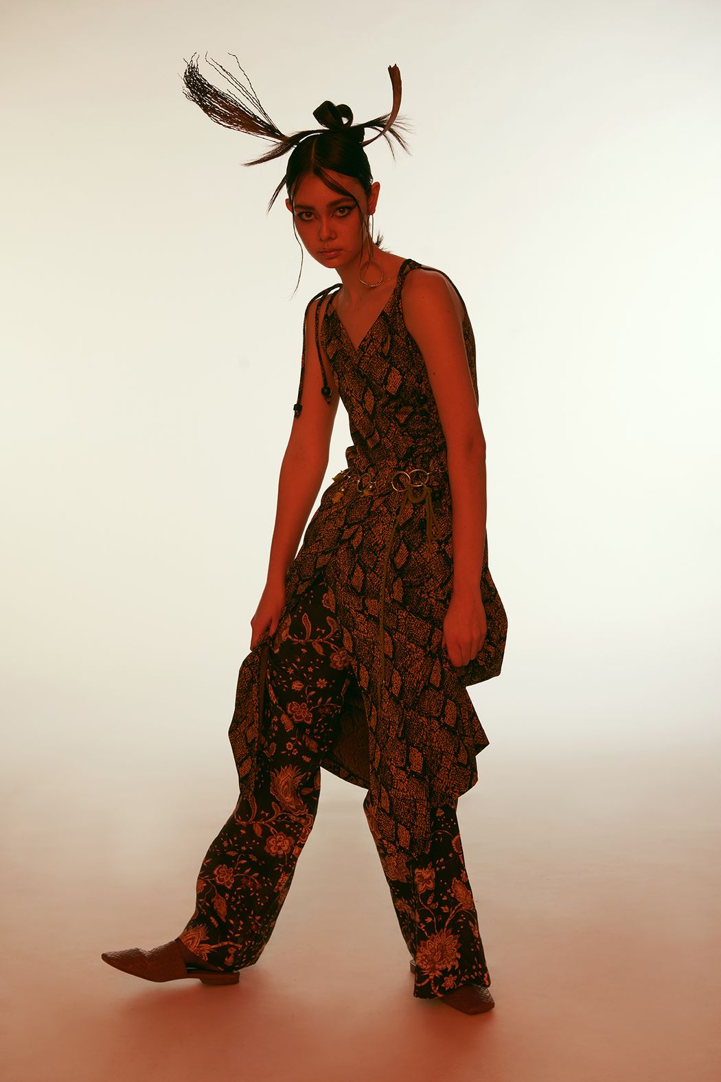The editorial is inspired by drought plants and spring. We use animals prints & floral patterns to match with different outfits. Also focus on fabric, such as suede & chiffon, to show the layering and styling. In the art direction, we chose dried plants to create the mood & improve the contrasts of textures.