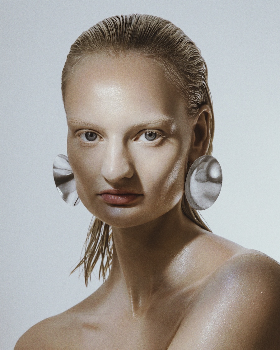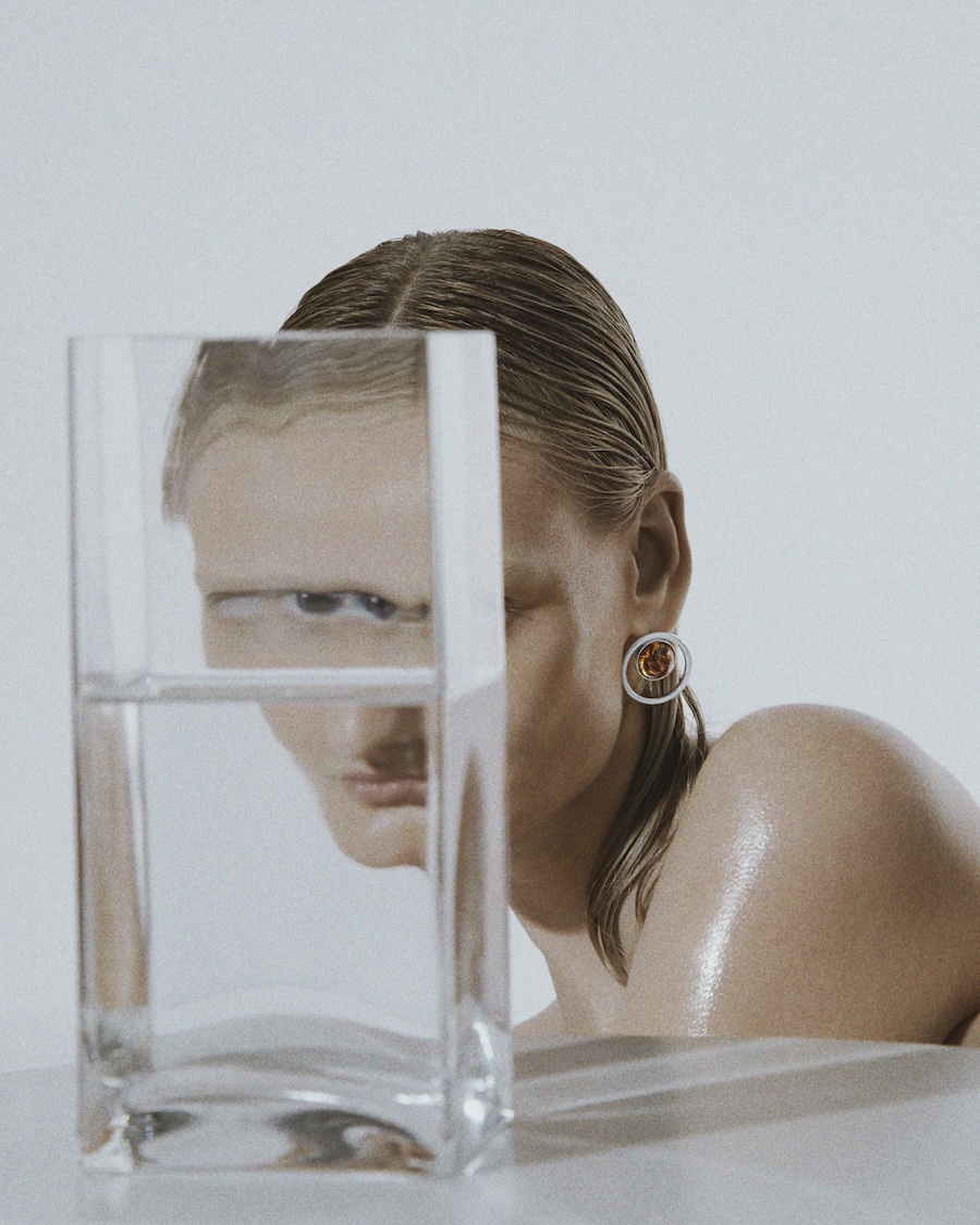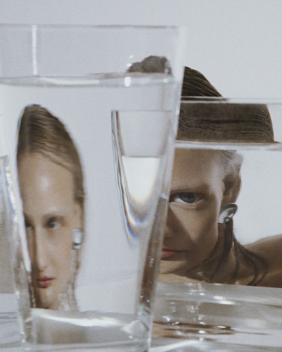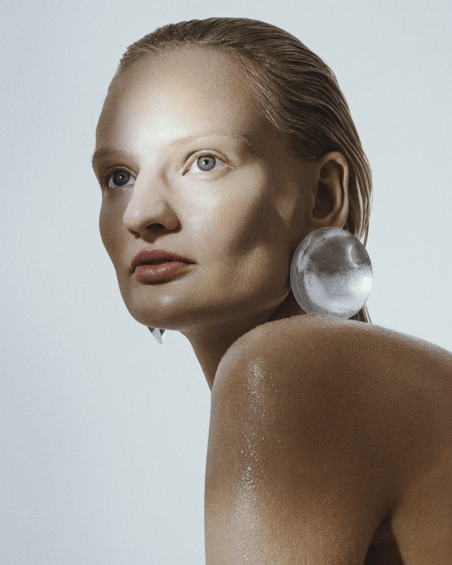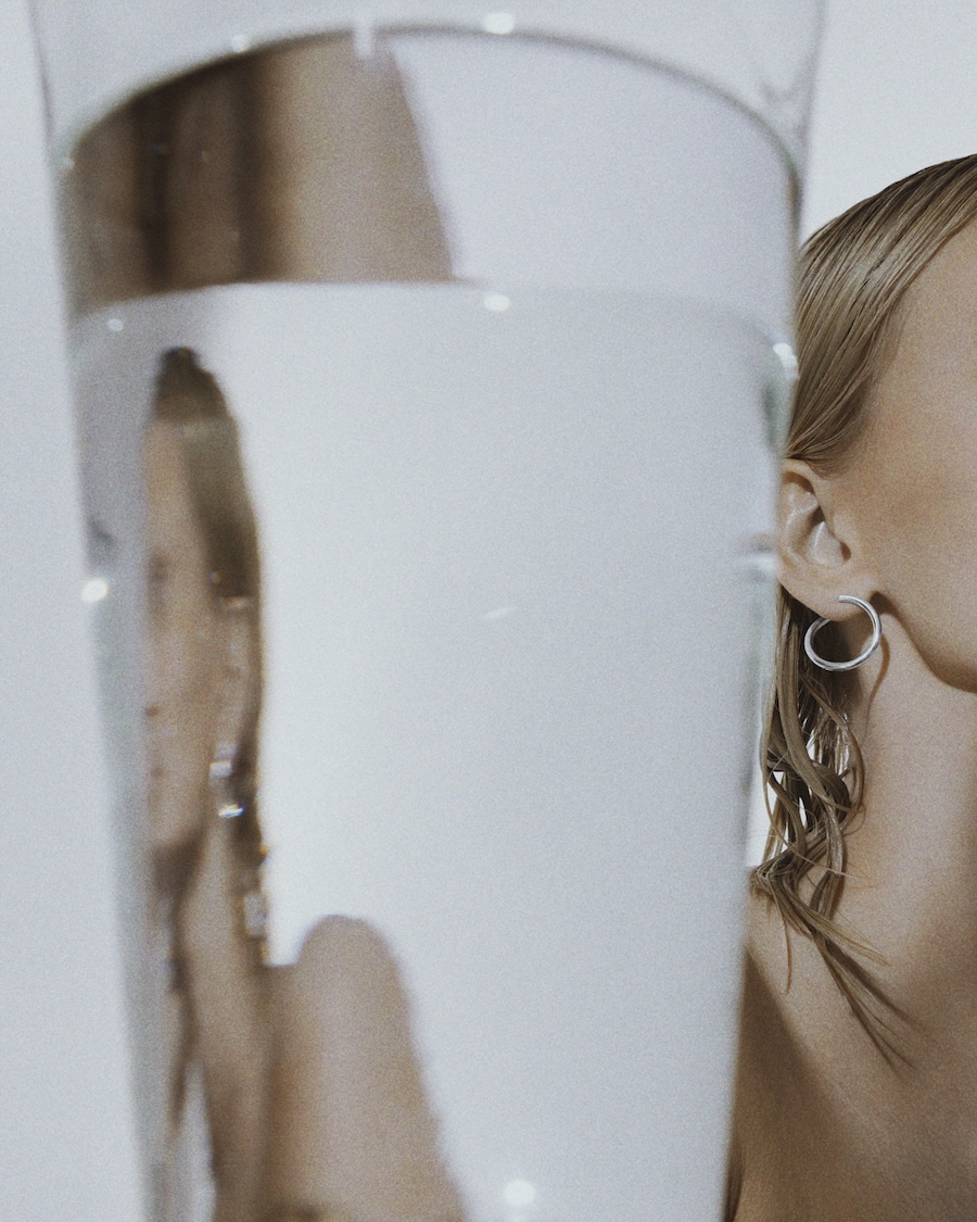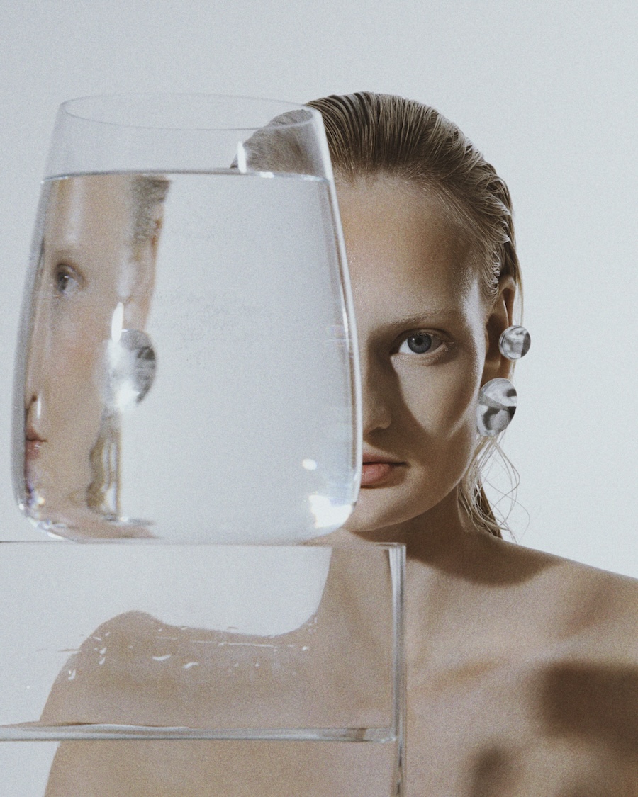 A KALTBLUT exclusive. DRYP is an editorial created in close collaboration with jewellery designer Caroline Ohrt & photographer Kasper Servé. The project explores the relationship between light, water and form, and how space dissolves and re-emerges through moisture, reflections and transparent surfaces. Water operates both as material and method: droplets and glass distort space and the body, interrupting the gaze so that form is not only seen, but physically perceived.