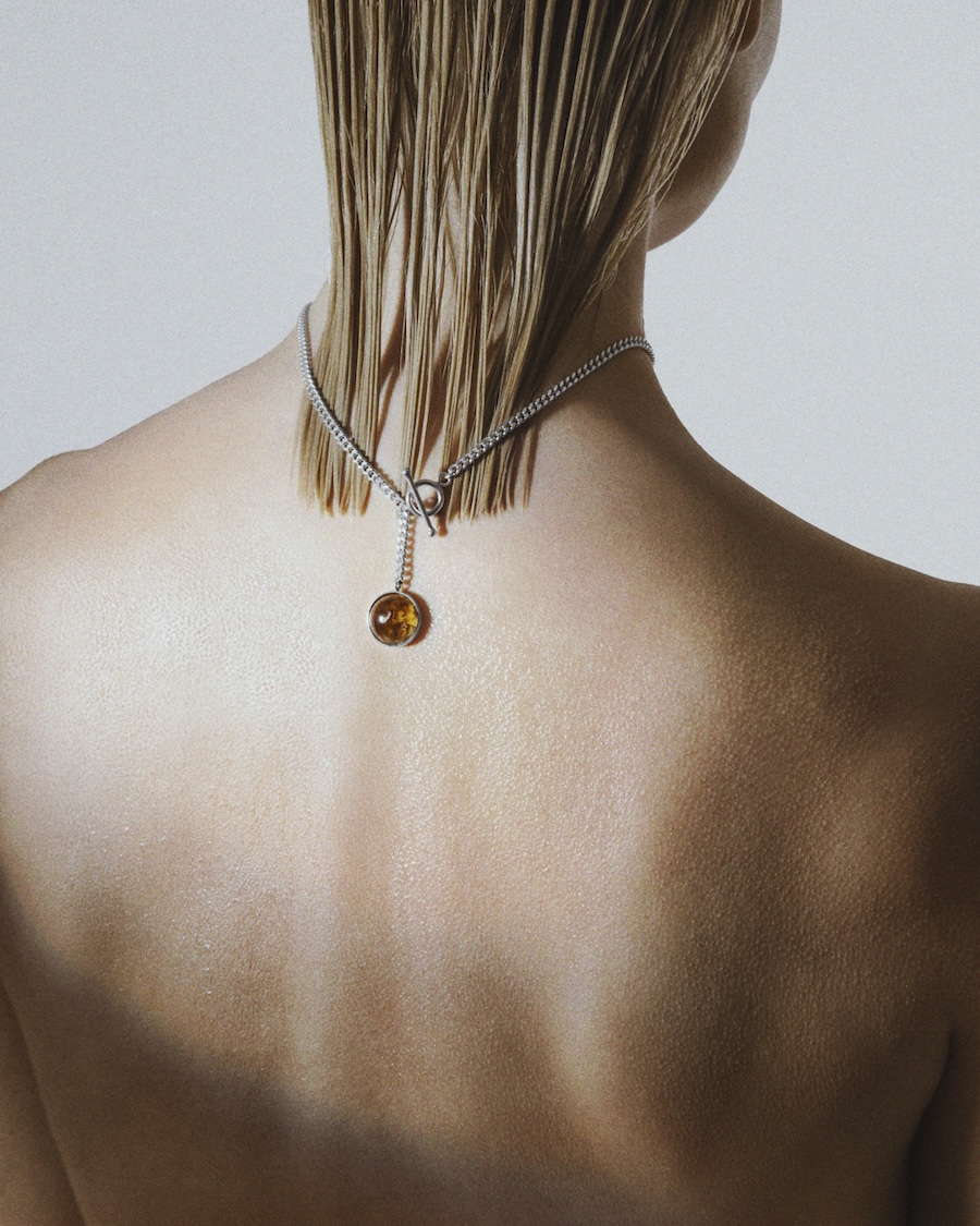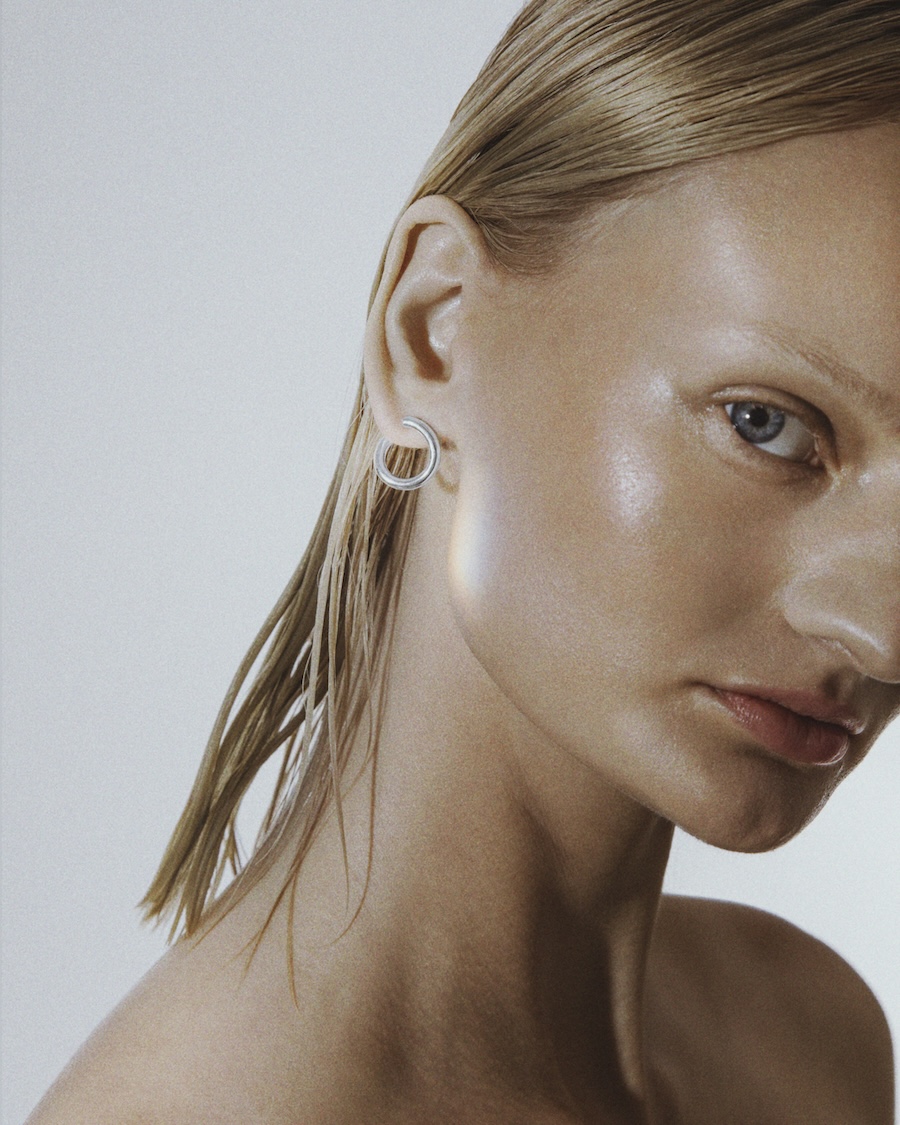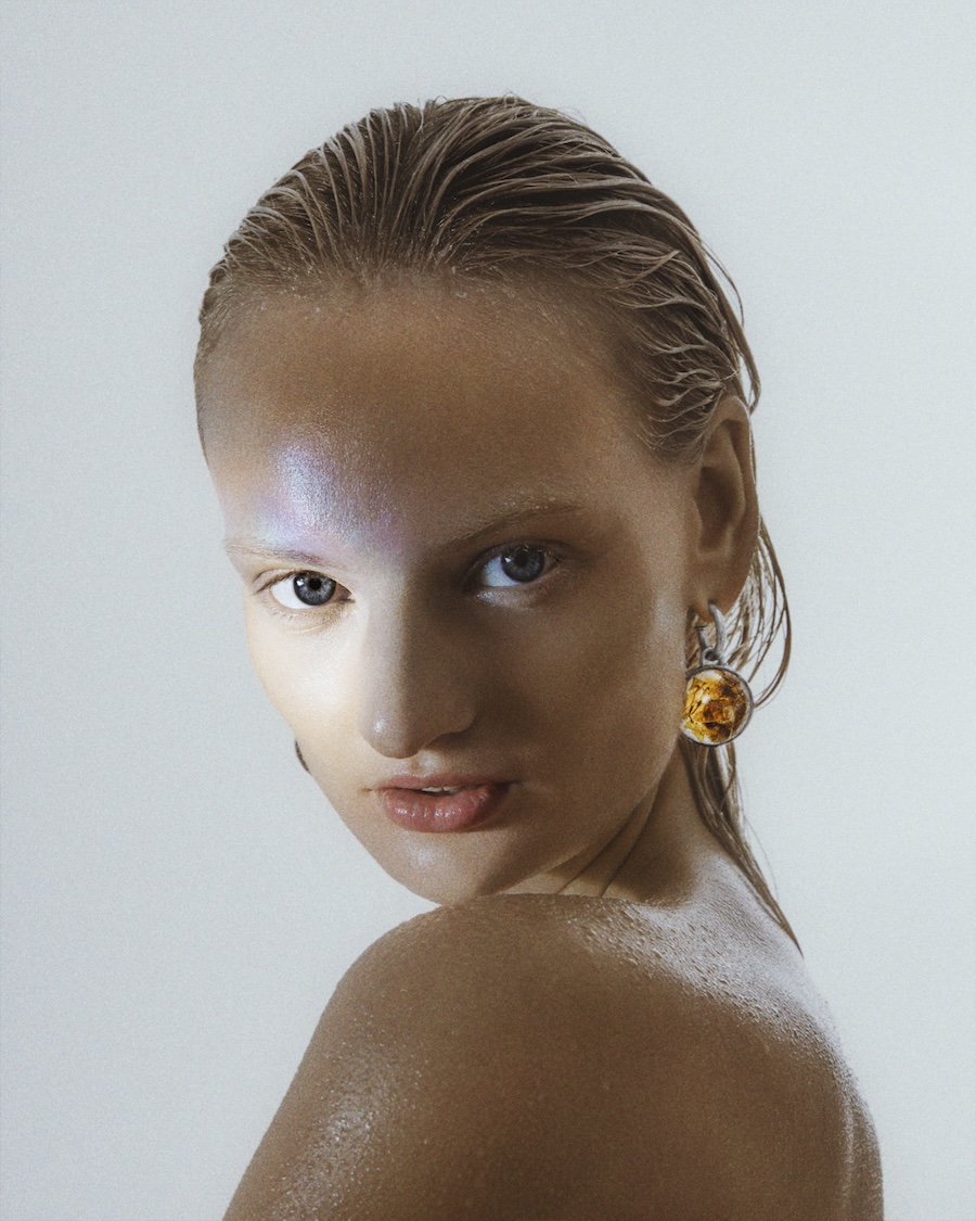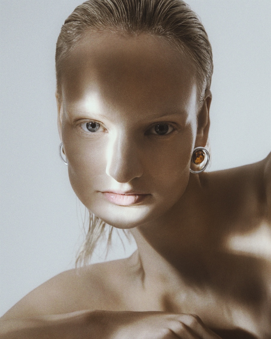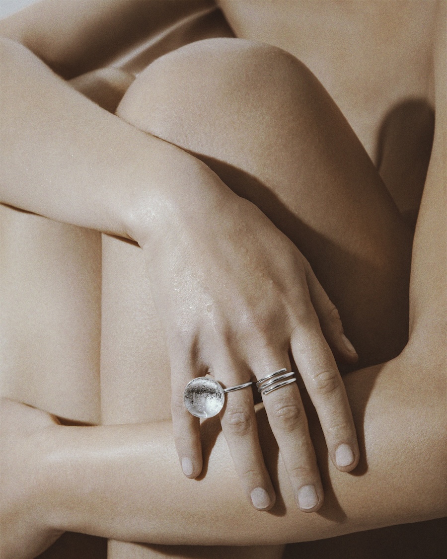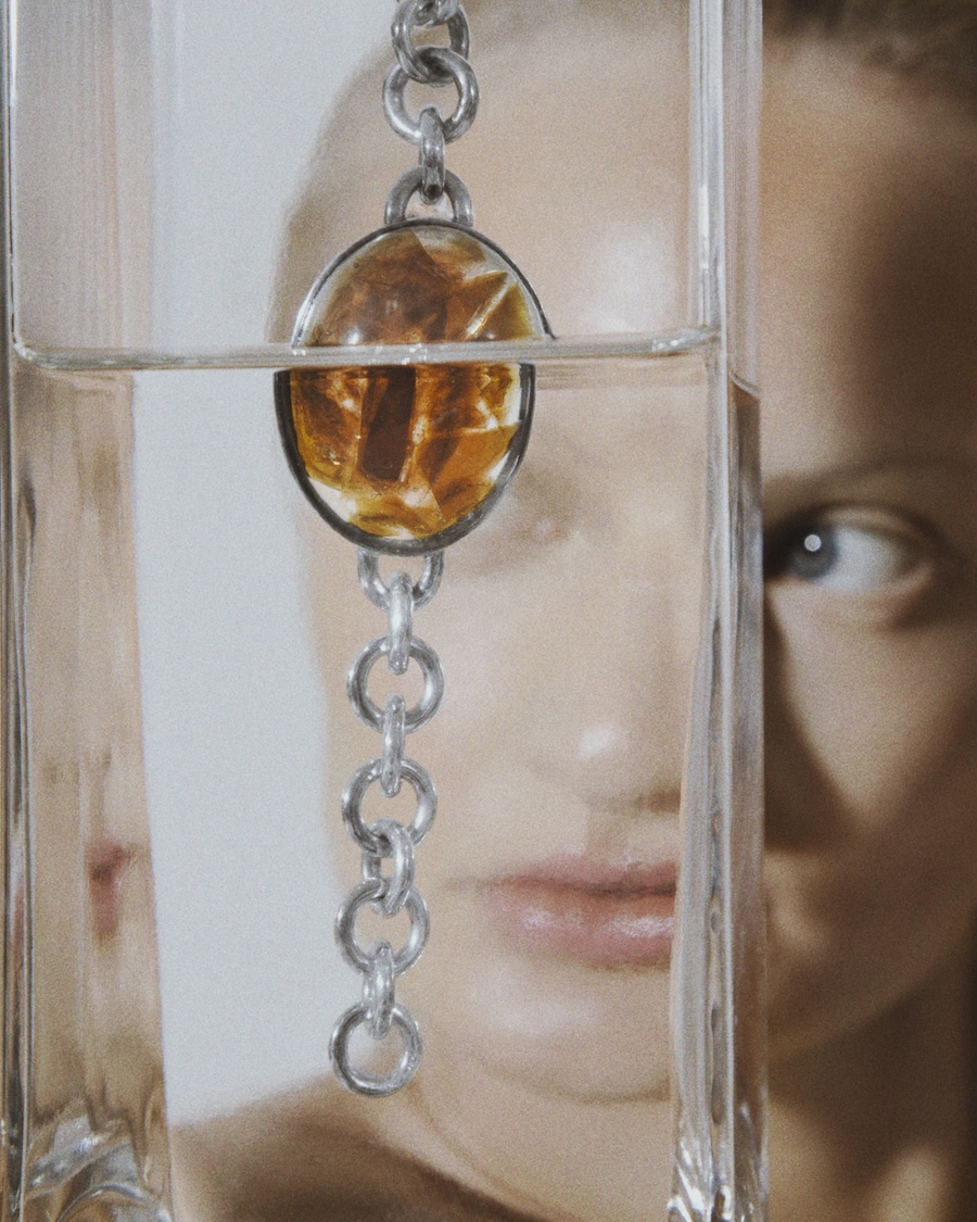 The jewellery functions as a transformative element, where traditional craftsmanship is shaped through pressure, erosion and refinement, spatial perception is constructed through light, refraction and moves between the clinical and the organic, allowing the model and the objects to exist in a fragile state of transition.