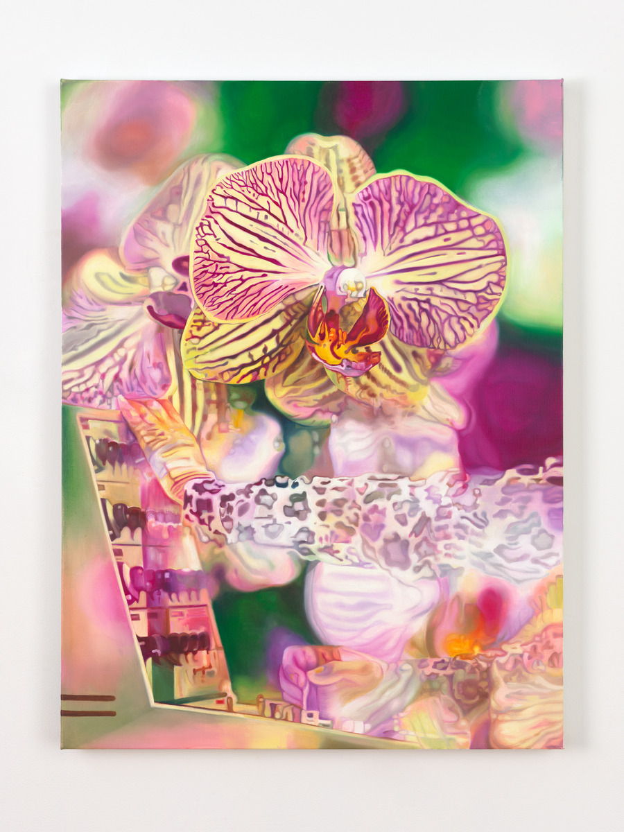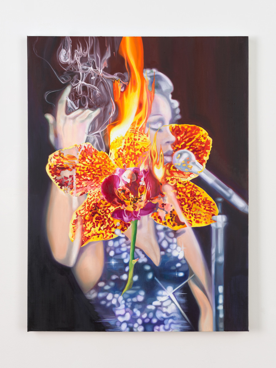 Dehne’s paintings serve as a seductive dance of themes—beauty, attraction, sexuality, femininity, and more. Petals unfold with sensuous abundance, and hands meld into the floral forms, personifying the orchids in their purest, most alluring state. Yet, beneath this allure lies a rich complexity. In Baby’s on Fire, inspired by a Brian Eno song, a vibrant orchid ignites against the profile of the iconic Donna Summer, merging passion and chaos, vitality and tranquillity. This juxtaposition challenges us to embrace life’s dualities—glamour and tumult, creation and destruction—proposing that opposing forces can indeed coexist.