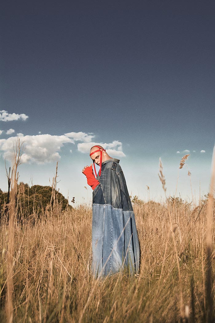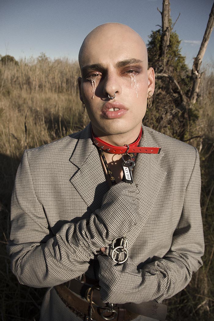 A KALTBLUT exclusive by Flama Flamarique. A photographer based in Barcelona. Model is Flavio Sideri Ruiz. Makeup by Alice Martos. Styling by Pedro Perez. “We wanted to talk about the suffering in the beauty of life. With the colours of the clothes, the feather and the acting of the model represent concepts like prison and liberty, the living and the dependency. With the collaboration of Brain and Beast and Blend Showroom representing the brands: Andres Zurru, Pablo Erroz and Lzo Martinez.”