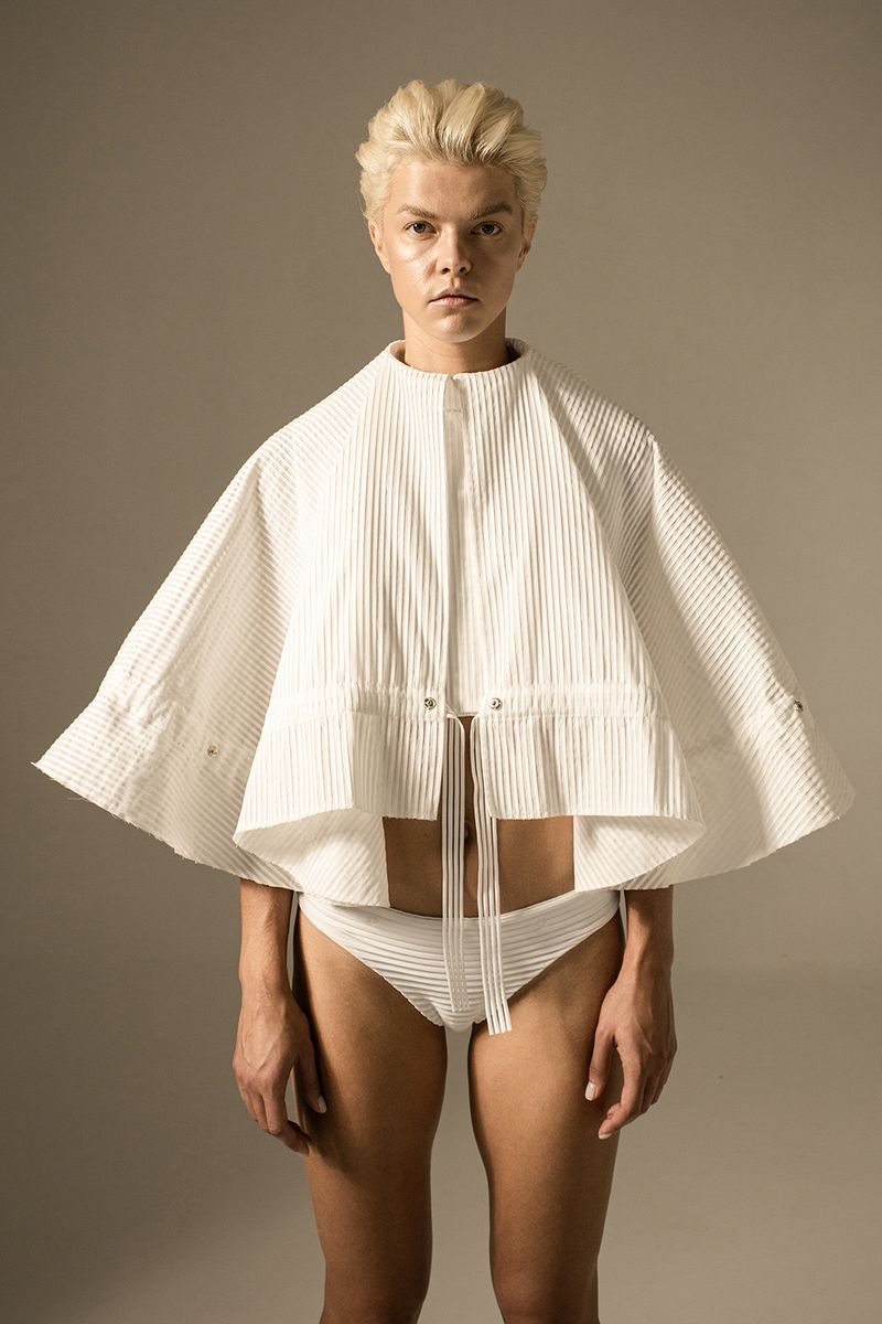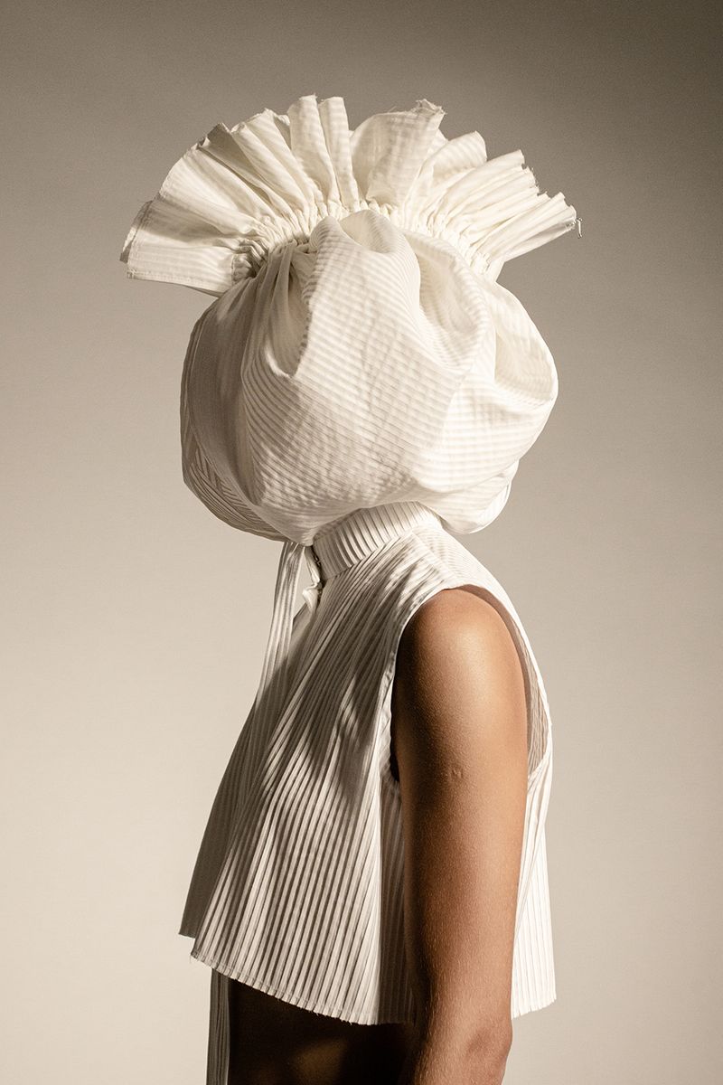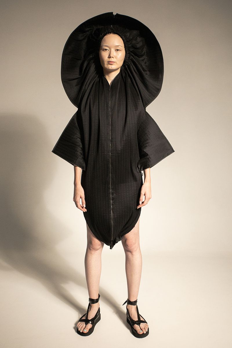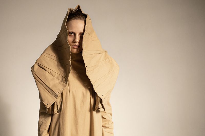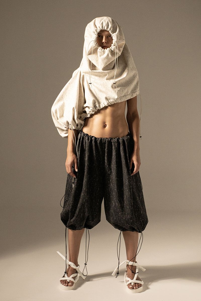 In DZHUS SS22 collection of multi-purpose clothing and accessories, Irina Dzhus ironises equally the established stereotypes about human appearance and exaggeratedly optimistic new trends. DZHUS juxtaposes empowerment to the body cult in symbolically sexualised silhouettes featuring grotesque proportions. Exhibitionism coexists with introversion in all-covered outfits showing surreal, anatomic-looking details while being modified. While design of collars and pockets refers to breasts’ shape, pleated wig-like hoods are an allusion to hair obsession in the mass culture.