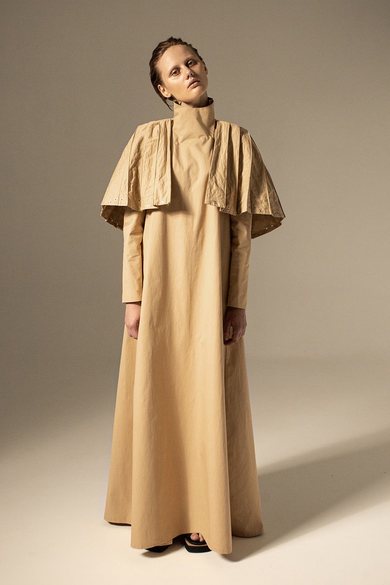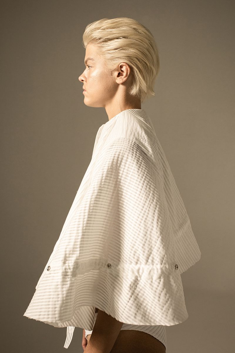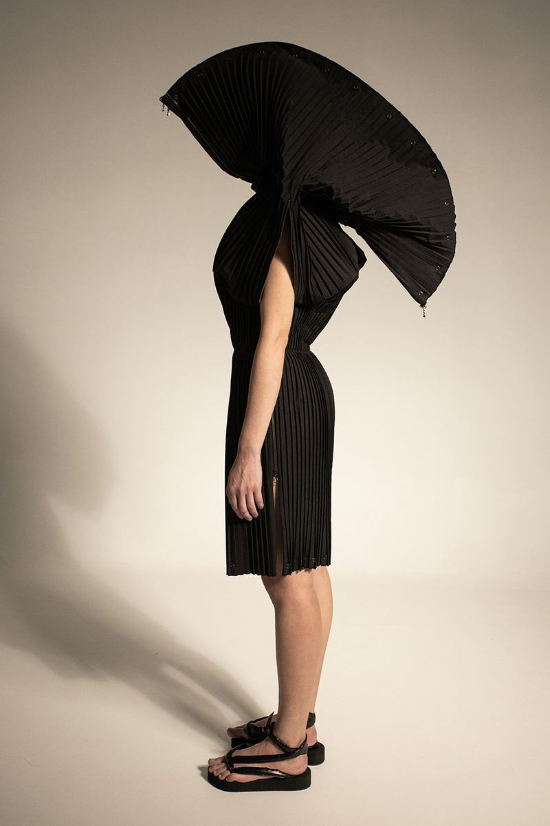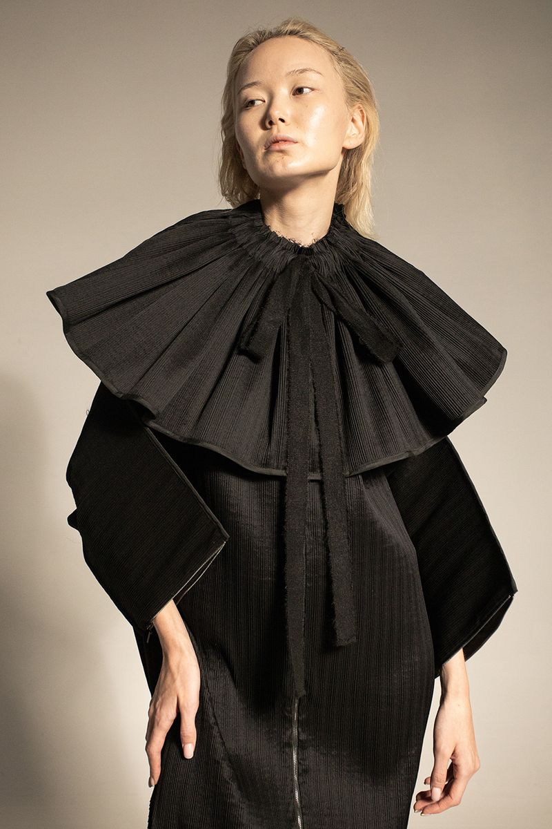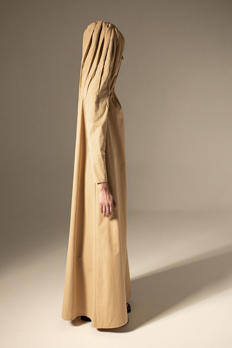In DZHUS SS22 collection of multi-purpose clothing and accessories, Irina Dzhus ironises equally the established stereotypes about human appearance and exaggeratedly optimistic new trends. DZHUS juxtaposes empowerment to the body cult in symbolically sexualised silhouettes featuring grotesque proportions. Exhibitionism coexists with introversion in all-covered outfits showing surreal, anatomic-looking details while being modified. While design of collars and pockets refers to breasts’ shape, pleated wig-like hoods are an allusion to hair obsession in the mass culture.