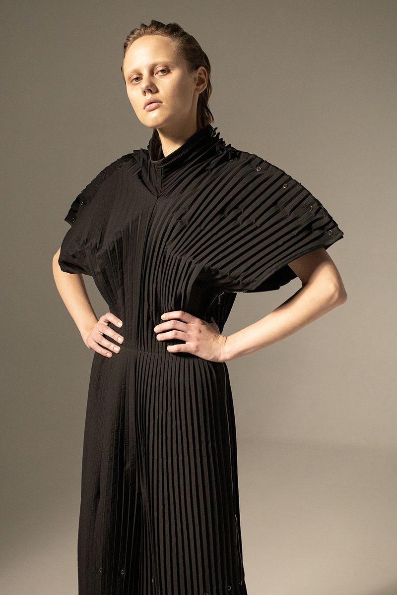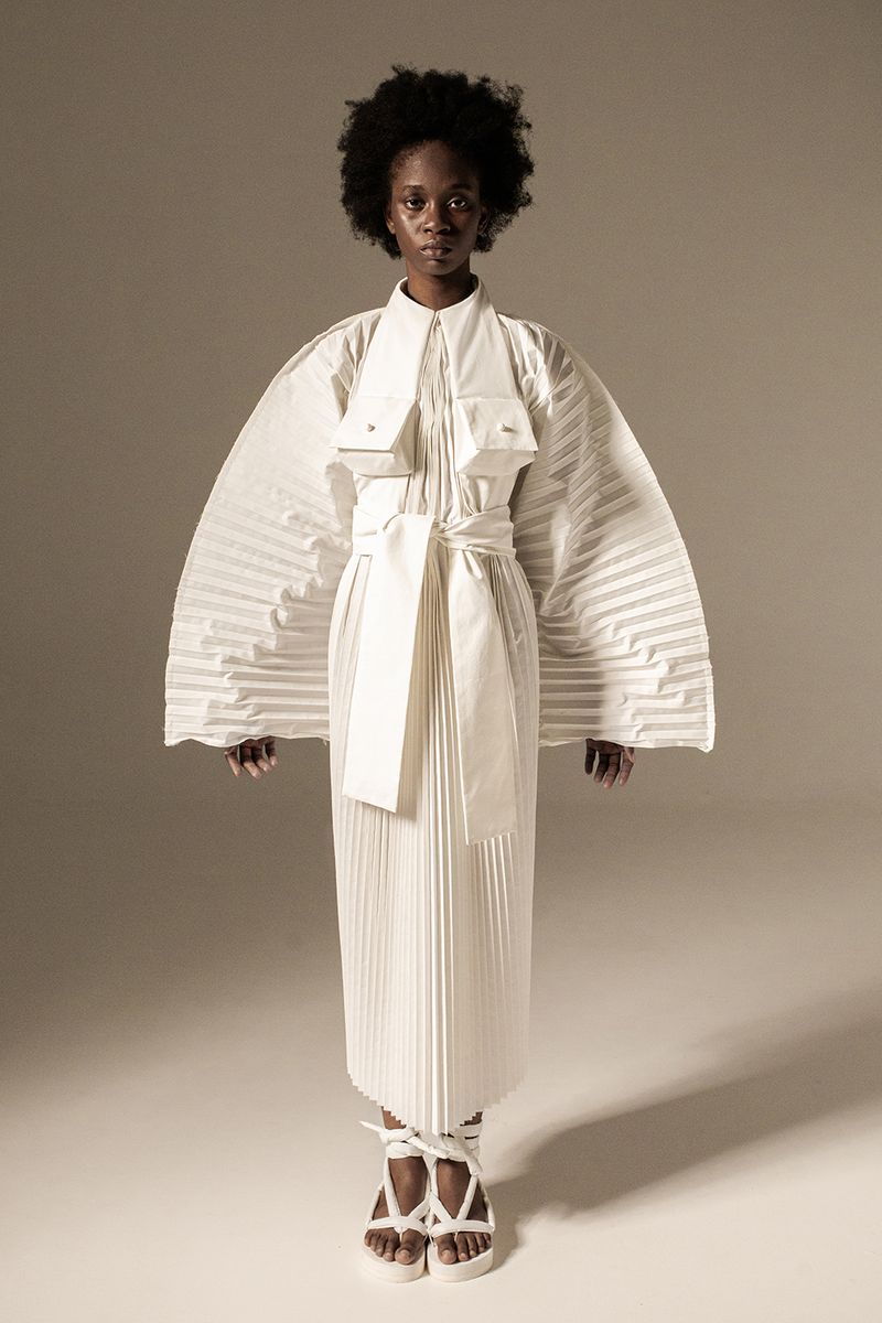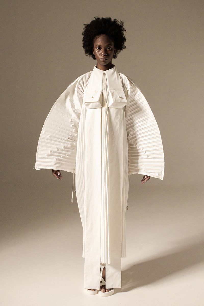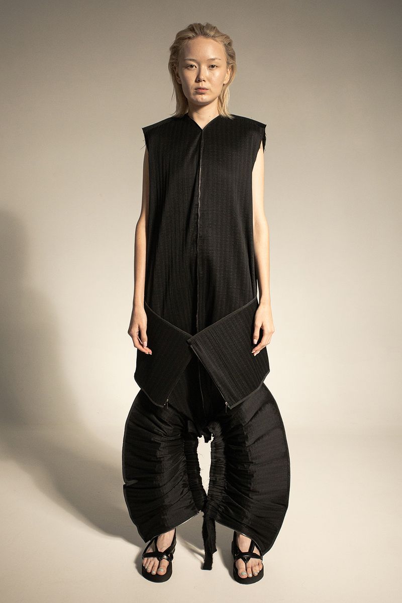 In DZHUS SS22 collection of multi-purpose clothing and accessories, Irina Dzhus ironises equally the established stereotypes about human appearance and exaggeratedly optimistic new trends. DZHUS juxtaposes empowerment to the body cult in symbolically sexualised silhouettes featuring grotesque proportions. Exhibitionism coexists with introversion in all-covered outfits showing surreal, anatomic-looking details while being modified. While design of collars and pockets refers to breasts’ shape, pleated wig-like hoods are an allusion to hair obsession in the mass culture.