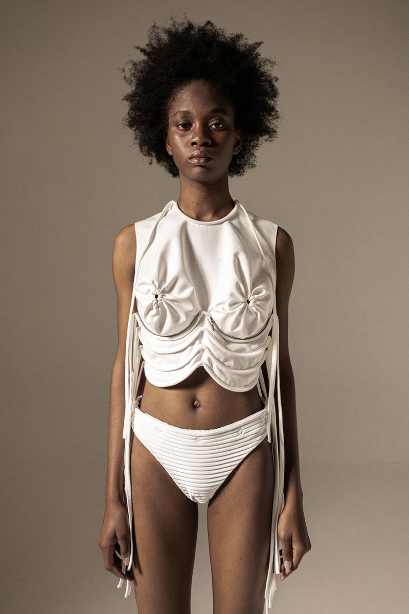 The lingerie theme is boldly translated in the garments’ structure: 2 underwear bottoms merge into a top, whereas bra details are multiplied, forming a distorted biomorphic look. The ethically sourced fabrics are playful and emotional: from double-faced cottons to immense pleating, from glossy silk to soft melange, from ribbed wool to crumpled organza.