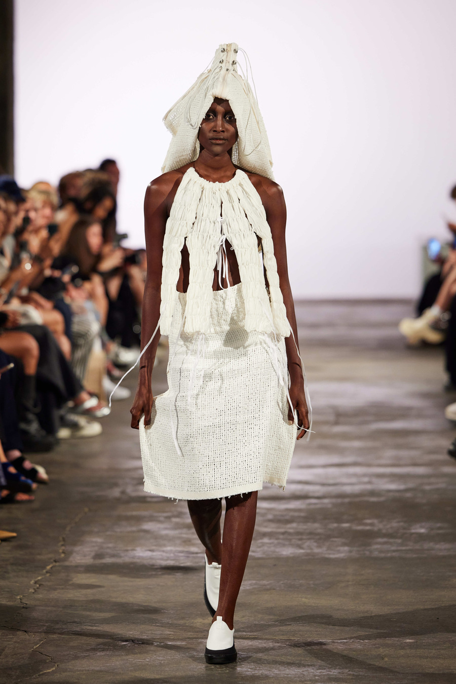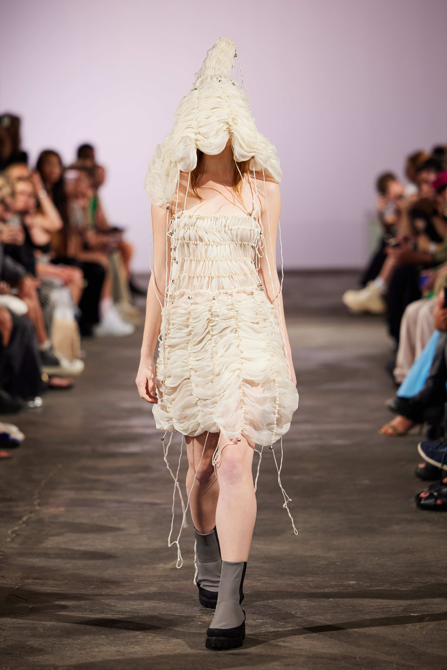 The SS24 color palette by DZHUS is deliberately monochrome, with warm ecru shades adding a touch of elegance and depth. Season after season, Irina Dzhus consciously opts out of color to make way for architectonic and technological experimentation. The DZHUS Spring/Summer line is a display of stunning complex cut concepts, fresh ideas for garment transformation, and upgraded signature styles.