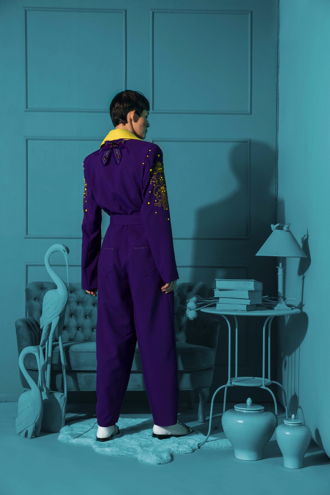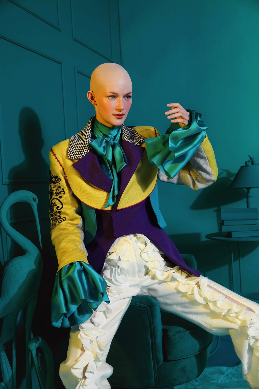 The concept of the collection is visualised in our photoshoot, showing the journey of a person transitioning from their true self to their character, using the garments, prosthetics and symbolism.”