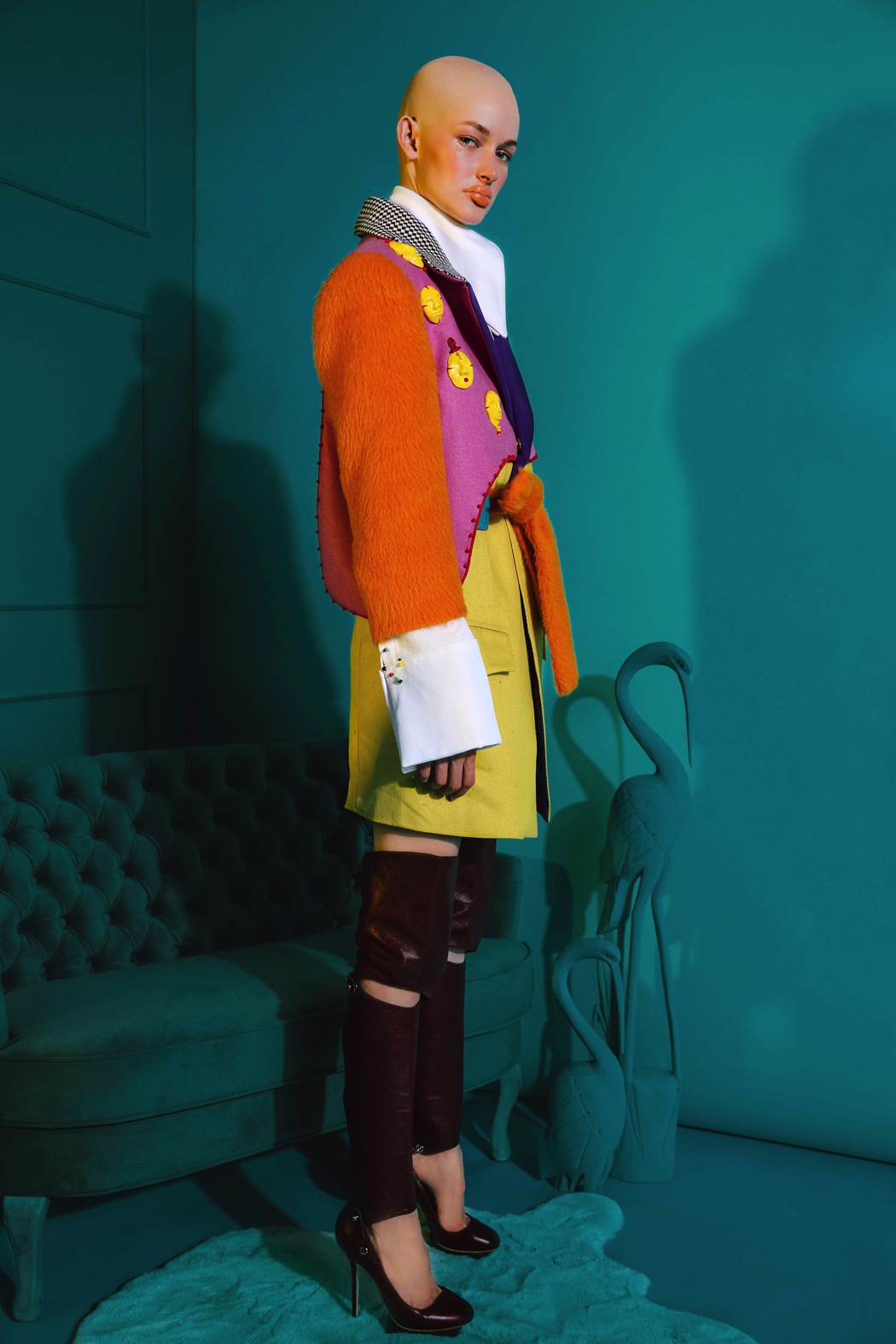 “I am Katrina Knizikeviciute, a London based creative director, model, fine arts artist and fashion designer of Bajoras bespoke. “EGO Circus” is the most recent Bajoras collection, inspired by Eckhart Tolle’s book ‘A New Earth’. The collection tells a story about the human detachment from his true ‘self’ and how having an excessively dominant ego is a persons source of pain, be it some sort of rusting pain from the past or simply unresolved insecurities. Many of us attempt to brush these issues under the carpet and deny ourselves a chance to heal by putting on a ‘mask’, of some sort. This gives birth to a self convincing performance that many start to identify themselves as, but in truth this is nothing more than their character (ego). The message: Don’t take yourself so seriously, drop the mask, embrace your vulnerability and trust that the real you is worth yourself and the world getting to know.