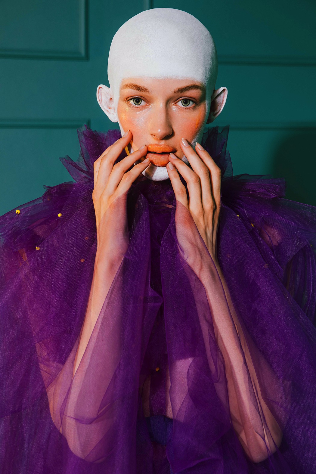 The concept of the collection is visualised in our photoshoot, showing the journey of a person transitioning from their true self to their character, using the garments, prosthetics and symbolism.”