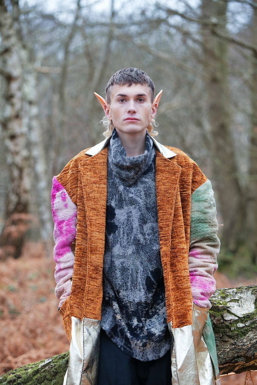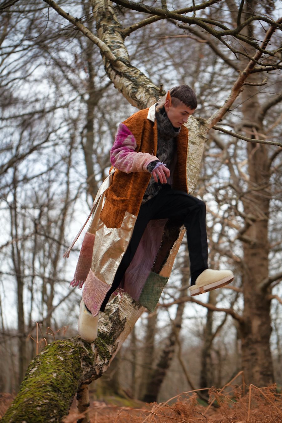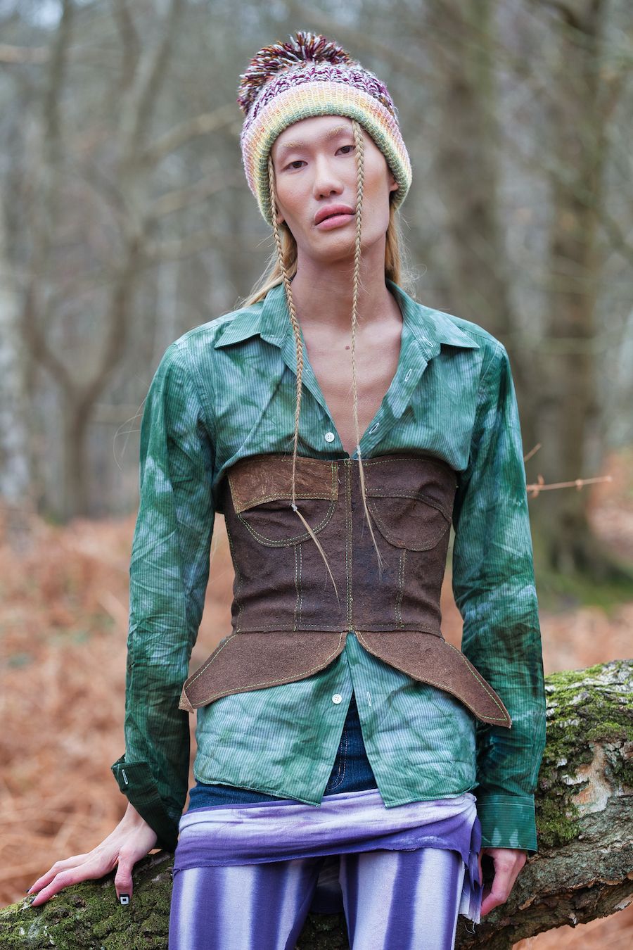 EIRINN HAYHOW walks us deep amongst the trees, where we can listen to the heartbeat of the forest. We are tree people, and our bond with nature can not be broken. Her beautiful genderless collection consists of a combination of salvaged and sustainable materials, using natural dyes from different types of plants and barks. This season EIRINN HAYHOW introduces her own grown biomaterials. Plant leathers she has grown from food waste and foraged plants.