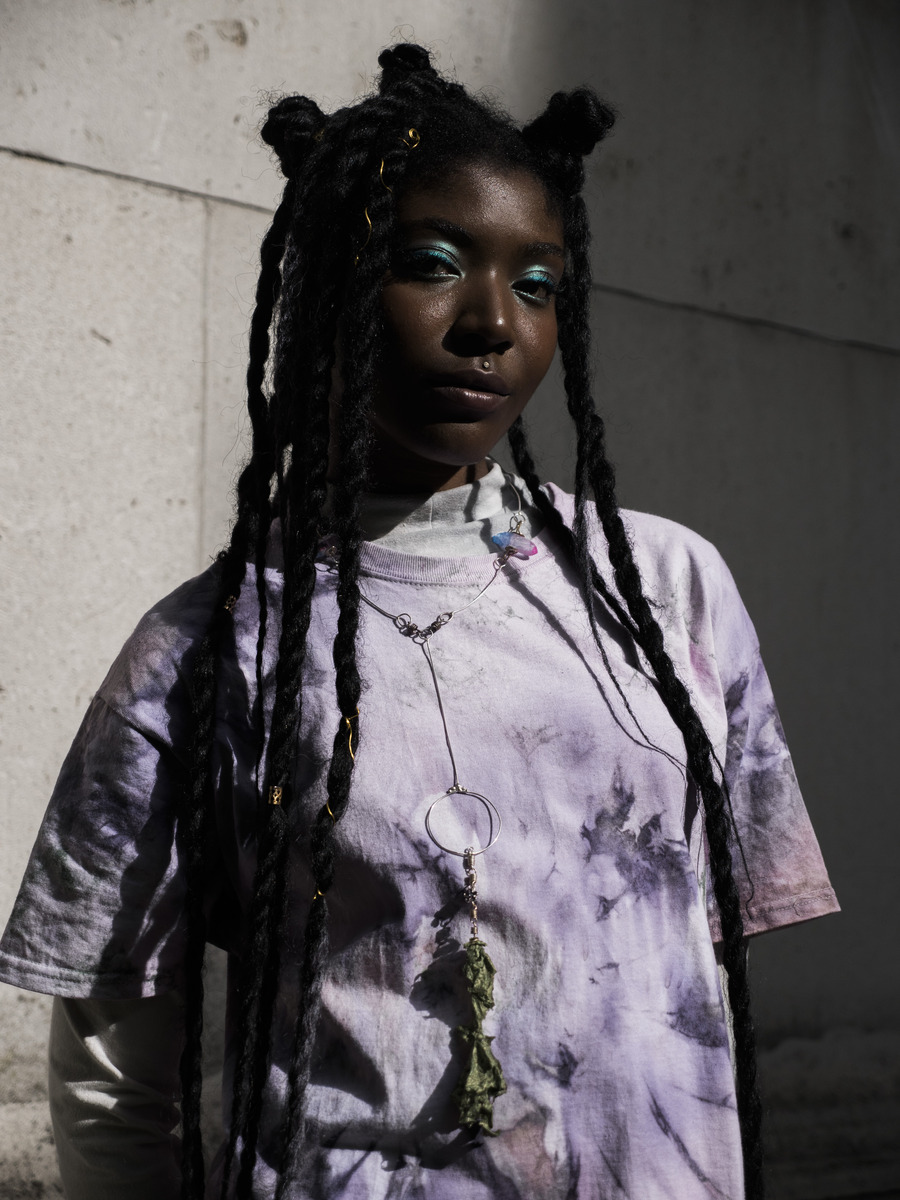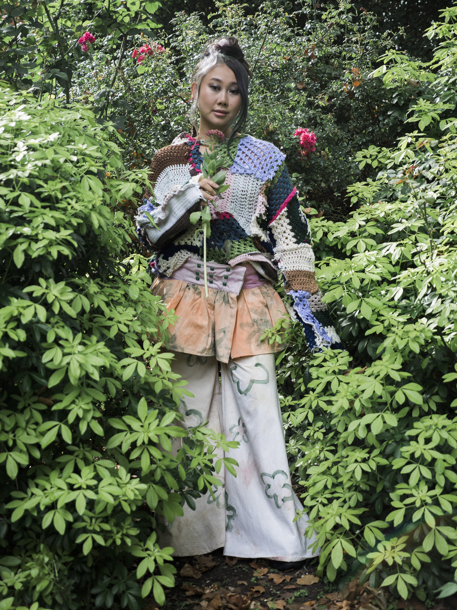 The collection itself combines together EIRINN HAYHOWS’s use of plant magic, creating a kaleidoscopic array of colours from plants, herbs, barks and ground crystals. Incorporating specific healing properties in an attempt to heal the wearer from anxiety, depression and other nervous disorders. EIRINN HAYHOW also grew her own coffee leather, plant-based leather and orange and banana leather that made couture pieces, as well as accessories for the collection.
