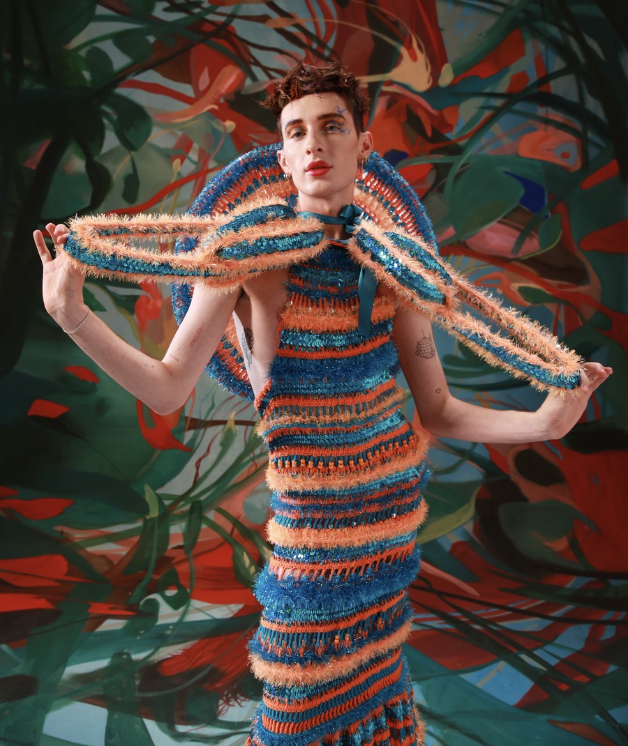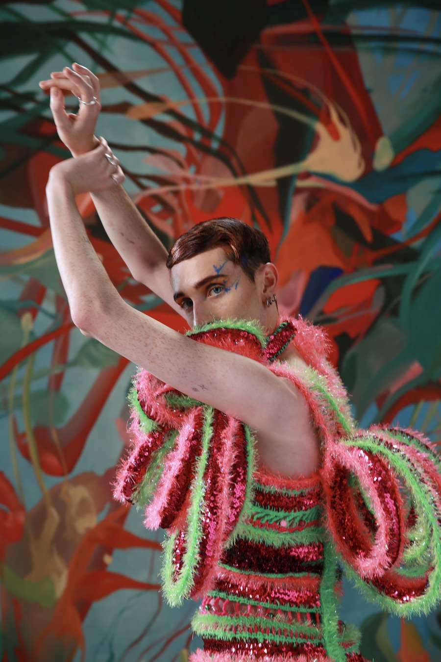 This collection is a testament to my ongoing commitment to drawing inspiration from queer history. For this particular series, my creative wellspring was the vibrant world of club kid couture, resulting in a collection that pays homage to its influences’ bold and eclectic spirit.”