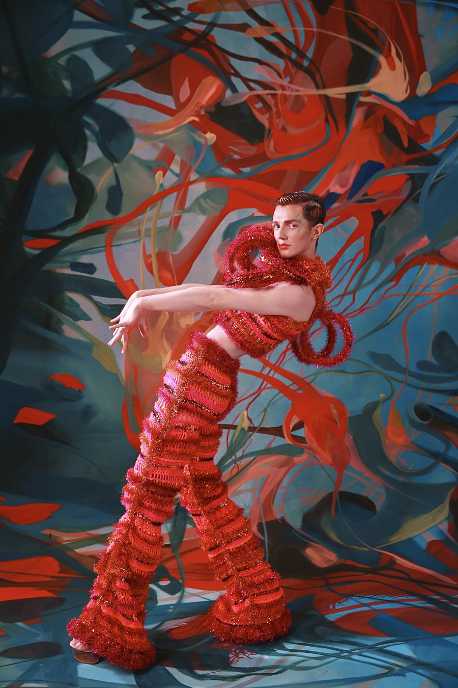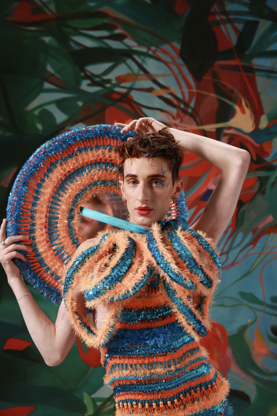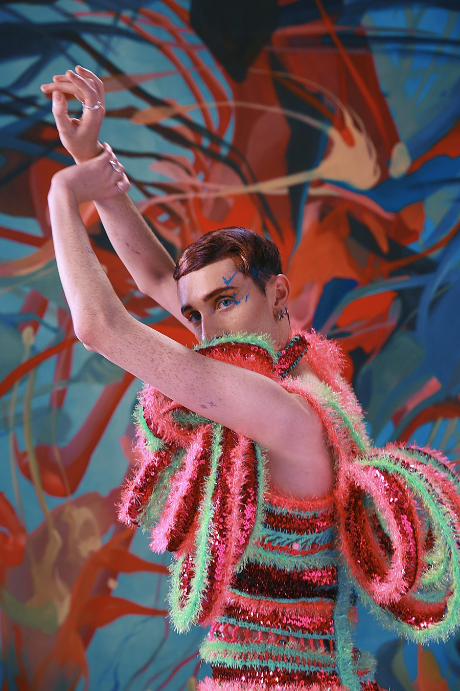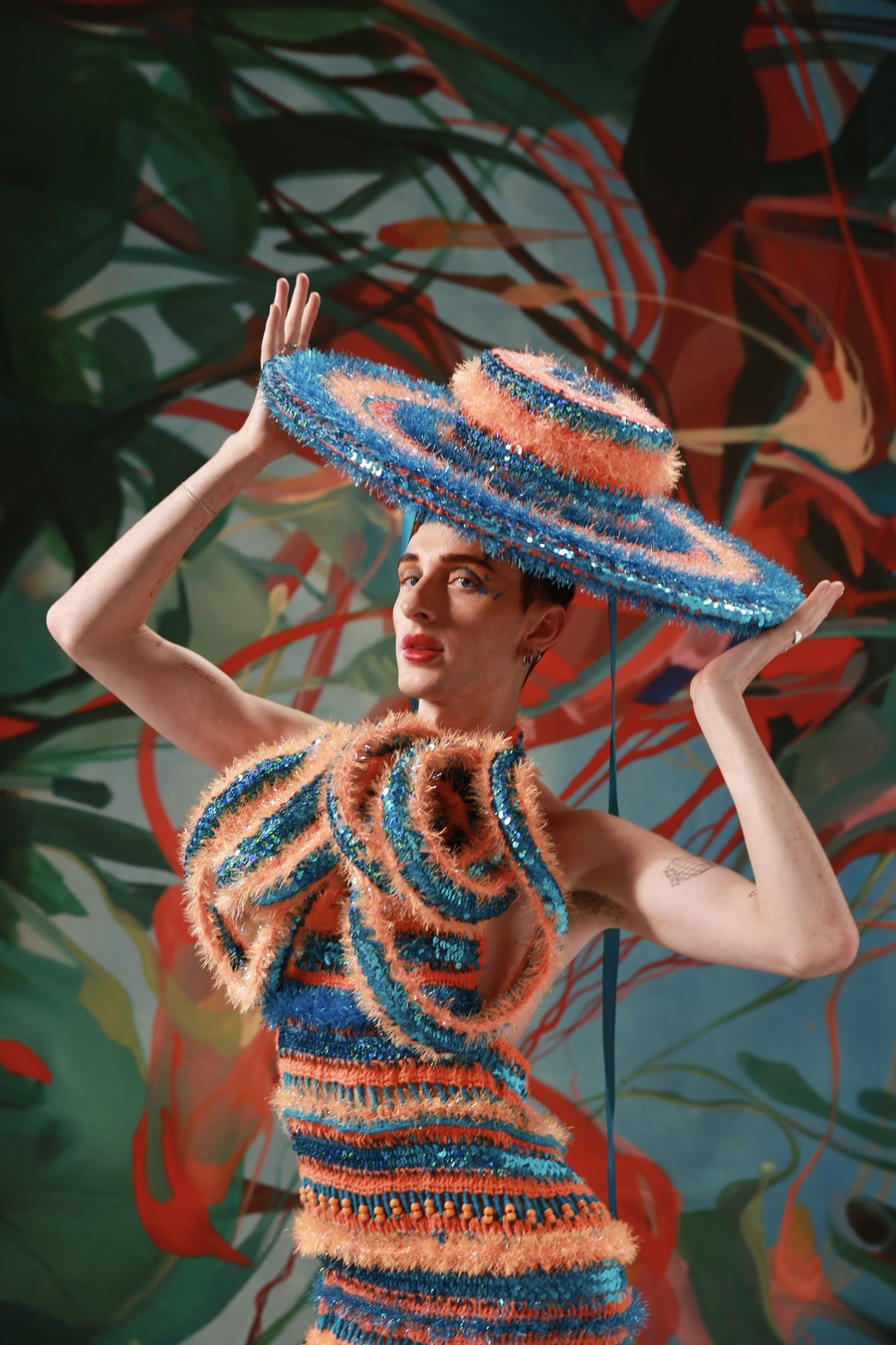 This collection is a testament to my ongoing commitment to drawing inspiration from queer history. For this particular series, my creative wellspring was the vibrant world of club kid couture, resulting in a collection that pays homage to its influences’ bold and eclectic spirit.”