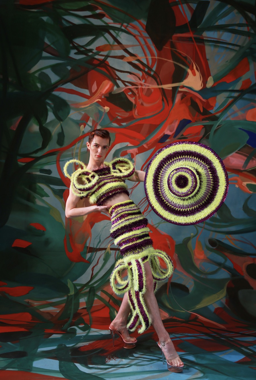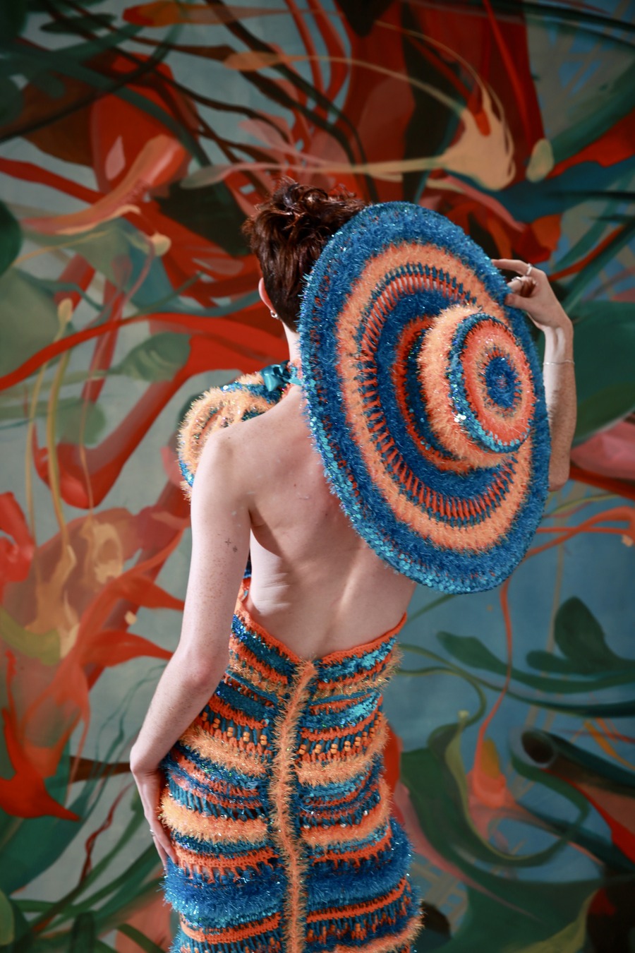 Drew’s high couture crochet collection features recycled elasticated sequins and yarn, showcasing a novel technique he developed. Each look is a fusion of couture and fashion, embodying the essence of Drew’s innovative approach that seamlessly integrates elasticated sequins into crochet.