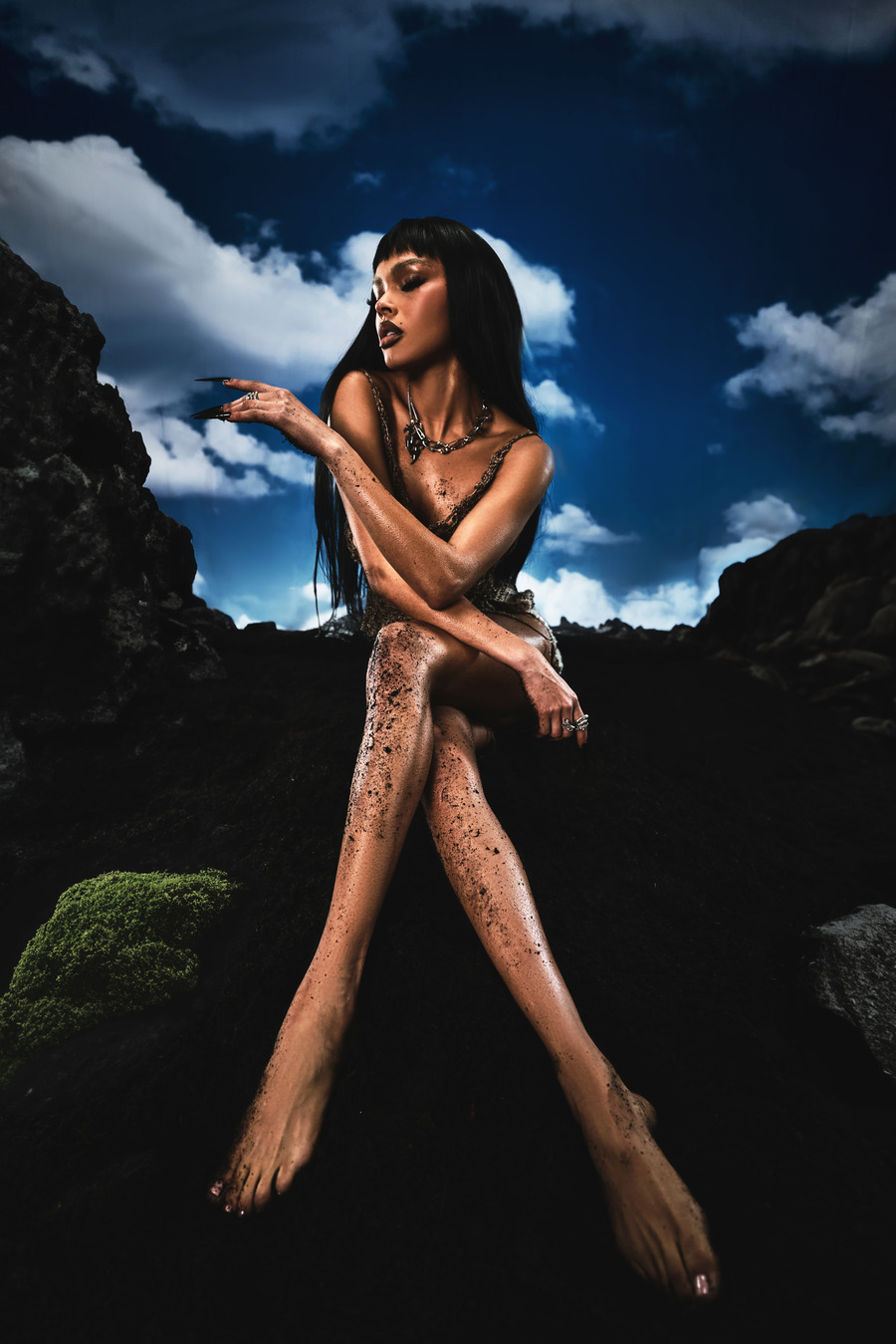 Delving into the heart of primordial mystery, the studio encased in the serene whispers of low-key lighting unfolds a tale of evolution intertwined with modern-day elegance. The black soil, a symbol of life’s humble beginnings, cradles the model who is on the brink of a transcendental journey from the earthly bound to the epitome of contemporary sophistication.
