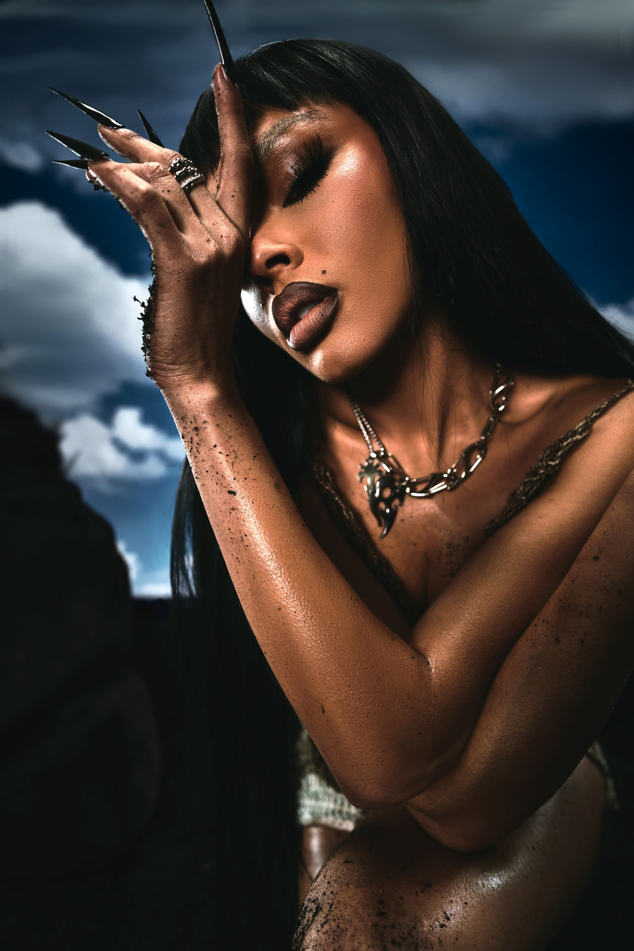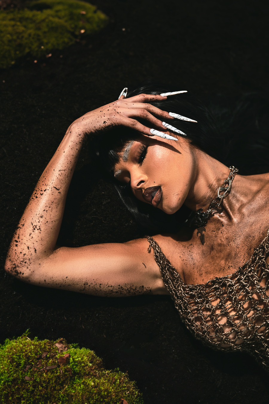 Delving into the heart of primordial mystery, the studio encased in the serene whispers of low-key lighting unfolds a tale of evolution intertwined with modern-day elegance. The black soil, a symbol of life’s humble beginnings, cradles the model who is on the brink of a transcendental journey from the earthly bound to the epitome of contemporary sophistication.