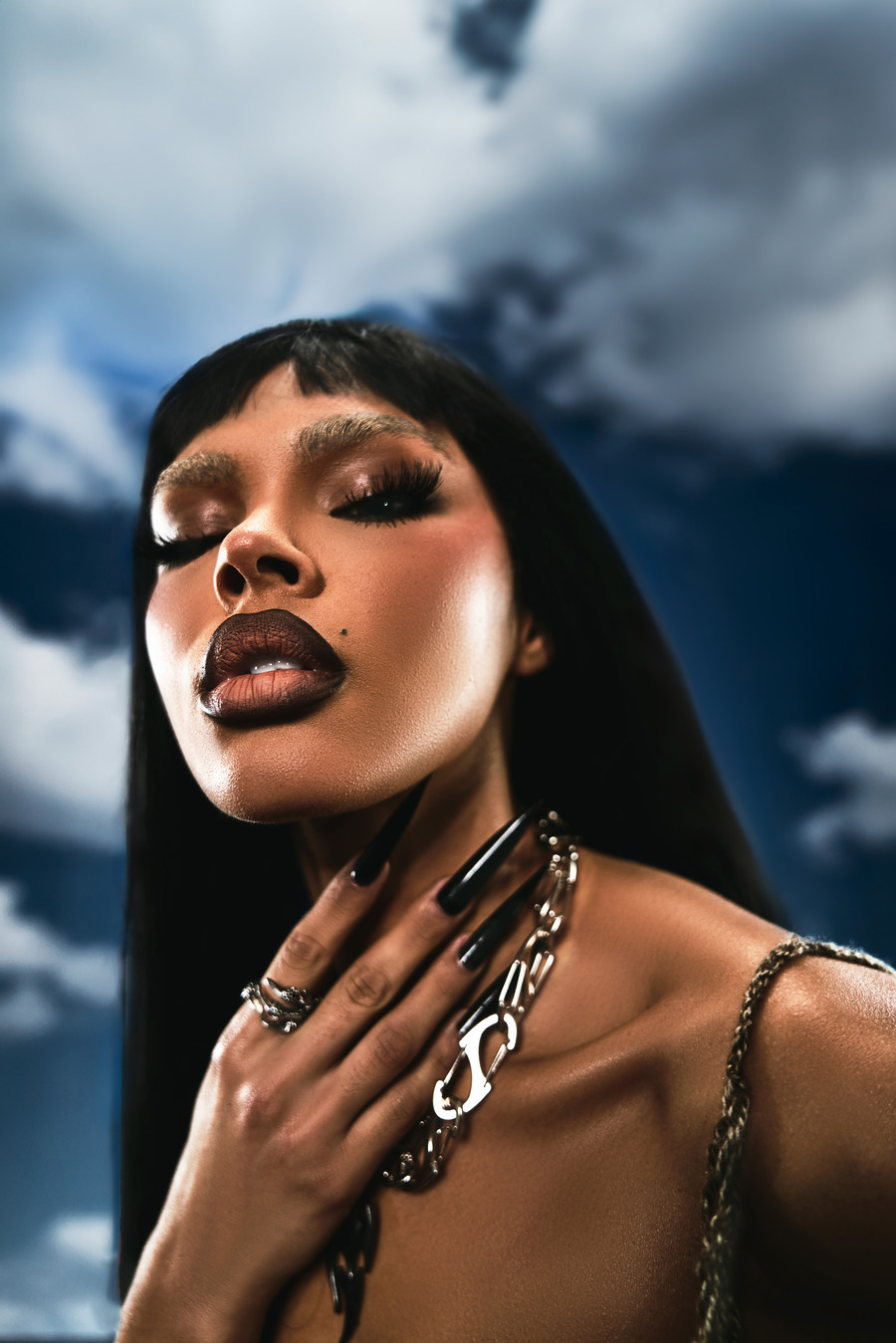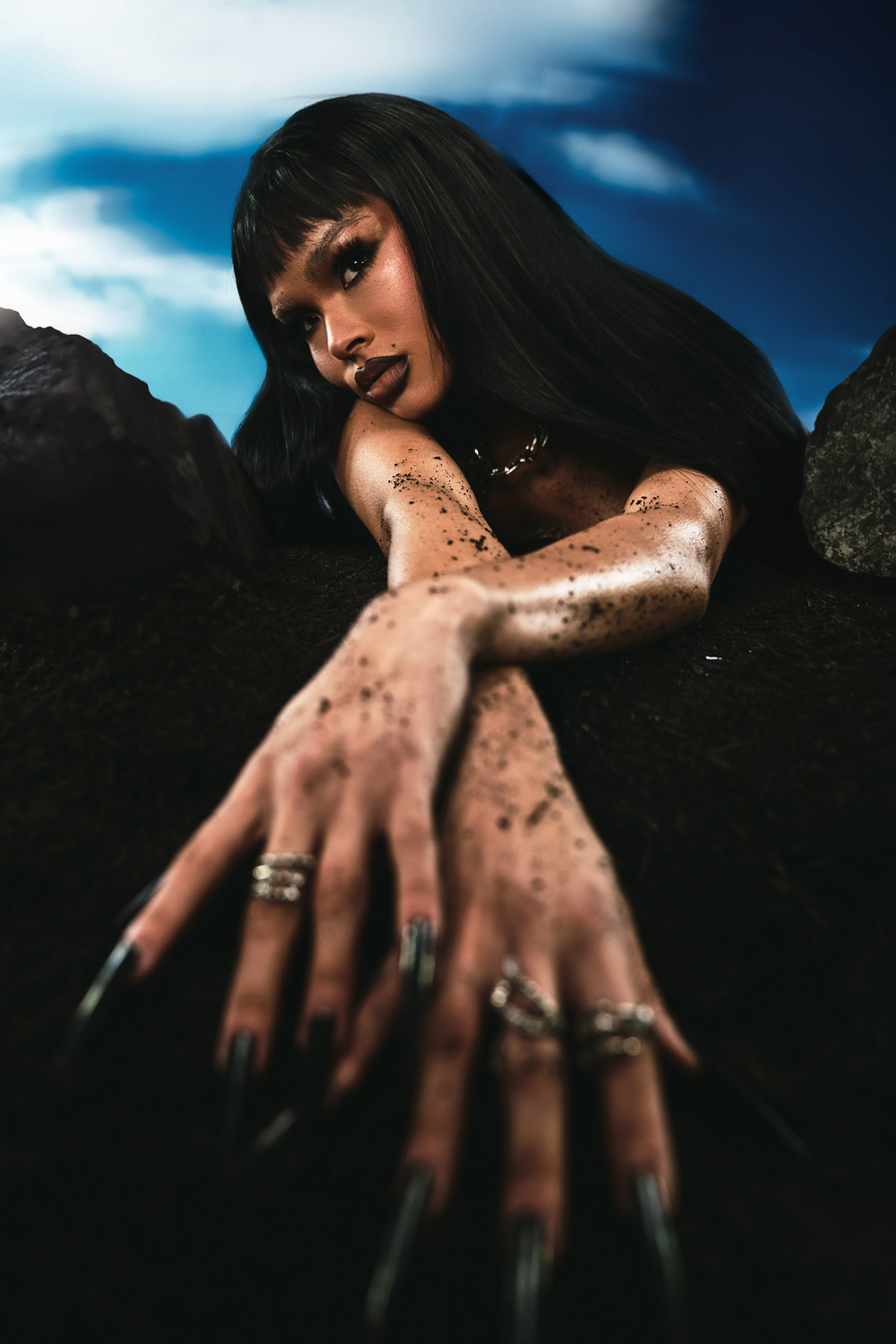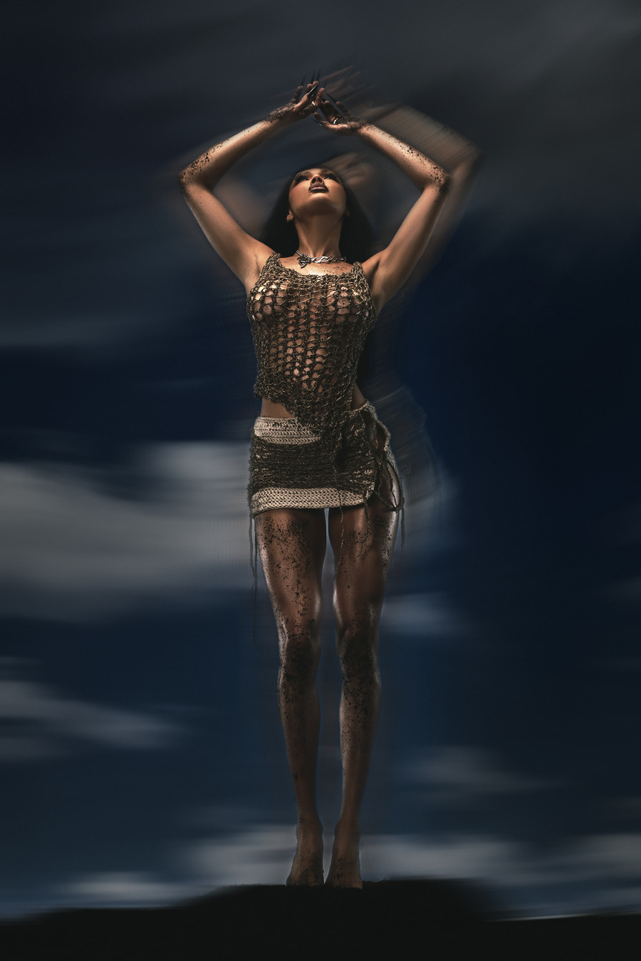 Amidst the untouched black soil, the model’s face and hands are the first to seek the beyond. Their eyes are a calm storm, foretelling the journey ahead. The dim light conceals as much as it reveals, teasing the marvel of what’s to come.