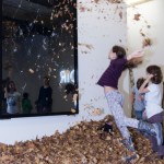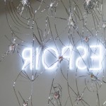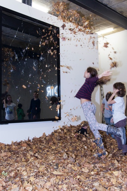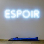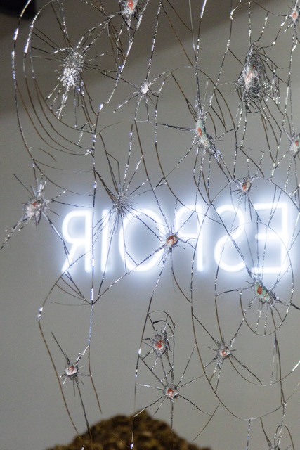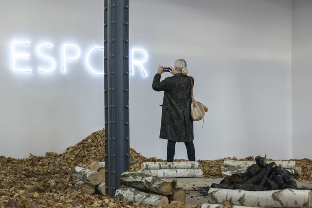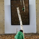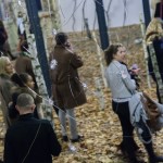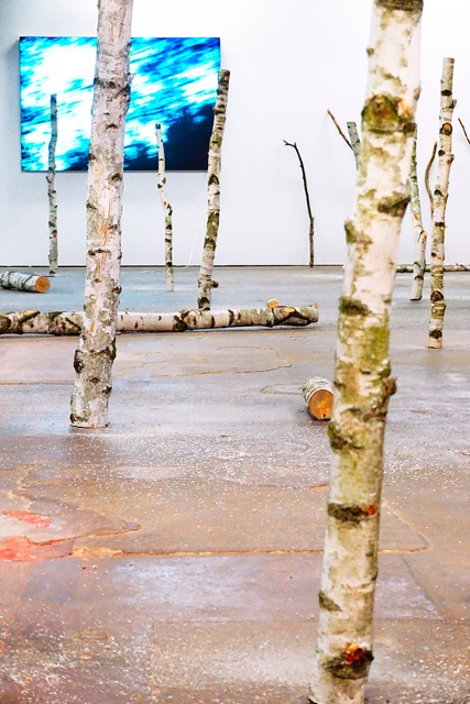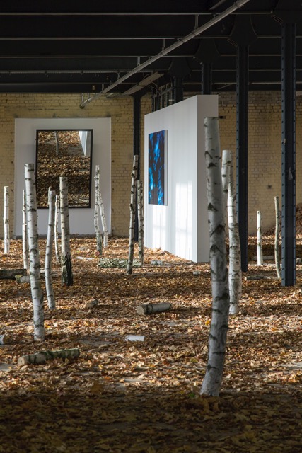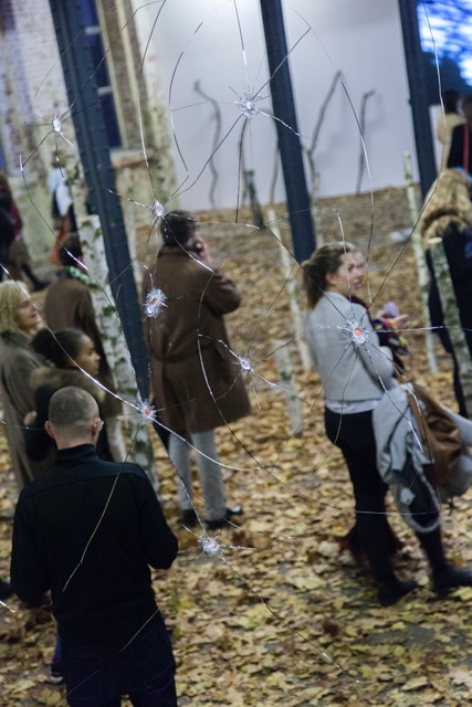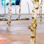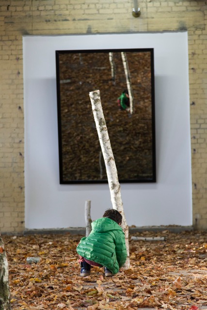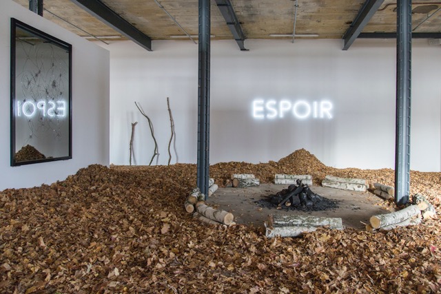 It does work because it makes the viewer realize how, under a natural appearance, we are living in a domesticated and fake environment. When we think capitalism and democracy, roots of contemporary Europe, it’s our natural environment as we’ve always been in it, but it’s as true as those poor birches are living trees in the forest. Ya know what I mean? After all, this is post-cynical art, so I’m going for it. You have pictures so I’ll keep it short on the description: There are lots of dead leaves on the floor, a lot of pieces of birch trees held up like trunks or assembled in various structures, there are big photos mounted on light-boxes, black mirrors, a video and words in white neon. It’s full, and it’s full on. But hey, who has enough of empty exhibition spaces with a piece of metal in the middle? Me! Me! Me! Alright, so here you have food for the thought, even though it’s not a metaphor, it kind of is because « The leaves that you are walking on are all the fallen hopes of the past decades ». Ding Dong, do you feel it? Yes, we’re getting there. Europa Eutopia is an exhibition questioning our political continent. By putting in perspective the expectations of our ancestors on this land. For CHTO, the exhibition is the embodiment of all the lost hopes, « memories of destruction, of wars, of exiles and migrations ». He is trying to give a body to the anxiety that rules over our countries. It is as deep as the memory of walking in a birch tree forest. CHTO, under his other alias Camille de Toledo, published an essay in 2009 about Beeches and Birches. In it, he positions the birch as the tree of the massacre, being a witness of the extermination.