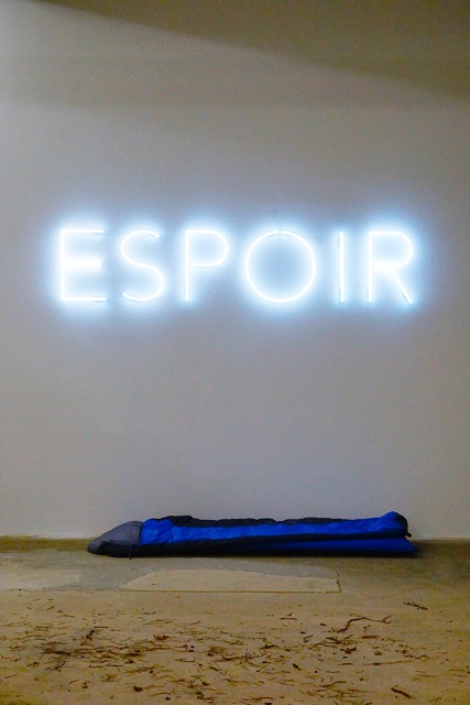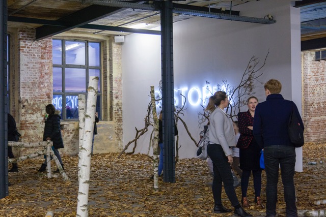 This Friday was quiet and sunny in Berlin. Oranienburgerstrasse was filled with latte drinking black-dressing pug owners, the streets were singing verses of soft gentrification, etc. Then I took a bus to Leipzig with a bunch of weirdos and then it got more interesting. We were invited by the agency Kunst und Helden to attend the opening of CHTO’s « EUROPA EUTOPIA » exhibition. It was worth it. Located in the famous Baumwollspinnerei, the show occupies a complete floor of the Halle 14 exhibition space – that makes 1000 square meters of immersive artwork. Upon entering, a girl gives a paper with the sentences: « This room where you are entering is not a metaphor. It is not a representation. It is for me reality as it is now. Each element in this room is at the same time material and idea. »