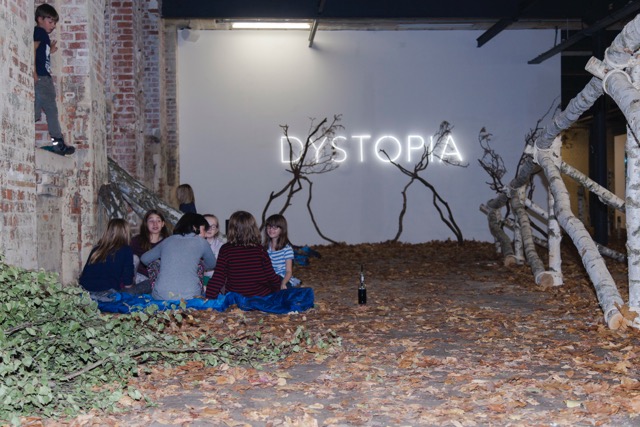 The exhibition is a perfect environment to trigger reflections on what the fuck we are doing with this Europe. For decades, we have been working toward a Utopian future, but since the late 80’s the society gave up and what we have left in a vague soup of feelings where we just try to make it alright for the ego. As an eternal optimist, I couldn’t help but notice that a large amount of the group gathered around a figured fireplace. There was no fire there, but they just gathered. The children, invited to sleep in the exhibition space, were contagiously excited. There is a memory in us humans. It’s a memory of lost hopes, of wars, of extermination and of destruction. But there’s also a memory of resistance, of never surrender, of looking at the light and of throwing all those leaves in the air and making toys out of them. Because humans are a part of nature, and nature doesn’t do eternal winters. There are many different ways of reading CHTO’s Europa Eutopia, and I could only convey mine, so I strongly encourage you to go to Leipzig and to check it out! CHTO is a French artist living in Berlin. It is the visual artist name of Alexis Mital, also known as Camille de Toledo or Oscar Philipsen for his literature and philosophical writings. Europe is a central topic in his practice – as a founder of the European Society of Authors for example. He’s an active and prolific multidisciplinary thinker. Among others he published Vies pøtentielles (2010) and L’inversion de Hieronymus Bosch (2007), is the author of the video and Libretto of the first 3D opera La Chute de Fukuyama, presented in Paris in 2013. In 2015 he already had two exhibitions in the Spinnerei – The Potential Exhibition in March and History Reloaded in May.