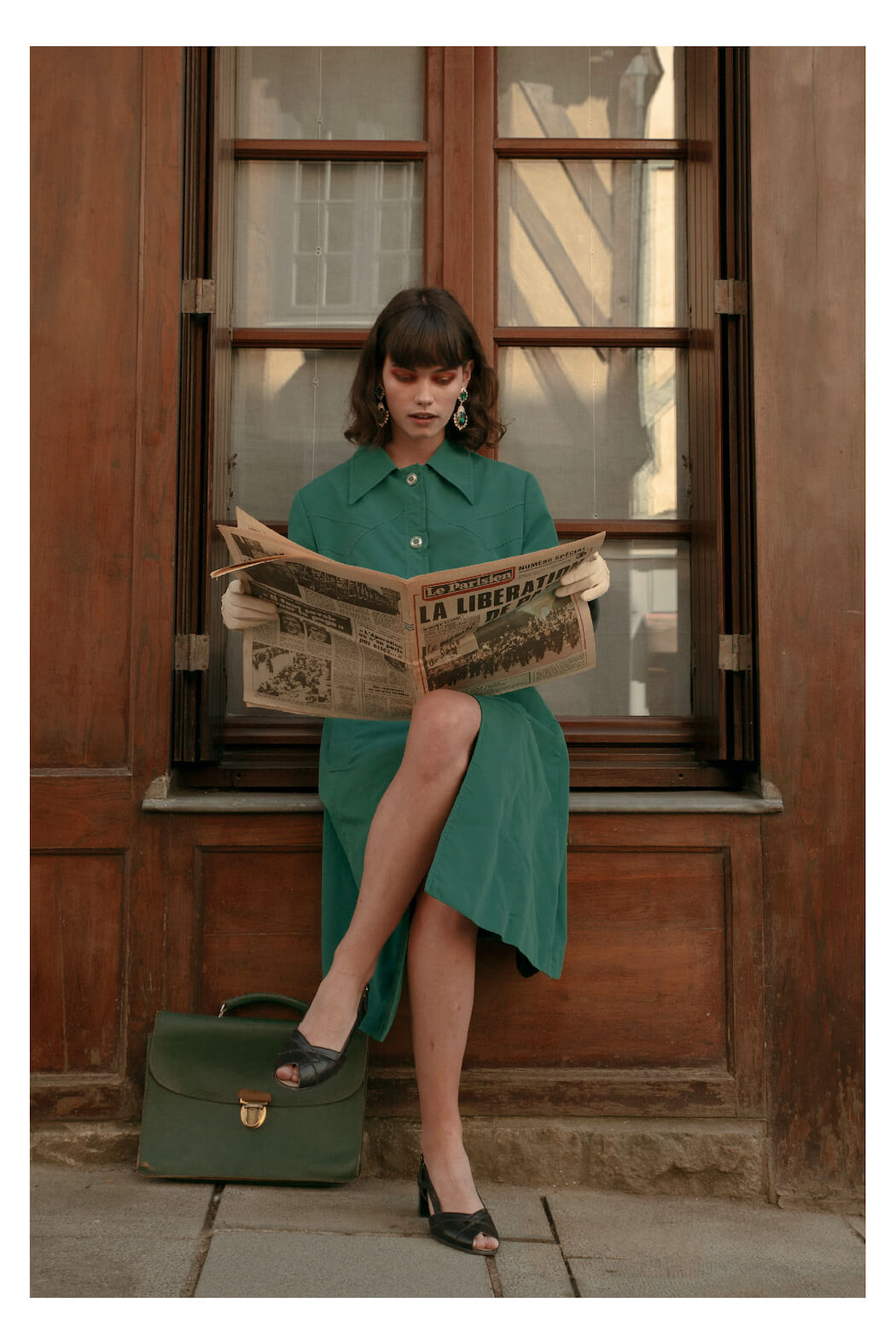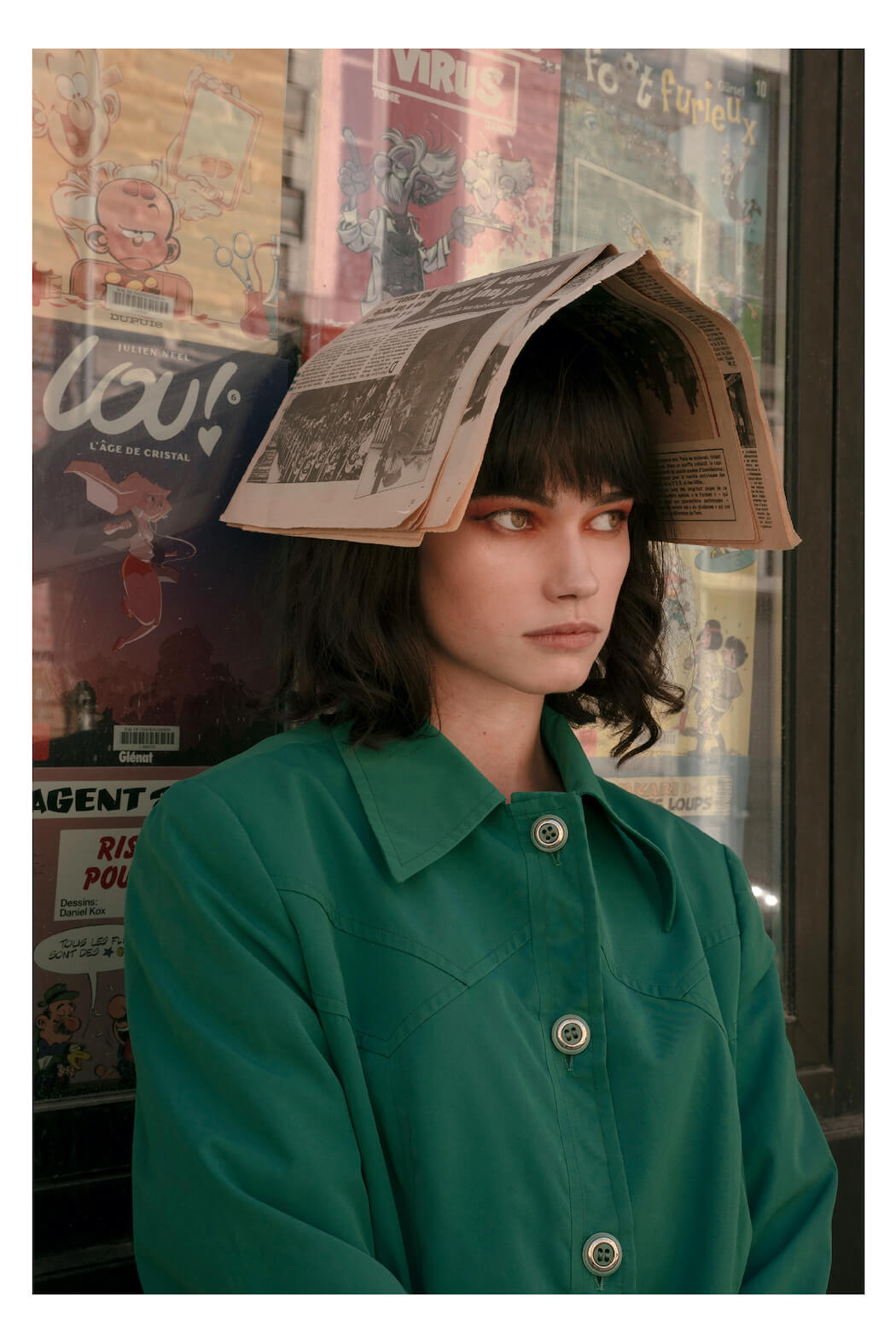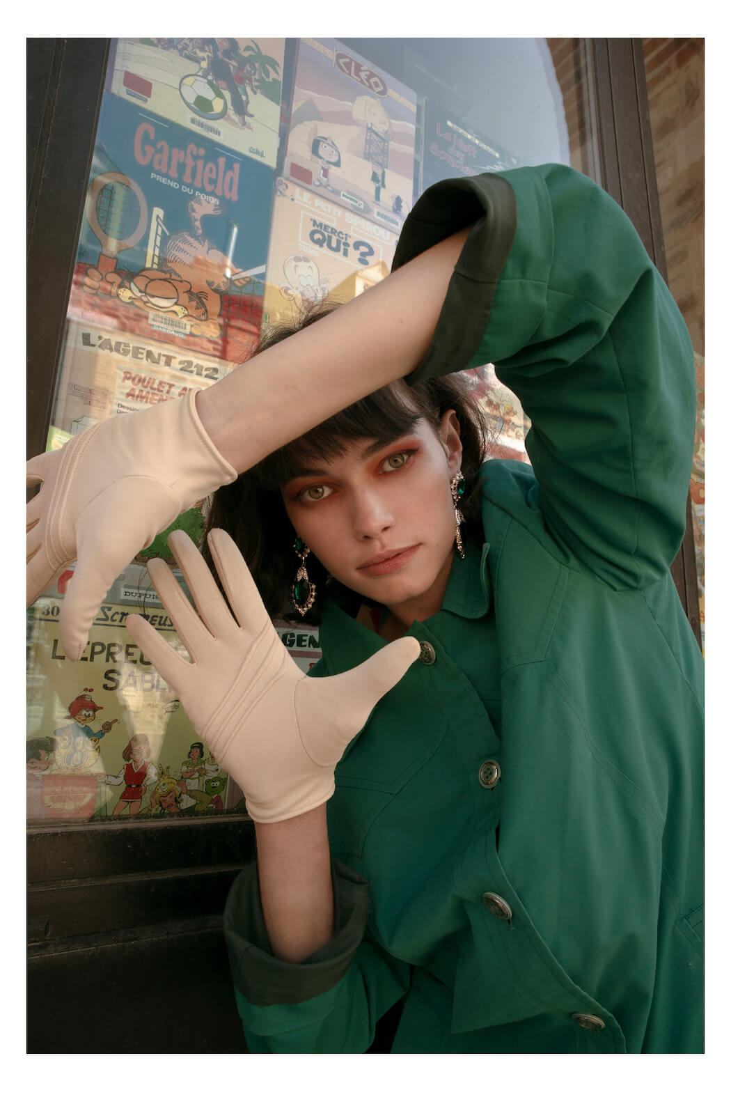 A KALTBLUT exclusive. Photography by Mariette Garault. Model is Maëlle Armilhon. Make up and hair by Mathilde Badoul. Styling by French Fripes. Brands are Reggio Bergame, Lafayette Collection, Apunto, London Fog, Samson, Guivert Frères, Targa.