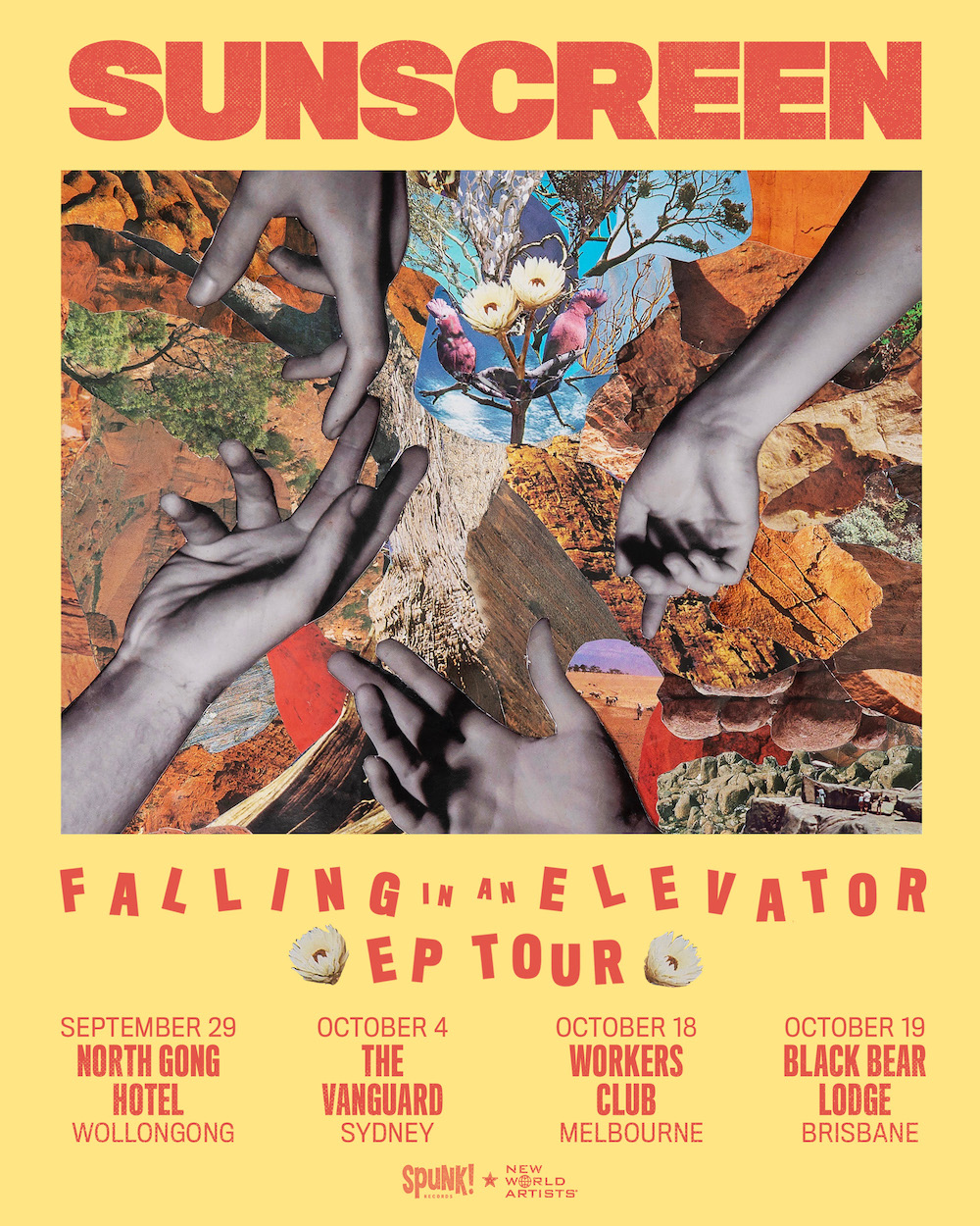 After recently joining the New World Artists family, jangly indie rockers Sunscreen present their highly anticipated ‘Falling In An Elevator‘ EP alongside an announcement of an Australian tour next month, visiting Wollongong, Sydney, Melbourne and Brisbane. Produced by Simon ‘Berkfinger’ Berkelman (Philadelphia Grand Jury, Art Vs. Science), ‘Falling In An Elevator’ exudes a beautiful toughness across its five tracks. “To us, this EP is a tiny photo album of five snapshots from different times throughout the past two years,” vocalist and guitarist Sarah Sykes explains, “All the songs were written collaboratively as a product of spending time together – whether at our practice studio, or in our old sharehouse. ‘Falling In An Elevator’ explores self-possession and freedom in times when emotions are pulling you beyond your own control and autonomy. Because that’s essentially what life is sometimes – we get pulled by forces beyond our control, similar to being trapped in an elevator.” ‘Falling In An Elevator‘ is out Friday 23 August via Spunk! Records and is available for pre-order now.