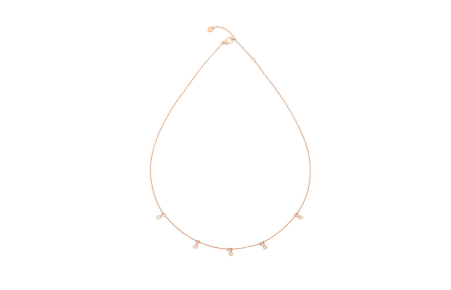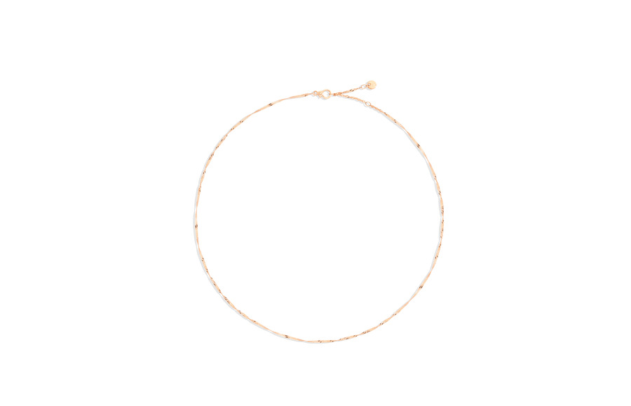The two filigree chains are adjustable in three sizes. They are decorative, but not flashy. They can be worn individually or with other chains. One 9-karat rose gold chain features twisted links that reflect light in unexpected ways. The more precious one counts five hanging diamonds framed with an ajour setting of rose gold: The gemstone is visible in all its purity.