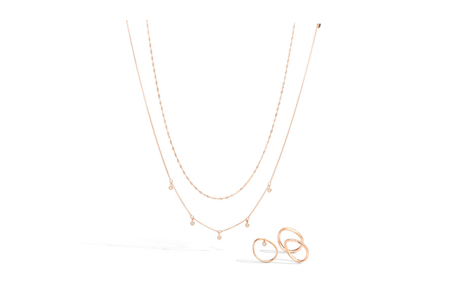 DoDo’s well-known wave rings, a distinctive shape that favours the possibility of wearing them side by side and thus more individual combinations, are available in Essentials in three versions: 9-karat rose gold, rose gold with diamonds in dégradé pavé, or rose gold with a hanging diamond.