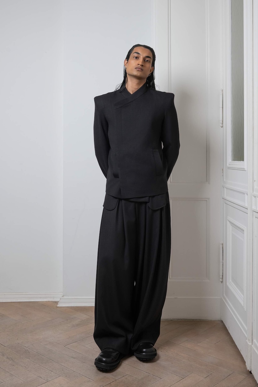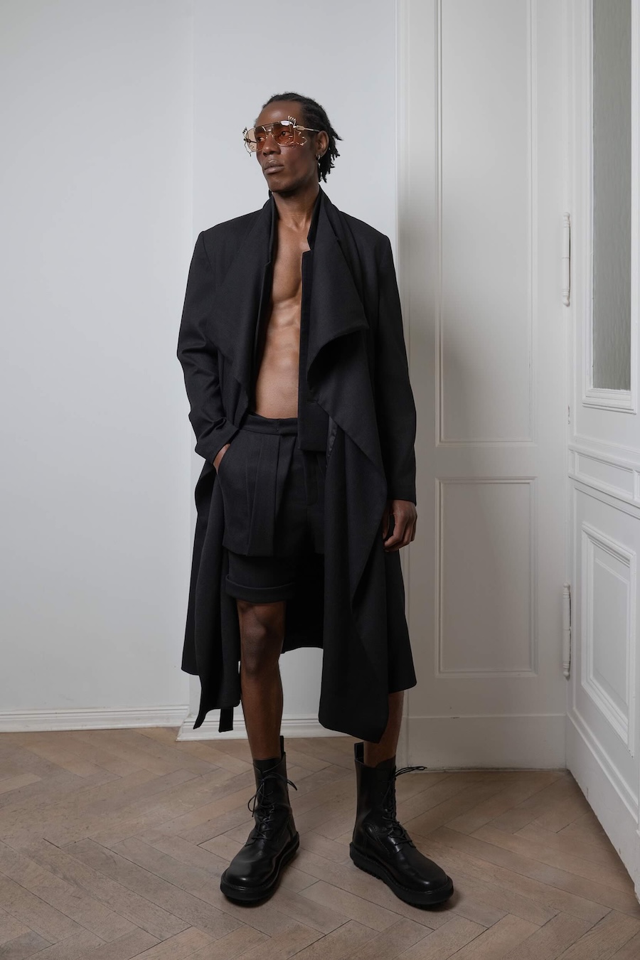 Among the highlights is a breathtaking sculptural silk gown, meticulously crafted from twelve meters of fine silk that echoes modernist sculpture while remaining steadfast in its connection to traditional tailoring. It balances grandeur with a rebellious spirit, making it the ultimate showstopper in this collection. Highlighting minimalist elegance, a unisex coat is invigorated by the bold placement of Perbandt’s signature waistband, morphing this essential piece into a sought-after staple.