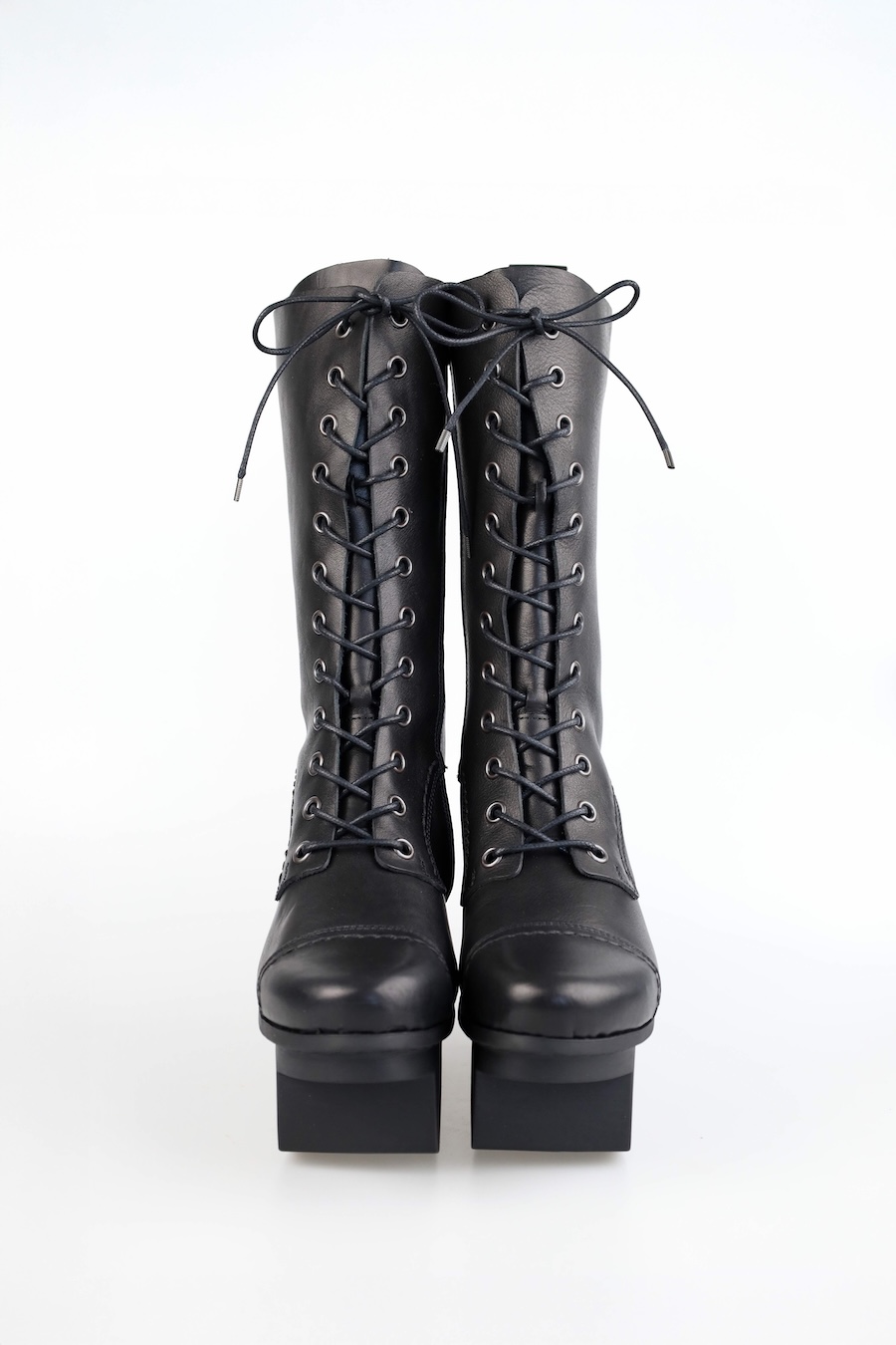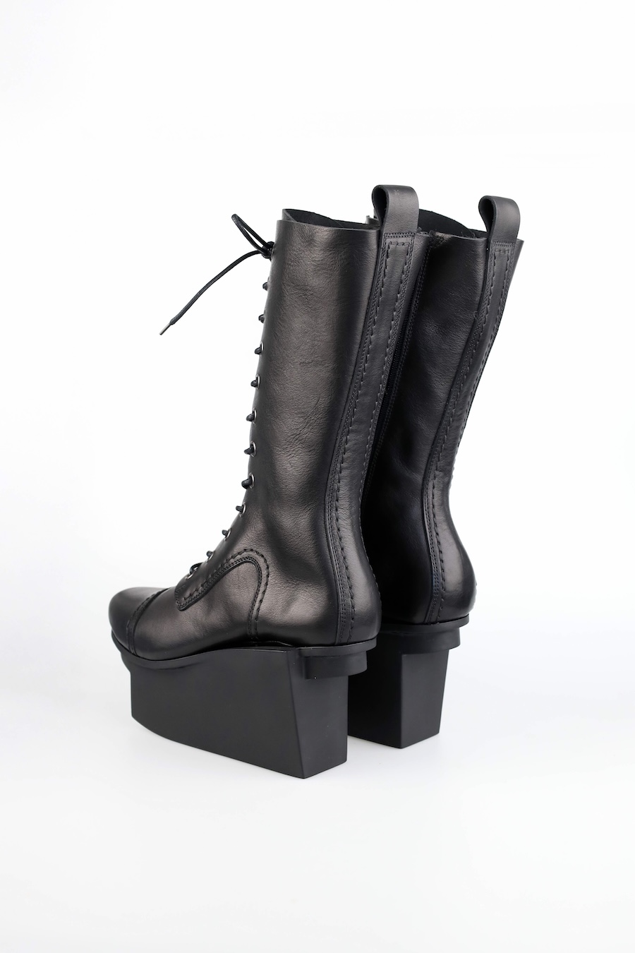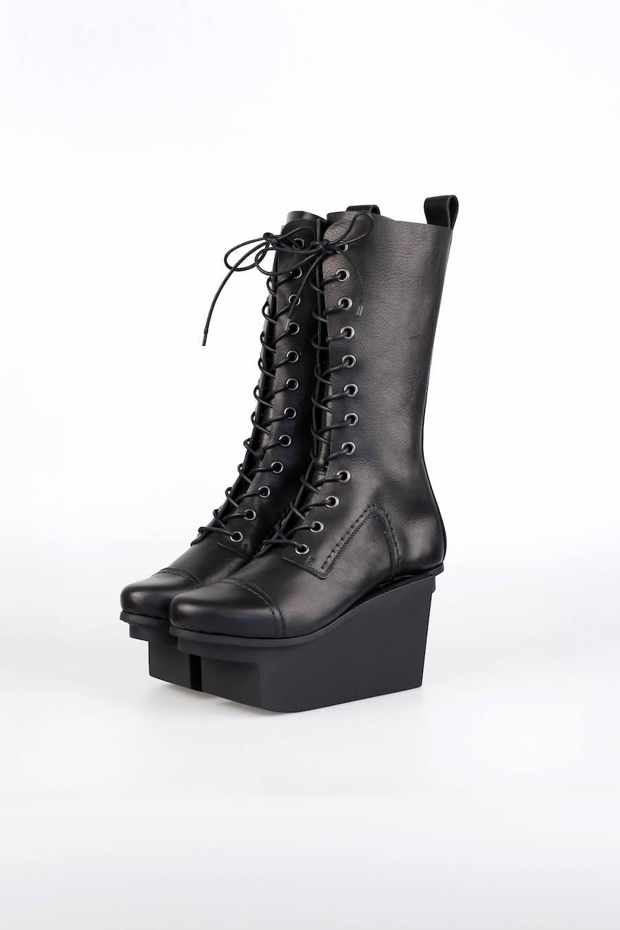 We had the pleasure of witnessing the latest creations from Perbandt’s collaboration with the Berlin footwear label Trippen, introducing a new high boot that redefines punk combat aesthetics with a sculptural minimalist approach, completed by Trippen’s iconic 10cm Geisha platform sole.