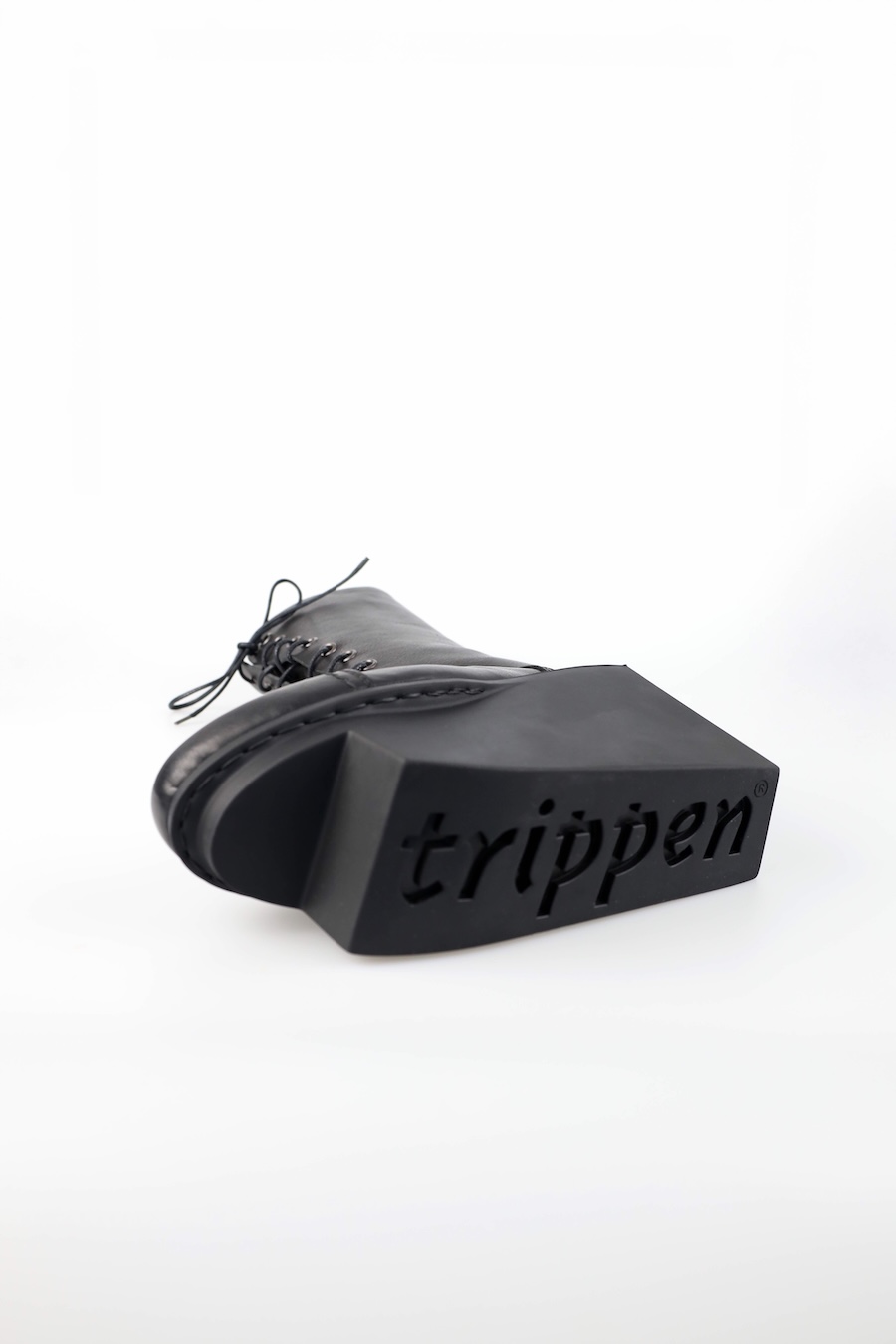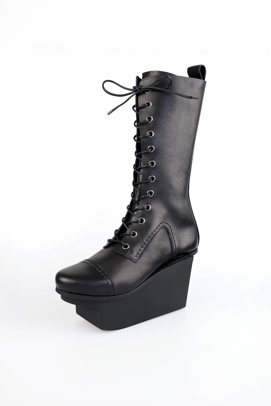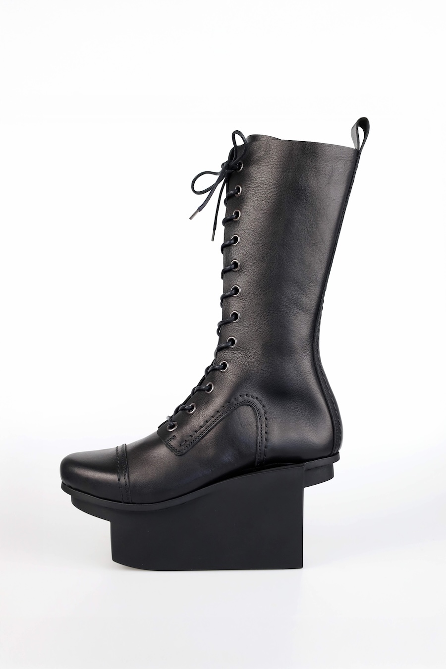 We had the pleasure of witnessing the latest creations from Perbandt’s collaboration with the Berlin footwear label Trippen, introducing a new high boot that redefines punk combat aesthetics with a sculptural minimalist approach, completed by Trippen’s iconic 10cm Geisha platform sole.