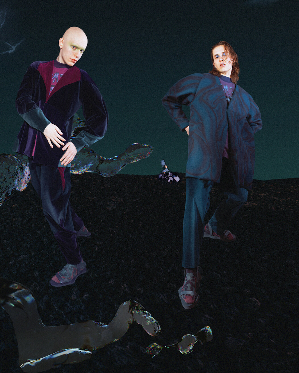 Hana: “Hybrid collection is based on the organic shapes of the imaginary world. Abstract prints were created in collaboration with an artist Eva Macekova, she used the technique of air-brush and we transformed the art pieces into the digital print applied on cotton shirts, silk dresses and wool coats. The collection includes velvet looks and hand-knitted clothes, the shoes were also created especially for the collection. Many of the garments can be worn or be adjusted for unique personalities, no matter their age or gender. It supports my feeling of gender fluidity and variability of garments. The main thing for me was creating the abstract world, where the creations/beings are partly humanoids and partly plants, that’s why I call it hybrid”.