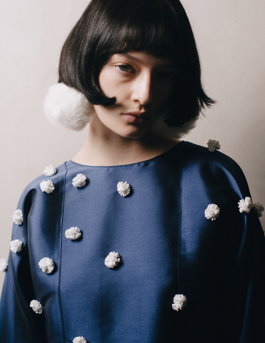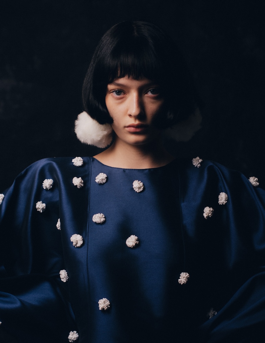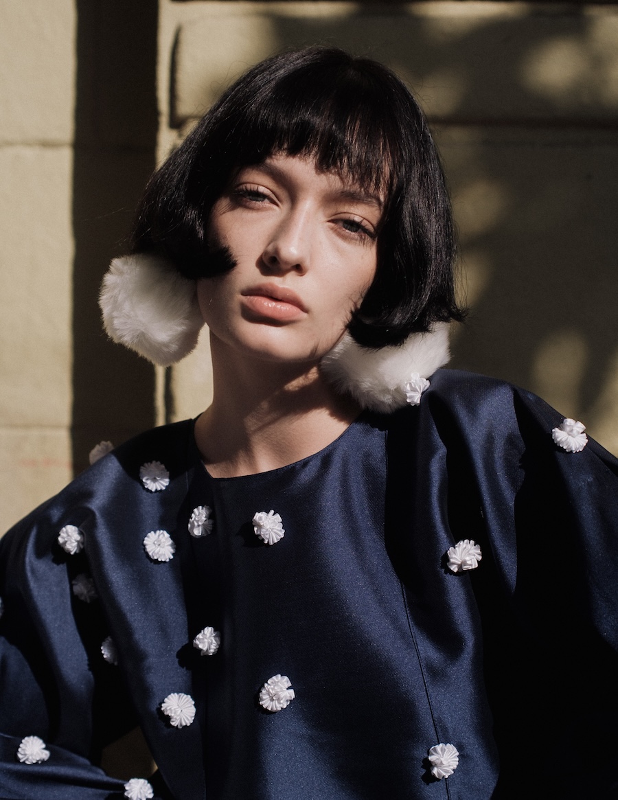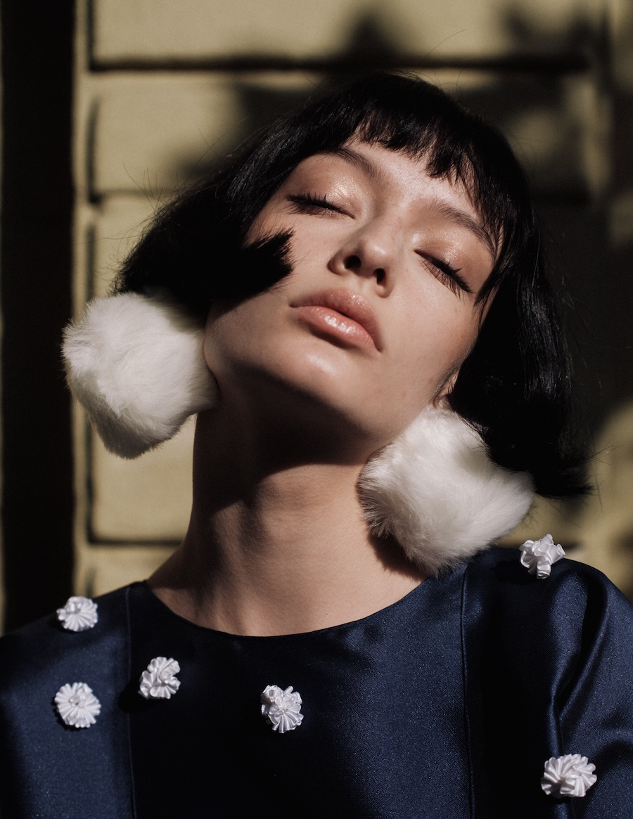 The editorial suggests a feminine figure inhabiting worlds in between: a space of introspection, mystery, and ethereal beauty that can be melancholic or powerful, depending on the observer’s interpretation. The incorporation of elements like white pom poms or fluffy fabrics evokes the ephemeral, while structure and geometric cuts introduce a sense of stability and control.