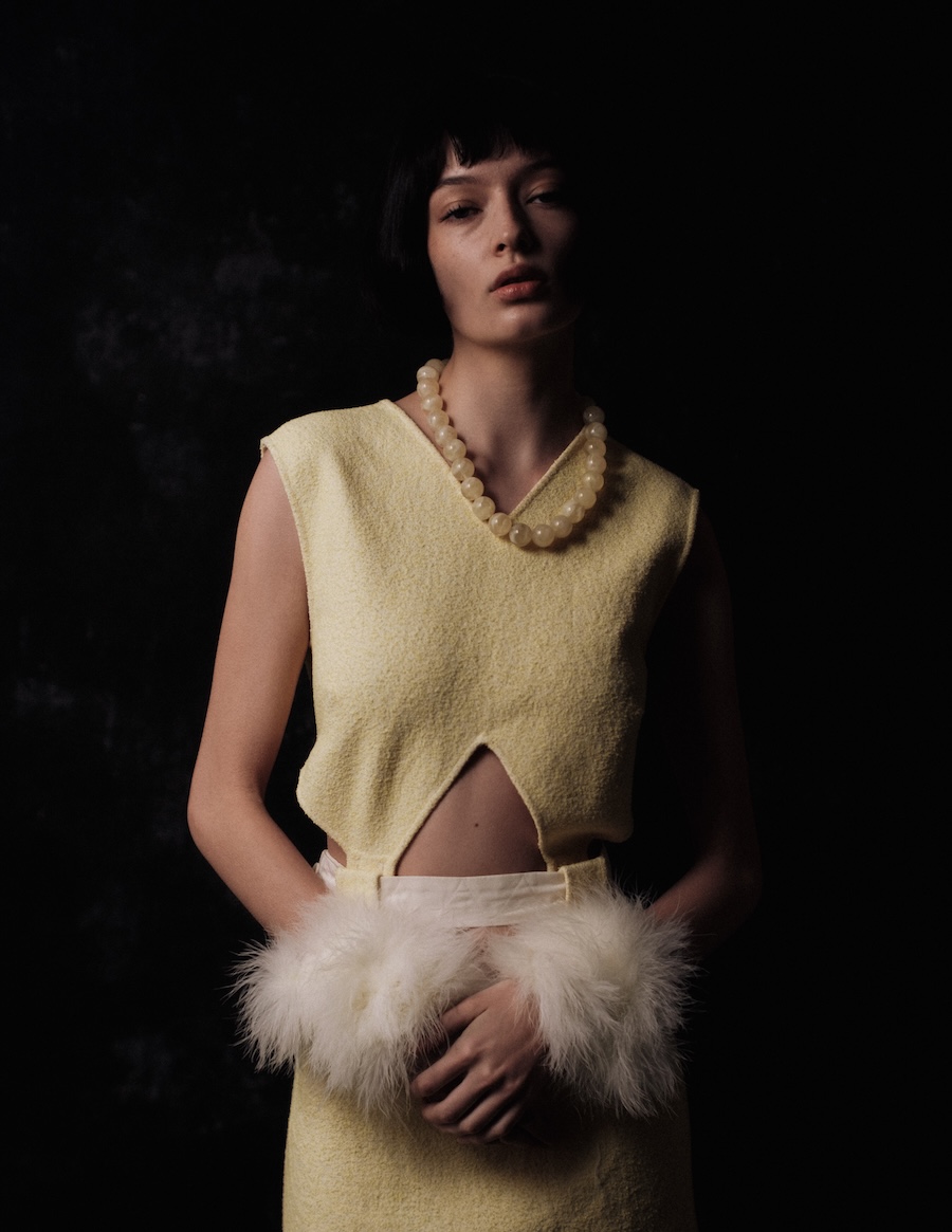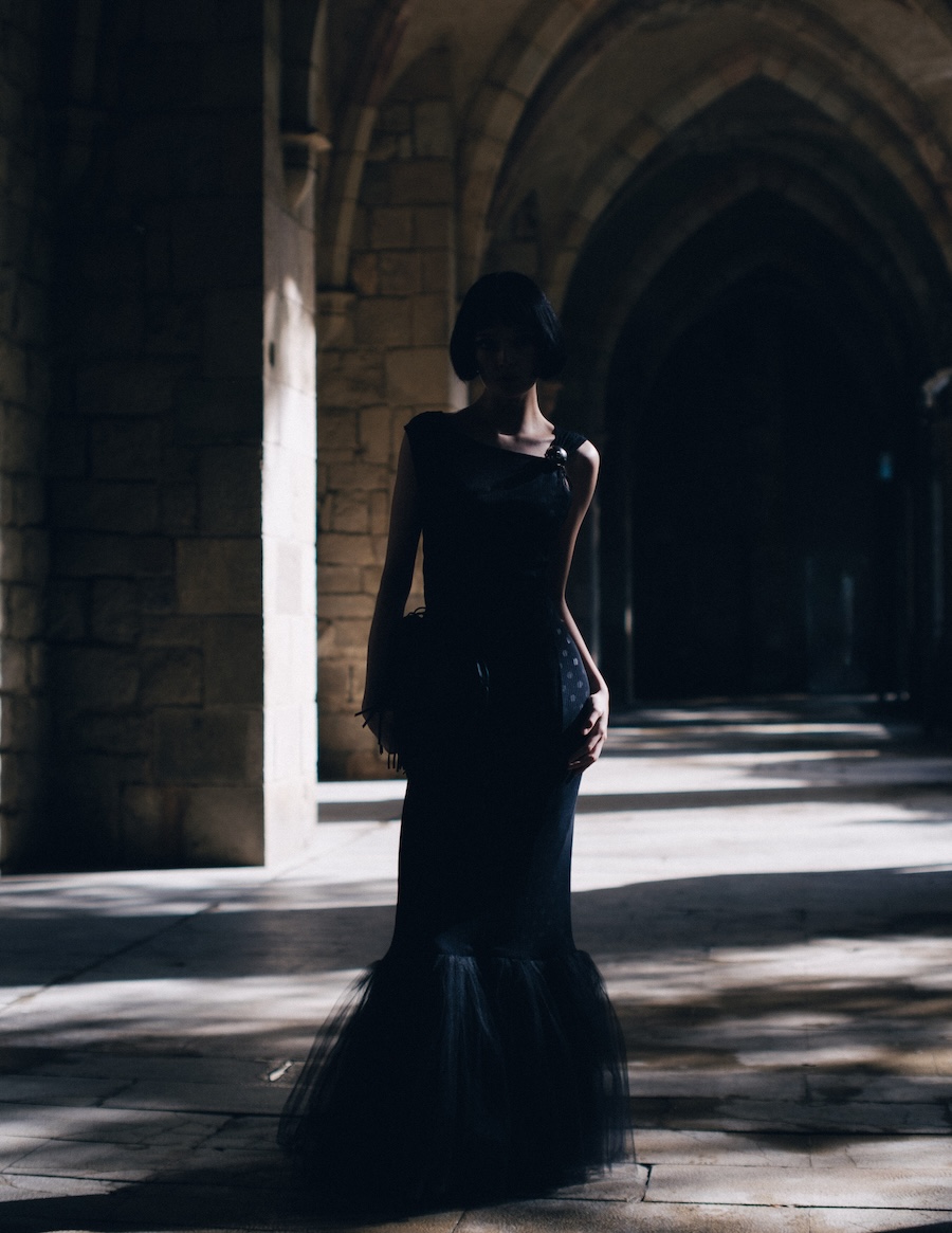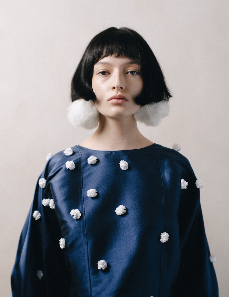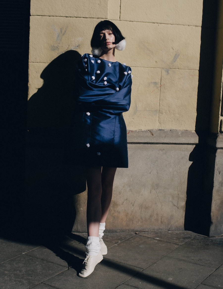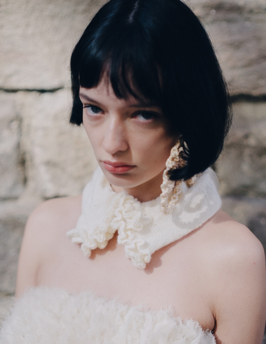The editorial suggests a feminine figure inhabiting worlds in between: a space of introspection, mystery, and ethereal beauty that can be melancholic or powerful, depending on the observer’s interpretation. The incorporation of elements like white pom poms or fluffy fabrics evokes the ephemeral, while structure and geometric cuts introduce a sense of stability and control.