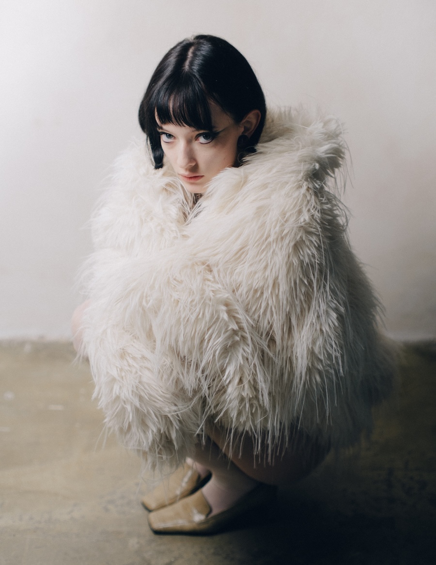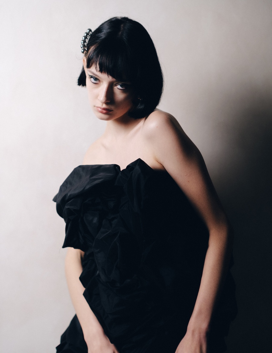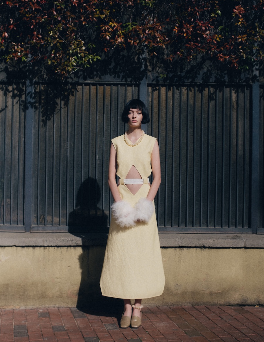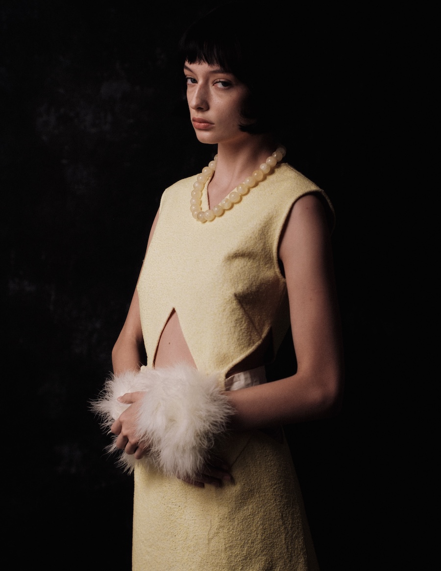 The editorial suggests a feminine figure inhabiting worlds in between: a space of introspection, mystery, and ethereal beauty that can be melancholic or powerful, depending on the observer’s interpretation. The incorporation of elements like white pom poms or fluffy fabrics evokes the ephemeral, while structure and geometric cuts introduce a sense of stability and control.
