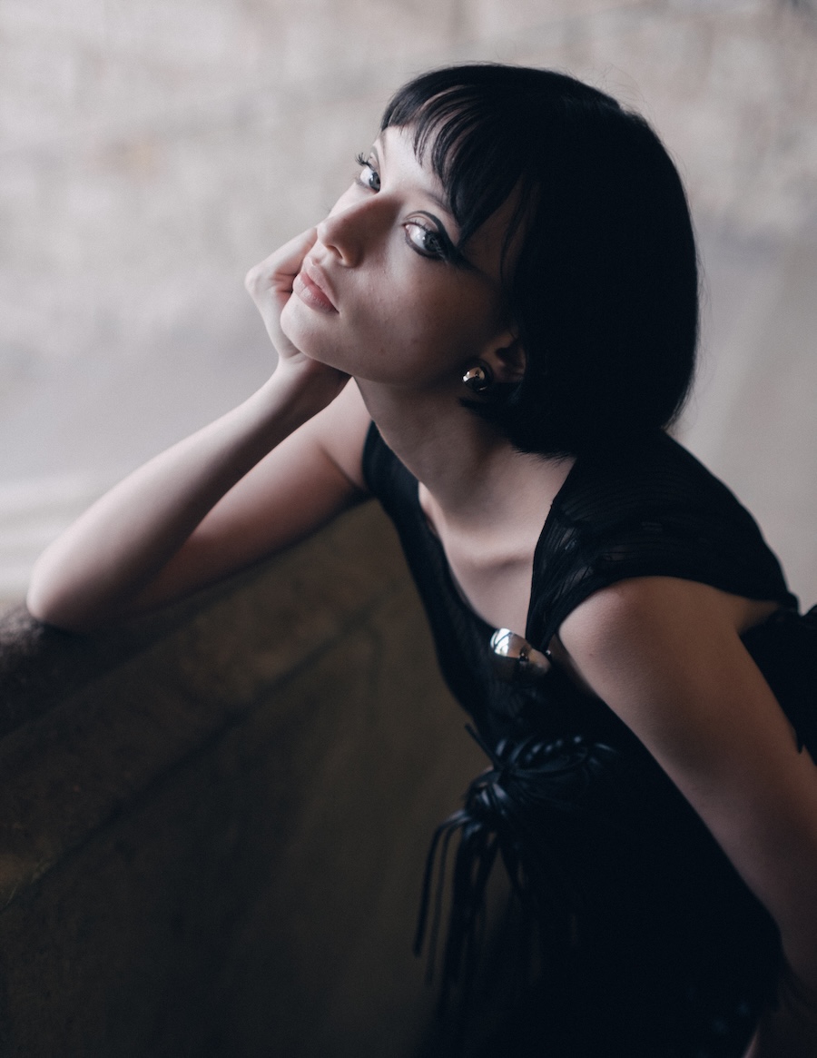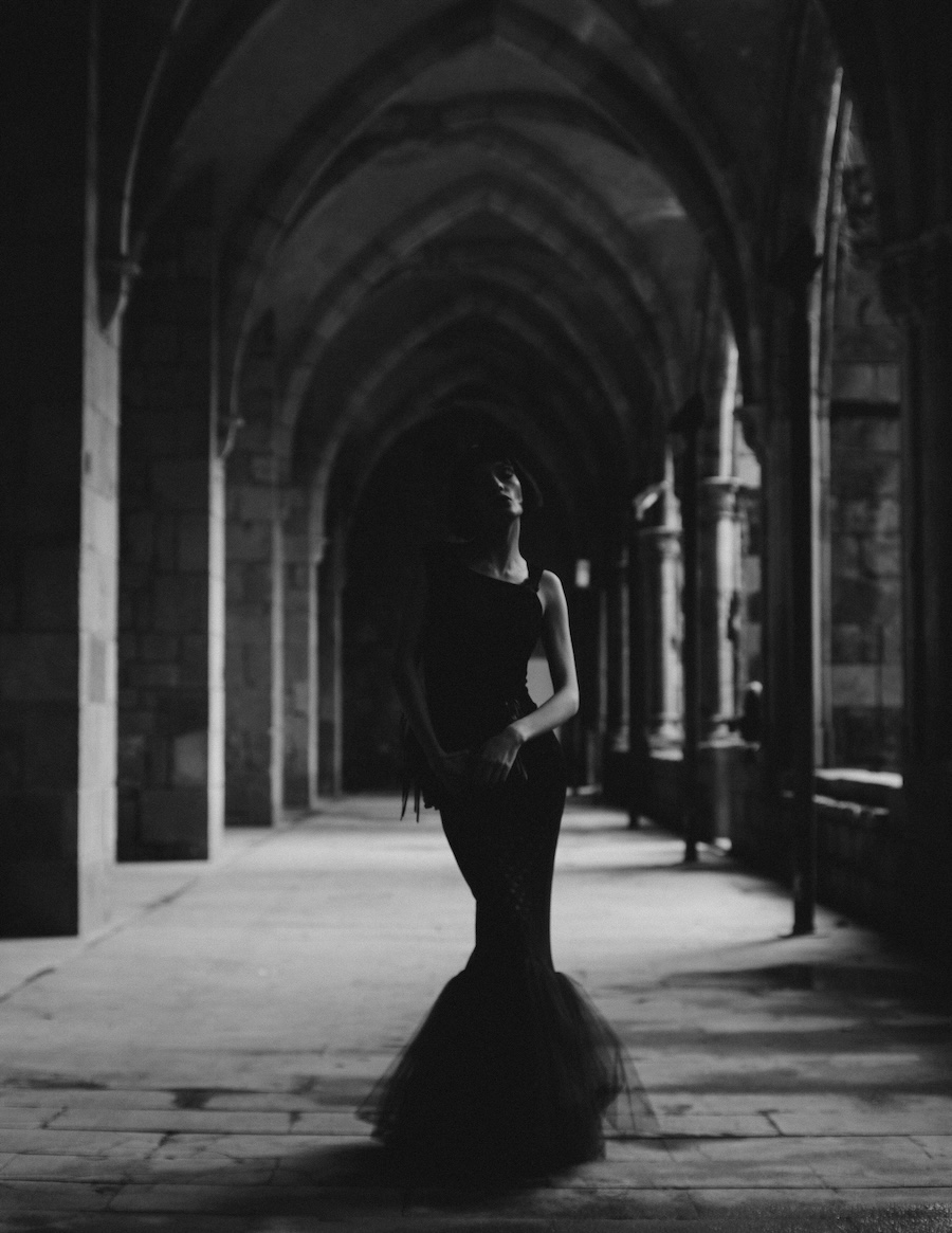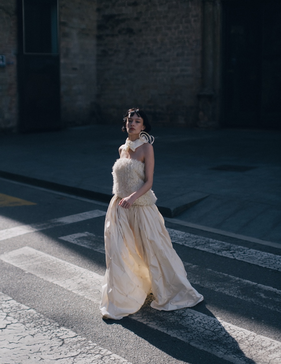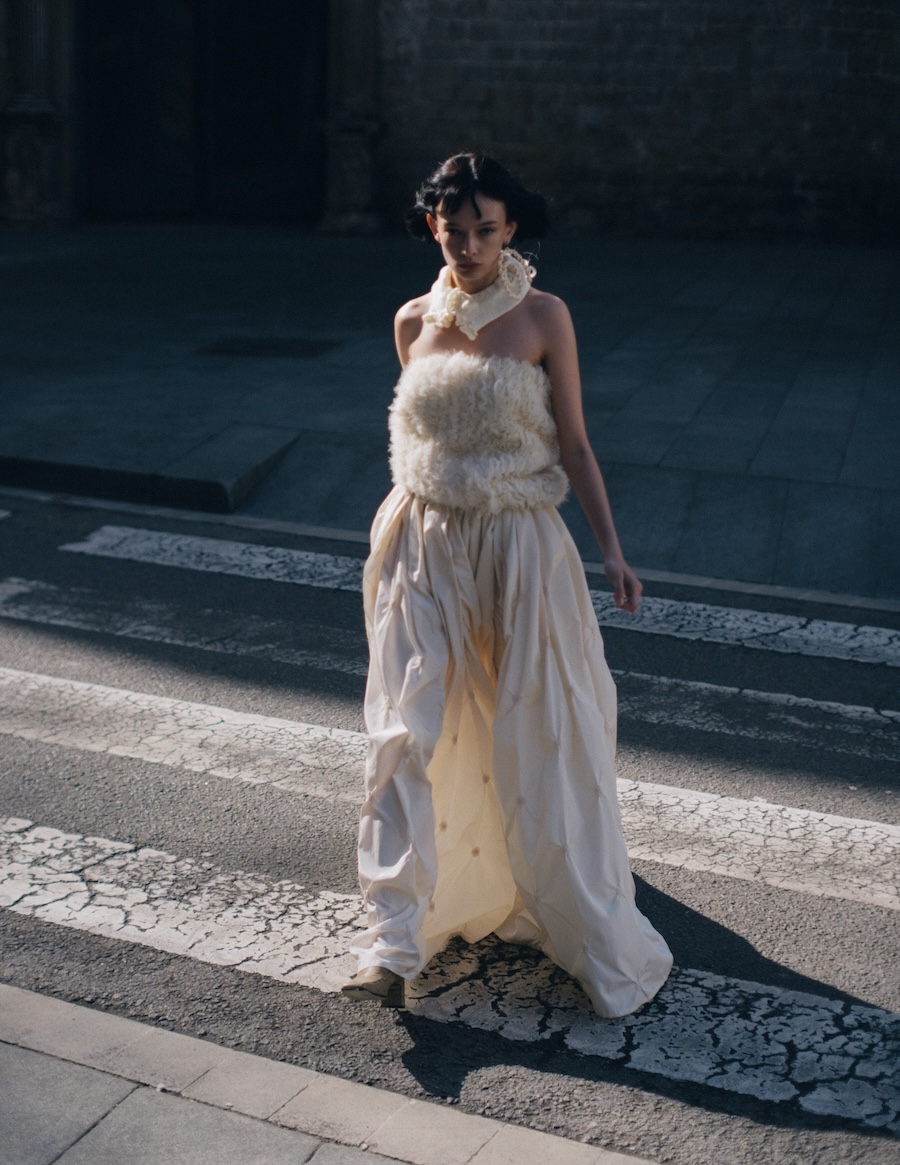 A KALTBLUT exclusive. Photography by Kimmo Halme. The model is Carmen Arenas from One Management. This editorial, titled “Ethereal Geometry,” explores the relationship between softness and structure, utilising garments that evoke a tactile delicacy while maintaining a visually architectural presence. Ornamental details and contrasting textures complement clean, minimalist silhouettes, conveying a message of controlled fragility, as if each piece were a sculptural work of art in motion.