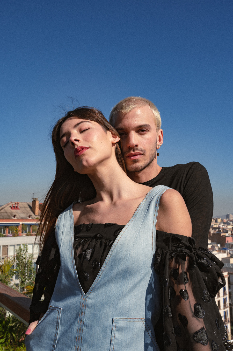 “I wanted to capture the natural movement and flow of Victor’s garments and the models’ bodies in relation to their surroundings, making all 3 elements seem as if designed to coexist from the start. Besides body movement, the eyes played a key role: they express profoundly in every photo, even when closed, adding to the editorial’s ethereal, fantasy-like, and enthralling tenor. The sky, the Barcelona skyline, and the Barcelona Edition Hotel’s spaces, patterns, and details served as background and complements.