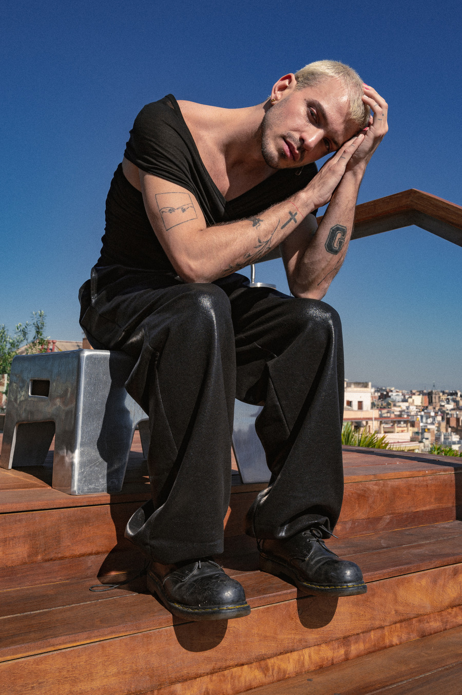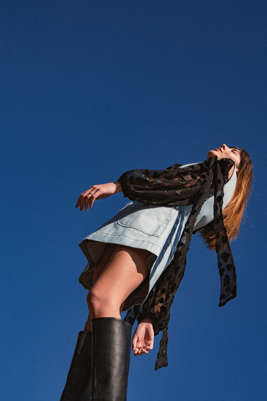 “I wanted to capture the natural movement and flow of Victor’s garments and the models’ bodies in relation to their surroundings, making all 3 elements seem as if designed to coexist from the start. Besides body movement, the eyes played a key role: they express profoundly in every photo, even when closed, adding to the editorial’s ethereal, fantasy-like, and enthralling tenor. The sky, the Barcelona skyline, and the Barcelona Edition Hotel’s spaces, patterns, and details served as background and complements.