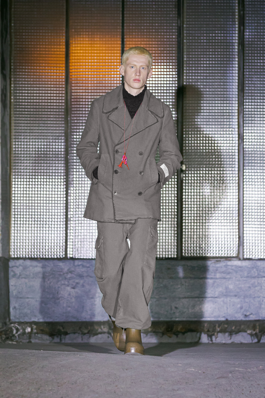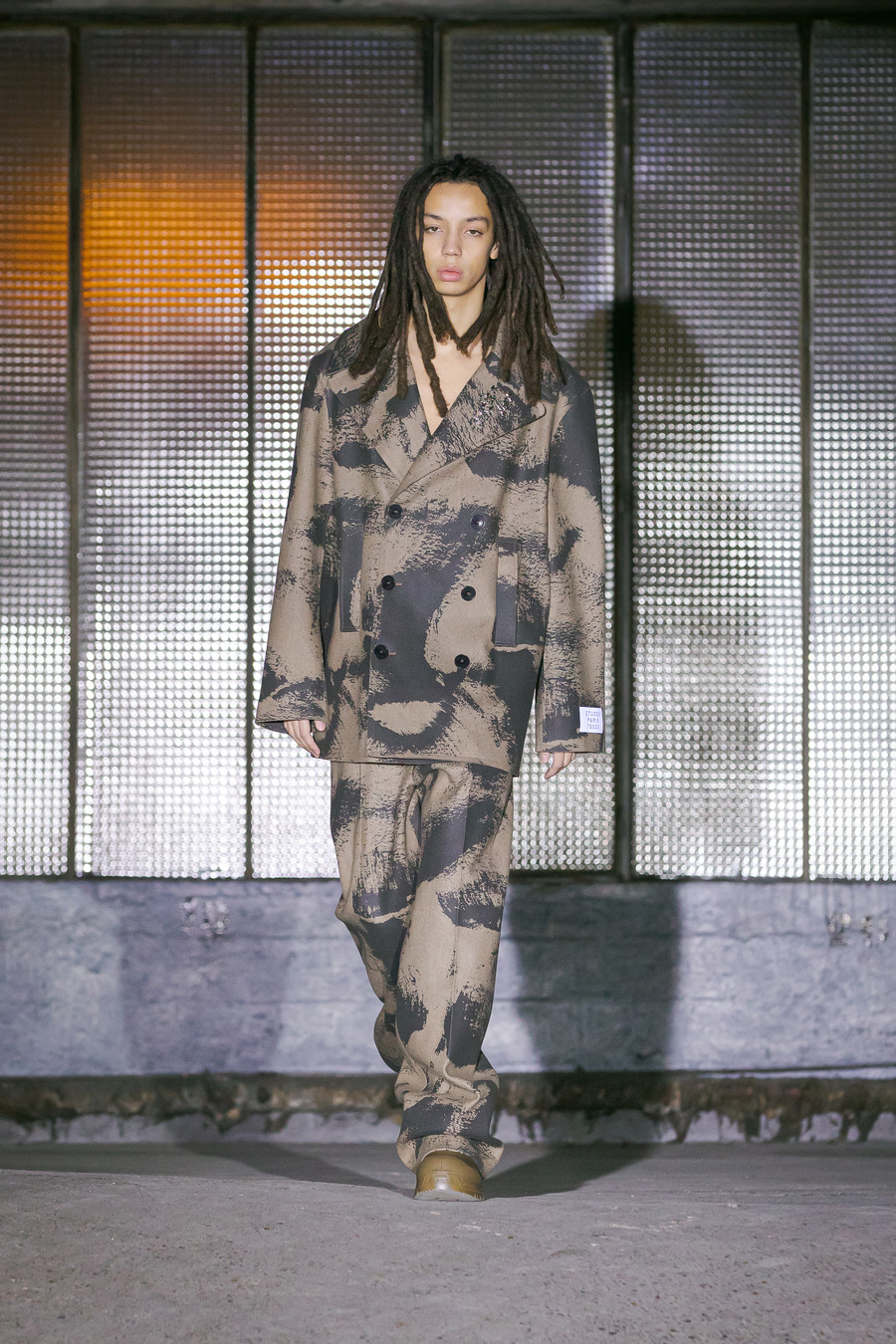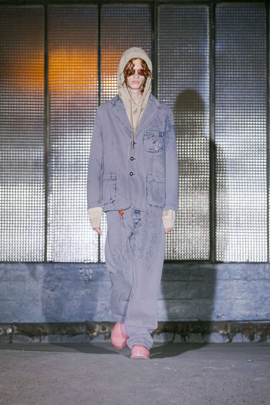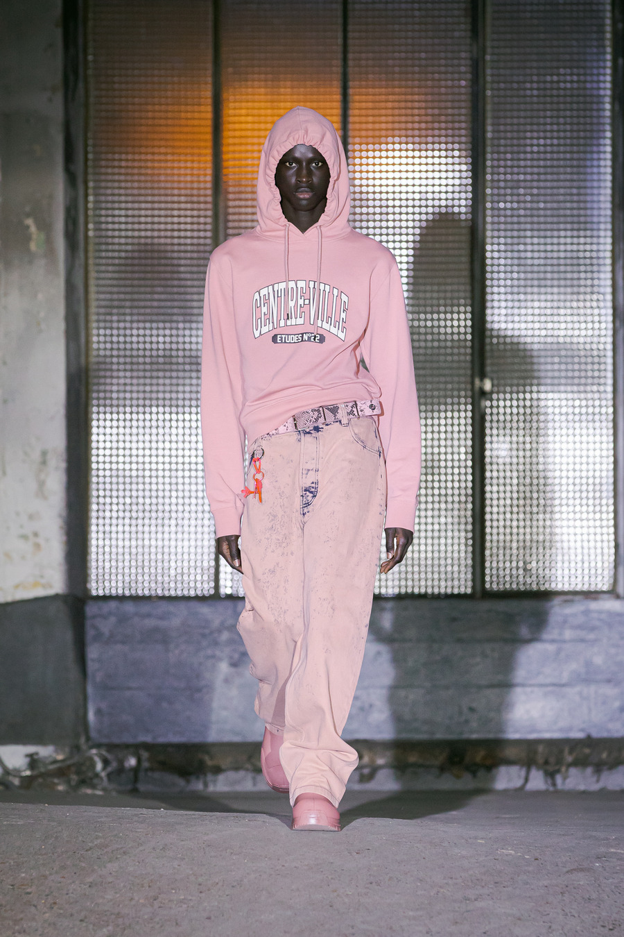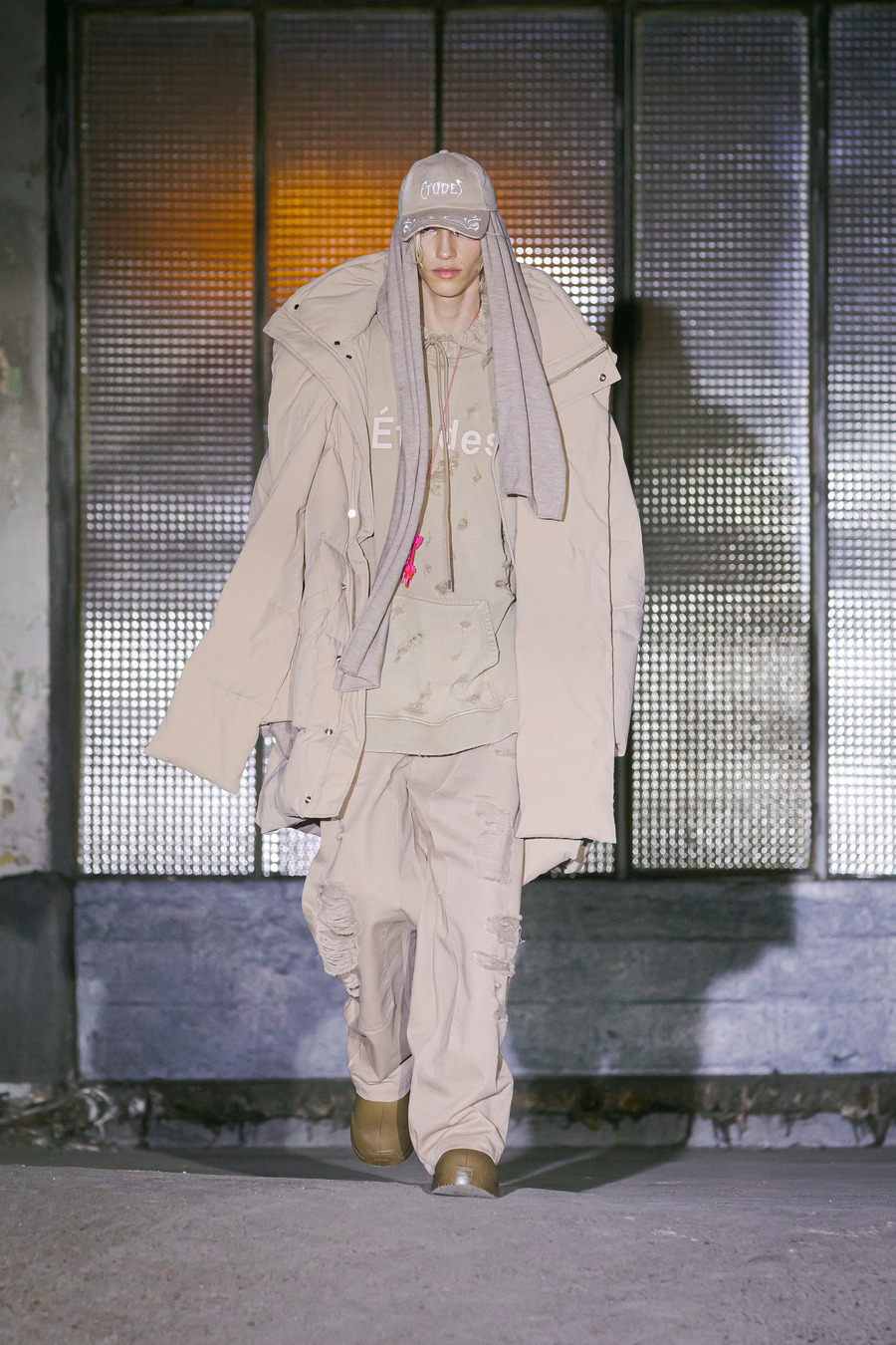 Manifesting in materiality, iconography and the bold proposition of an amplified silhouette, the season’s evolution of the Études vocabulary is fortified by a muted palette that grades through dusty rose and arctic blue to deep green, chocolate, mud, concrete, black and beige. Adopting the archetypes of the masculine wardrobe inextricably linked with city life, the collection is built on tonal harmonies; emboldened by hand and industrial processes from raw-edged tailoring to bleached and destroyed denim.