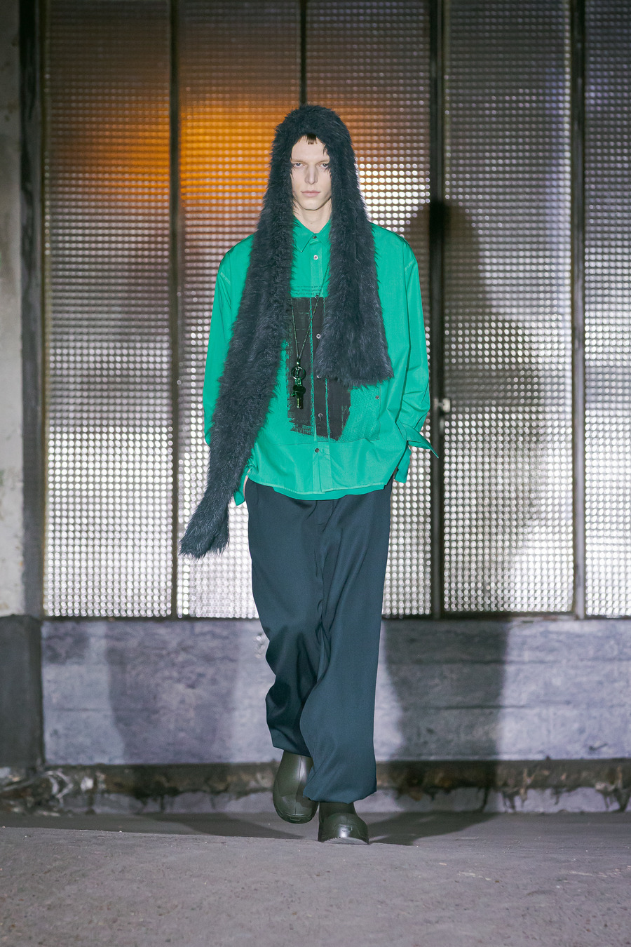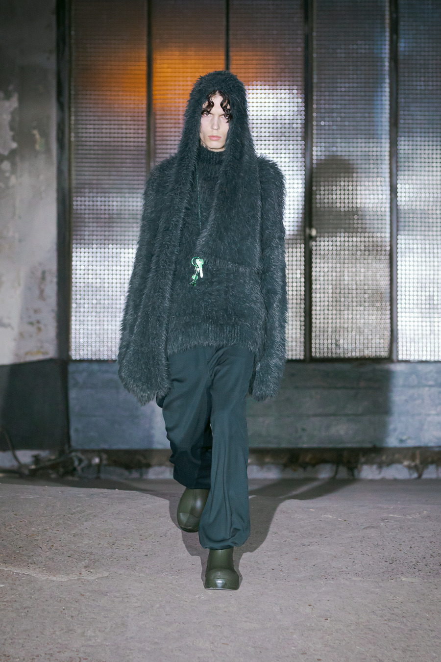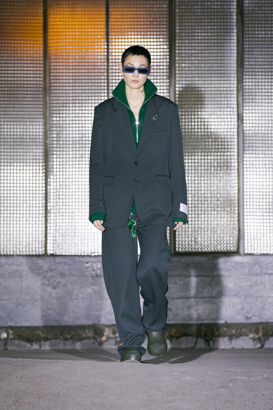 Ample fluid trousers are layered with hybrid mock-neck blazers, double-breasted suit jackets, and fuzzy textured knits.