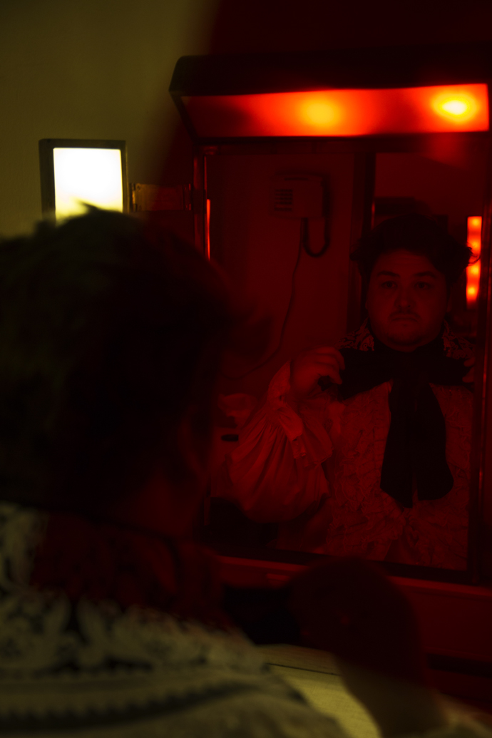 Before I came to Volksbühne, I had no artistic home. I only knew the theatre from a visitor’s perspective and I had always been baffled by the actors’ performances. And at the same time my brain was filled and all my senses were stimulated, so that the nights I spent there continued having an effect on me. In 2014 Marc Hosemann asked me to guest star in the play “Baumeister Solness” and Frank Castorf really liked the idea. First I was only supposed to take on the role of Ragnar but then an actress dropped out, because the fell sick and I took her place, playing the wife of Solness. Bert Neumann, who was the set and costume designer, had the idea for that. Looking back, that was my favourite role. People were gasping when I appeared onstage in costume for the first time during a rehearsal. After that I played Alijoscha in Castorf’s Karamasow. That was a ride! It premiered at the Wiener Festwochen. The rehearsals with Castorf are really tough. But you can get used to it. When I became part of his fantasy, indulging myself in the great matters and texts together with those incredible colleagues, I know something extraordinary is in the happening… I really love my colleagues! I feel like we’re some team of superheroes led by a mad man. At Volksbühne I was Mrs. Solness, Aljoscha Karamasow, the traitorous foster son, who transforms in Moliere, I played Castorf’s theatre director in Faust and when I stood in for a colleague during the last Castorf premiere, I teamed with the prompter. Last but not least I got to perform this amazing text by René Pollesch. We had such a great night with Service/ No Service that I sometimes still like to quote the text in everyday life. And now we’re all parting. It will take some time until I’ll fully grasp what’s been happening to me during those 3 years.
