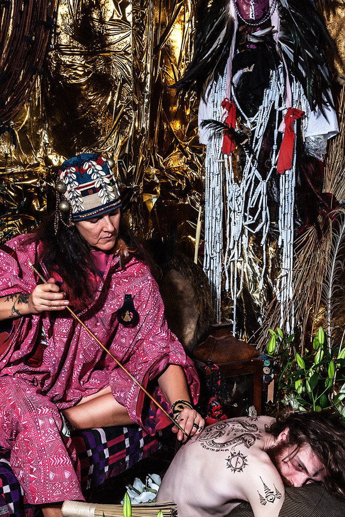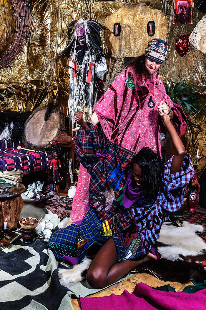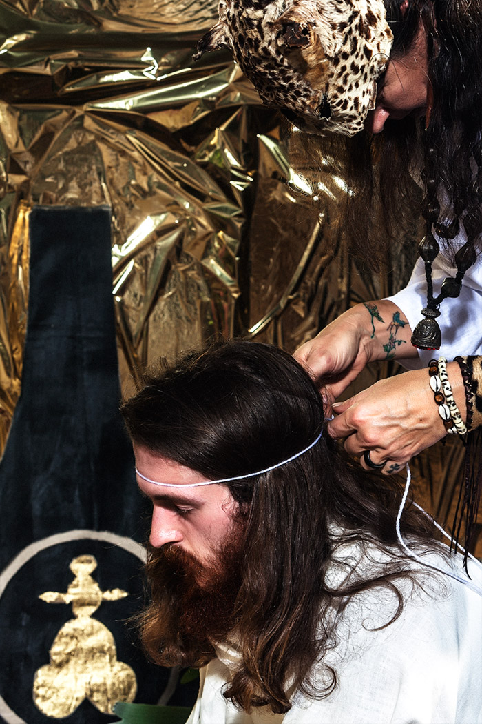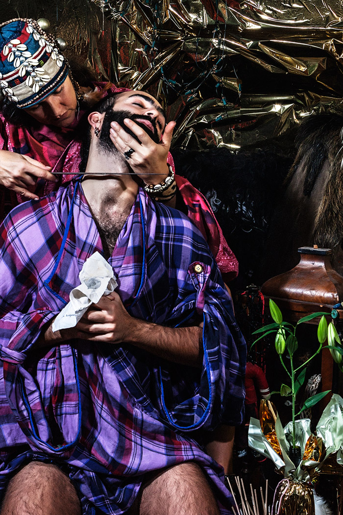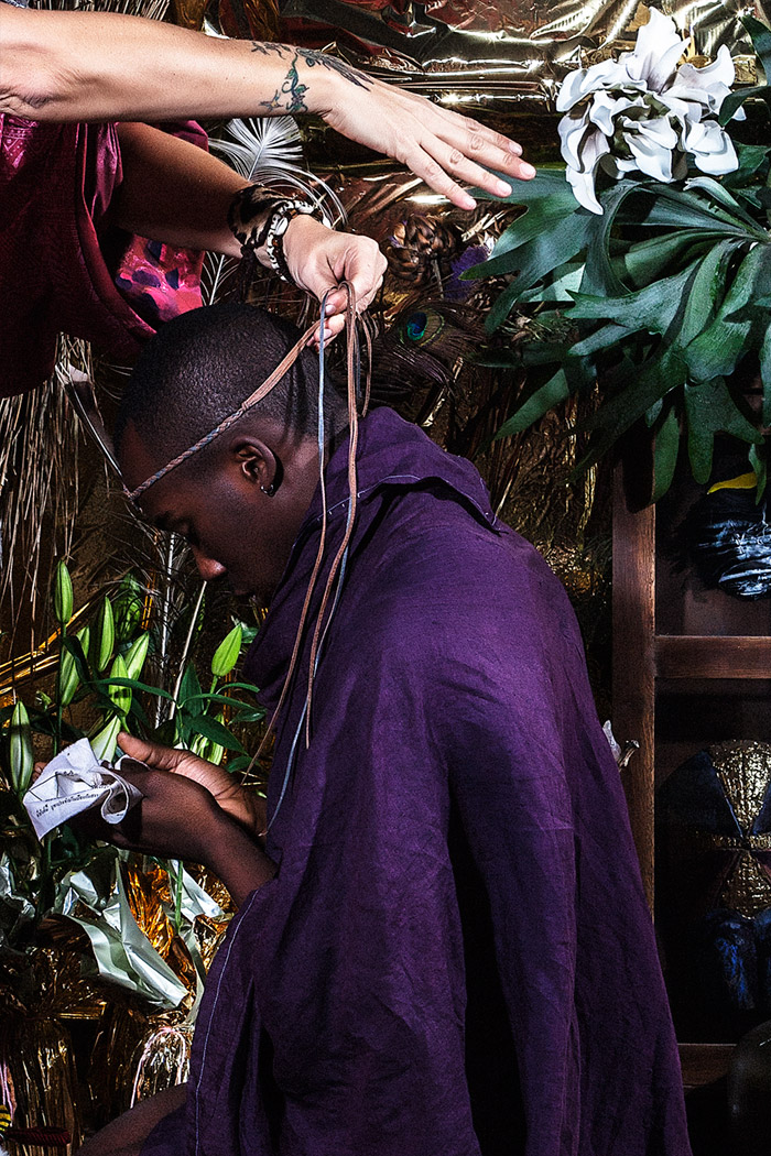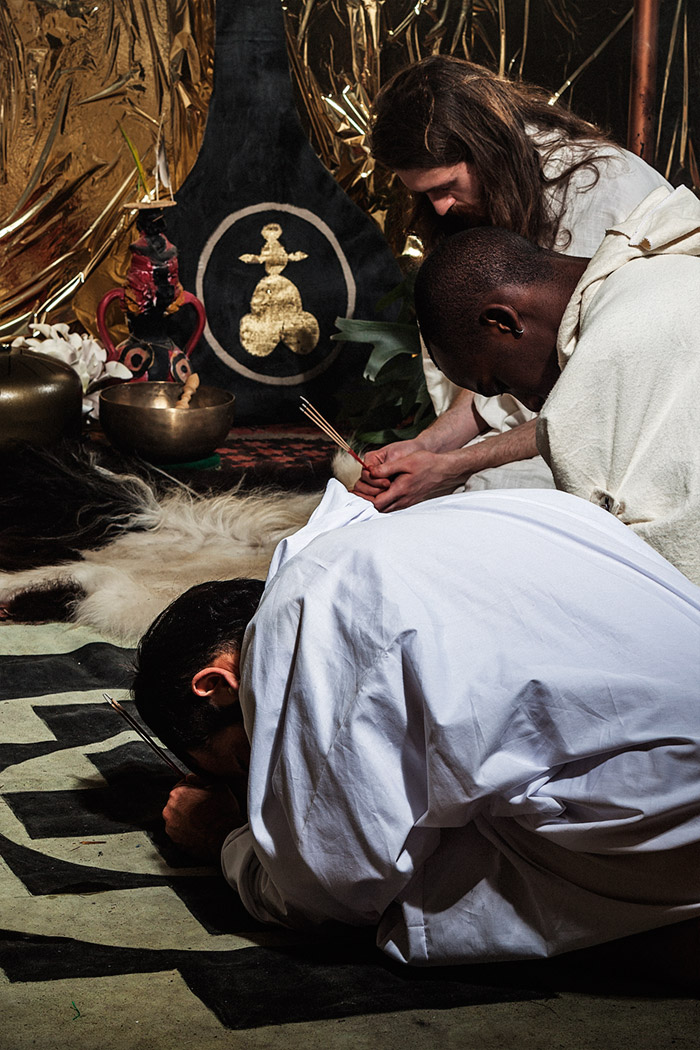 A KALTBLUT exclusive. Photography by Tatchatrin Choeychom. Models are Chantal Loonen, Joe Chastney, Cherish Menzo, Christiaan De Donder, Merdan Akbayir and Jacko Schouten. fashion: Dali Lama’s Pajamas collection designed by Kevin Power. Tatchatrin Choeychom is a Thai photographer based in Amsterdam. FAITH is inspired by Yantra, a tattoo ritual from Thailand, and focuses on the value of tradition, personal identity, trust and respect. In this reportage with a fashion twist, various elements of different cultural rituals were combined on purpose. By not referring to one ritual in specific, the contrived set of ‘FAITH’ underlines the general urge of individuals to participate in joint rituals no matter where you live or what you believe.