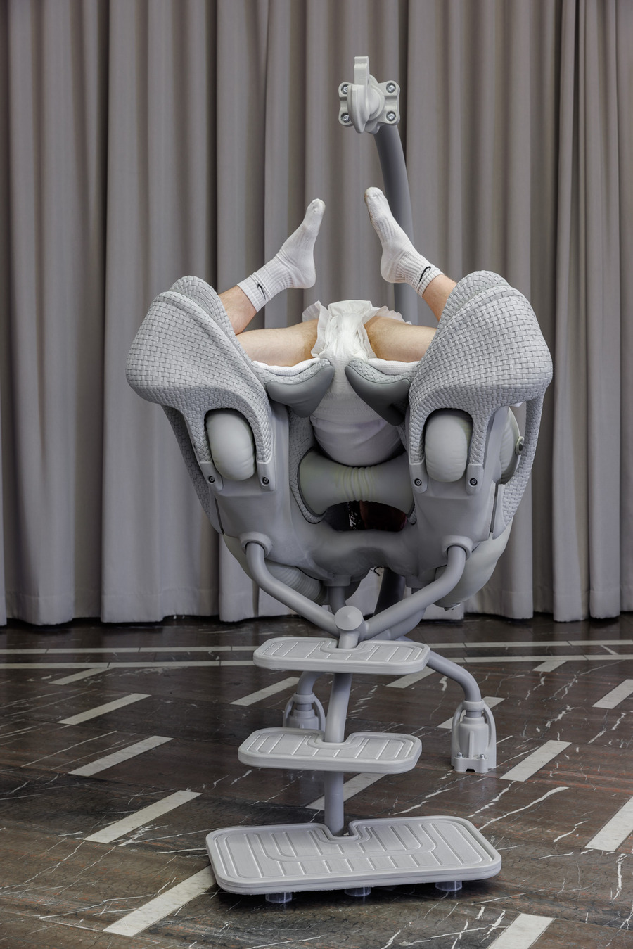 Who owns our bodies, our minds, and our data? The performers’ poses, executed as a state of mindless flow, become representative of our behaviour, in which we hand over control to user-friendly technologies, algorithms and targeted advertising on a daily basis. The performers’ outfits are inspired by the kink subculture practice of Paraphilic infantilism (adult baby syndrome) – testifying to a desire to return to a submissive, childlike state.