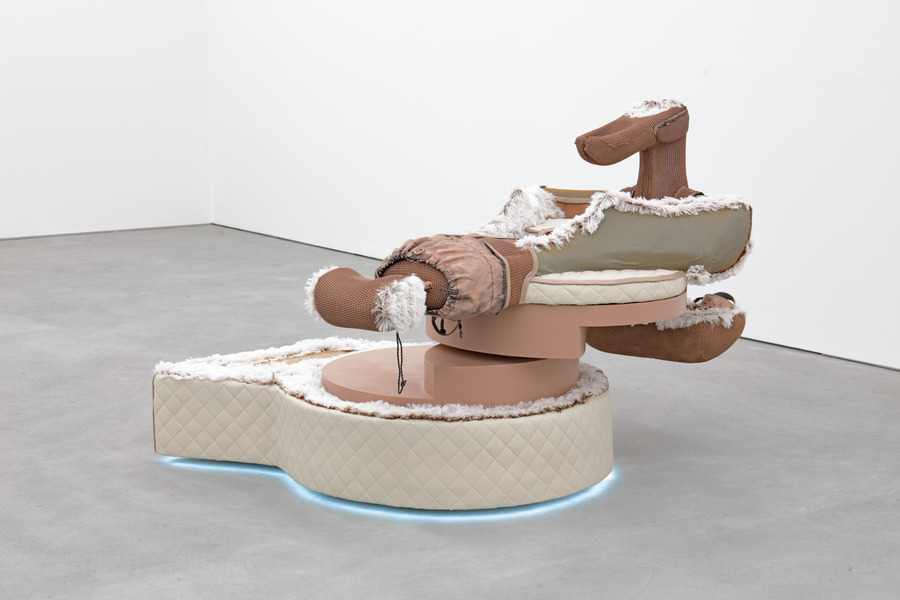 The sculptures, whose surfaces are produced in a 3D printing process imitate materials of these facades – brushed stainless steel, rattan, “skins” or veneer – in this way themselves become “fake” of their own materiality. The view from FAKE-ESTATE thus becomes a unique stage for Anna Uddenberg’s exhibition in which the performers give up their ultimate “assets”, their bodily autonomy and, eventually, their “Self”.