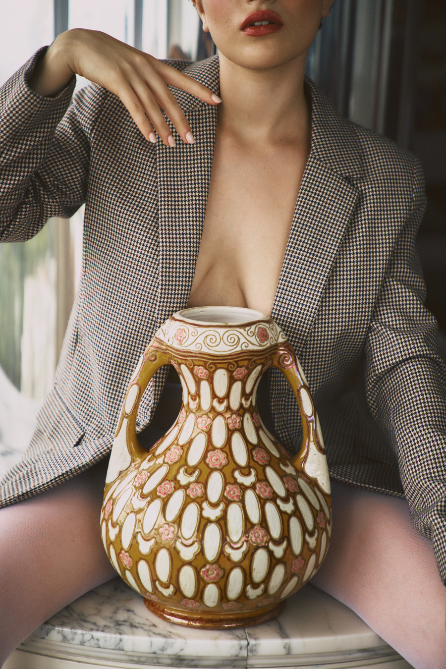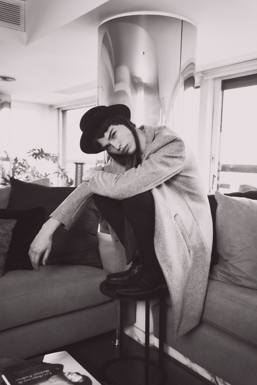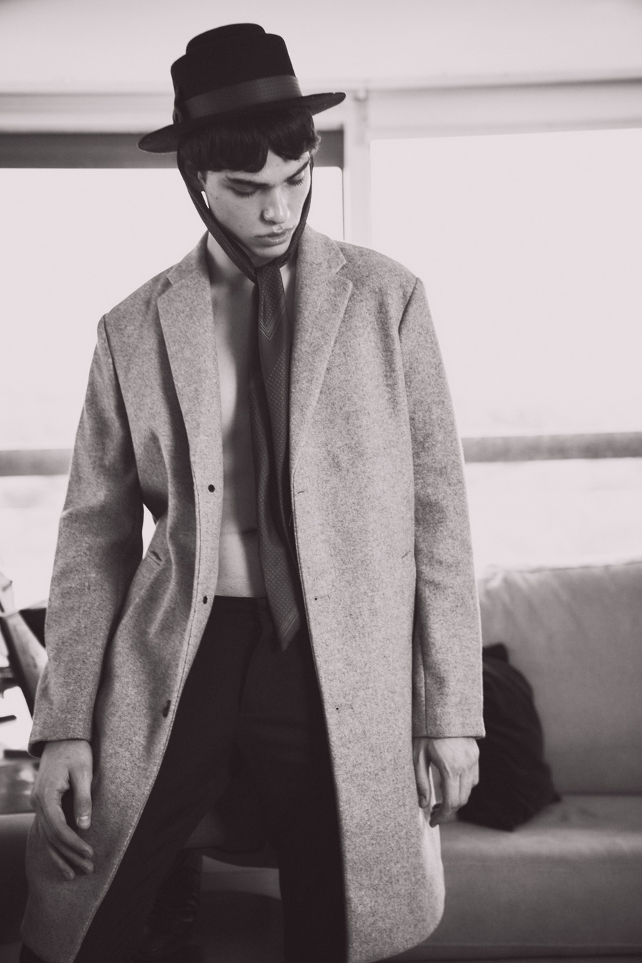 Models are submerged into authentic designs, at the Workshop of a hat maker; posing and enjoying themselves. Suddenly something strange happened. Max is surprised by a mysterious appearance. Characters are represented by colours. White – the angel, black – the death, red – the demon.