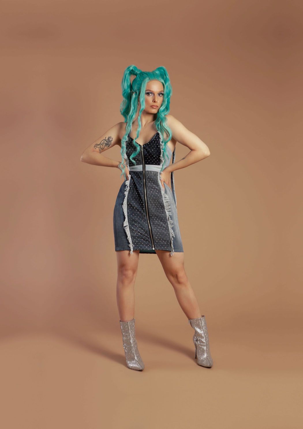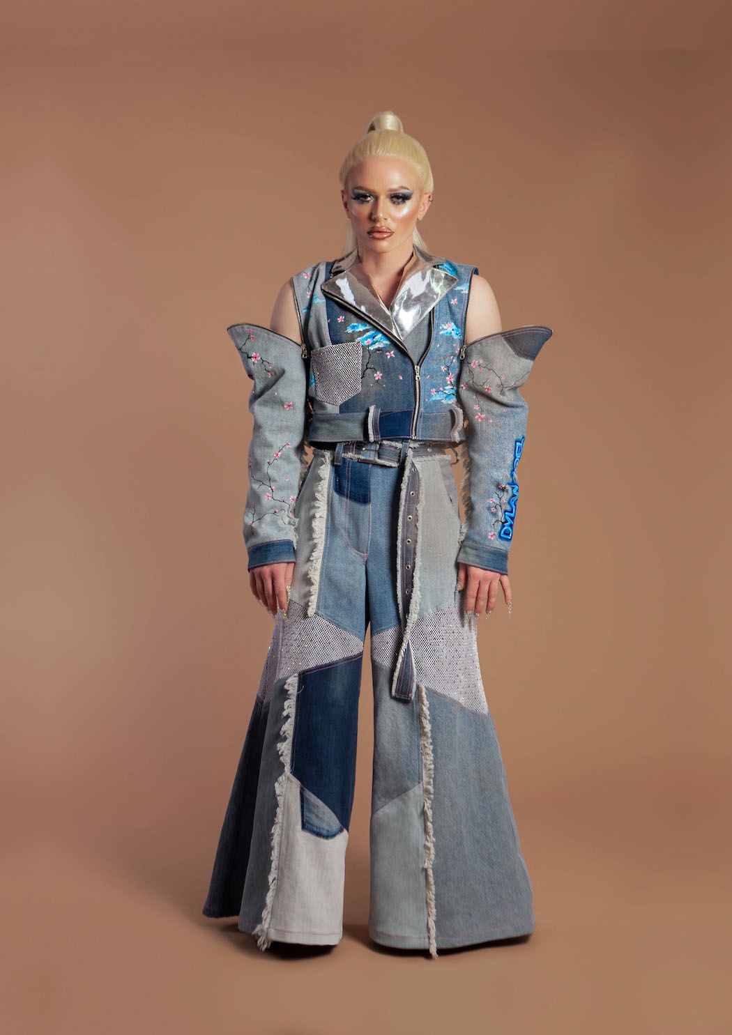 Designer Dylan Joel S/S21 collection blinds us with a sense of nostalgia. Tapping into the sounds and visuals of the nineties, Dylan Joel found inspiration in the light-hearted animations films by Studio Ghibli, bringing the stories to life in exaggerated shapes from flares made entirely from second-hand fabrics to his signature visors dipped into an abundance of Preciosa chrystals.